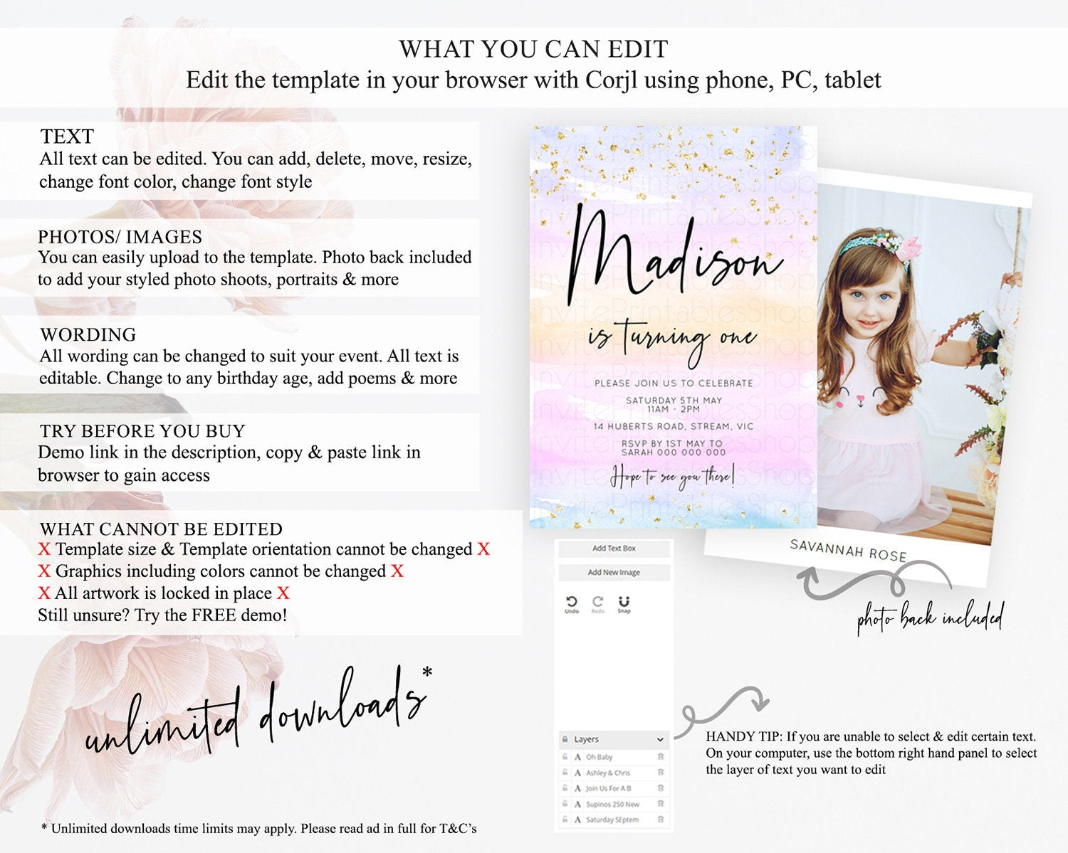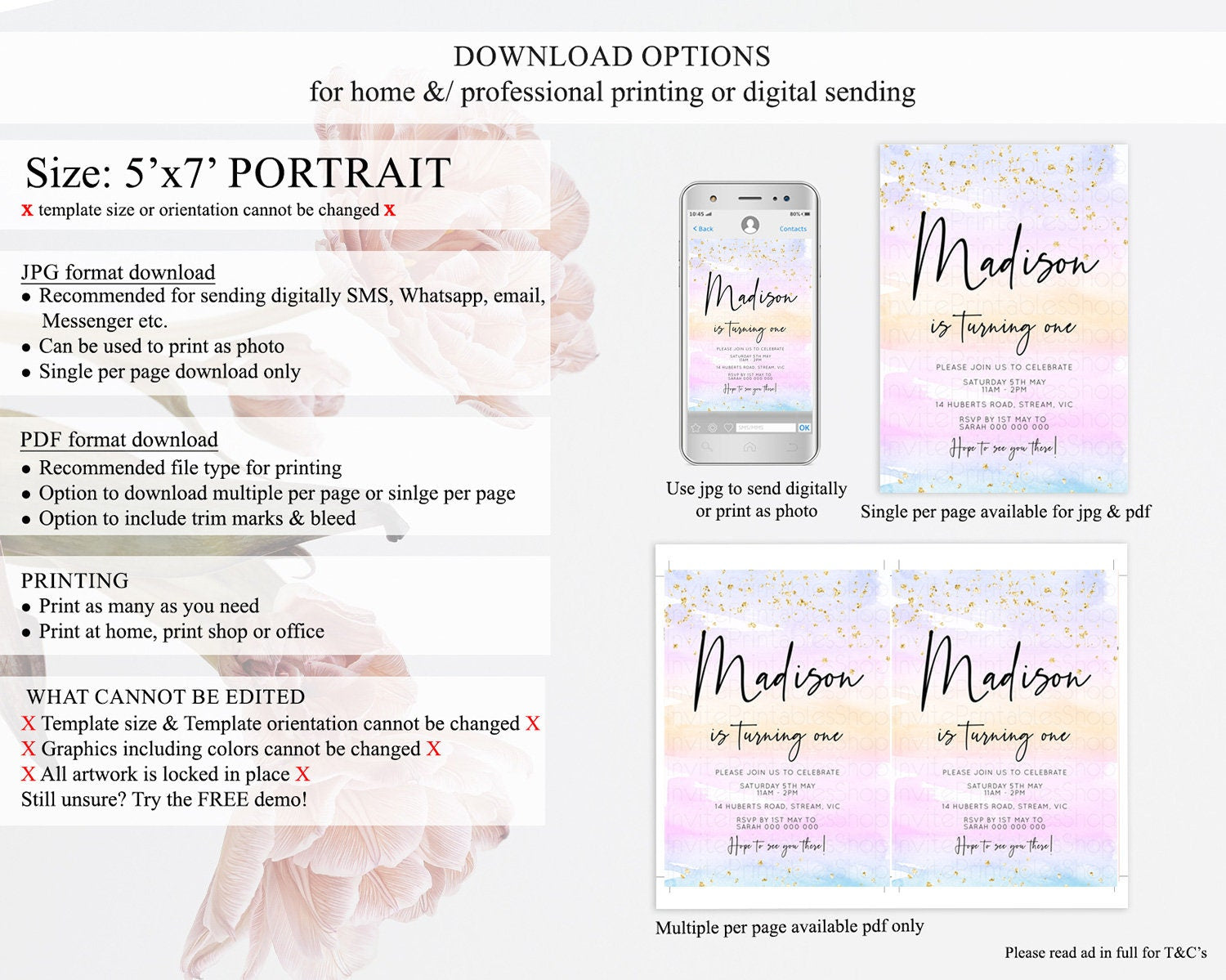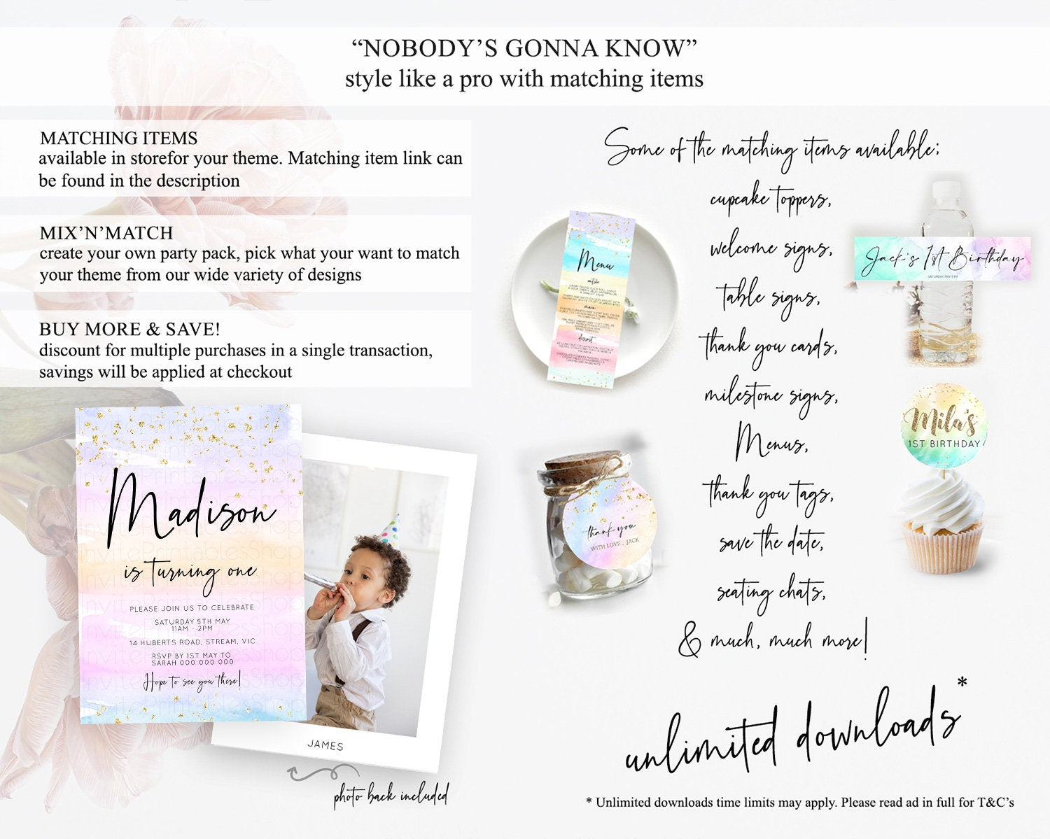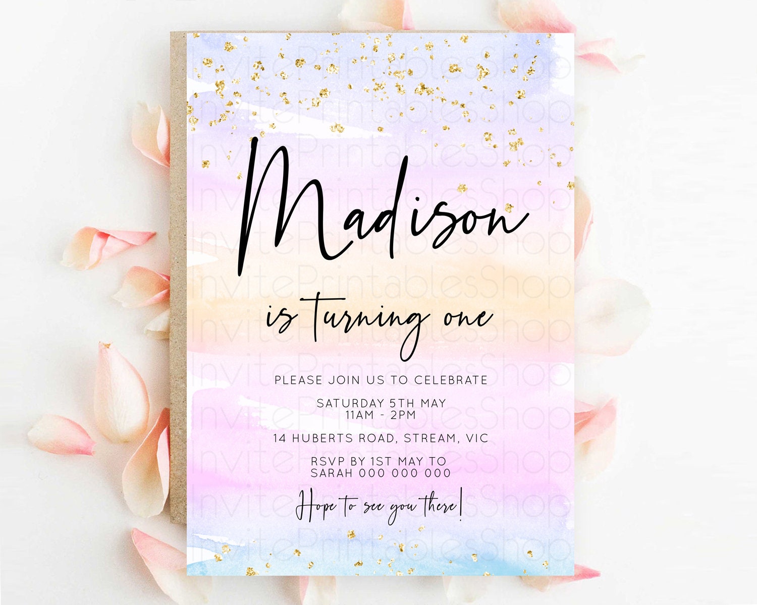 Rainbow Birthday Invitation Colorful Pastel Watercolor Invitation Gold Glitter Sprinkles Ombre Pastel 1st 2nd 3rd Birthday D10594