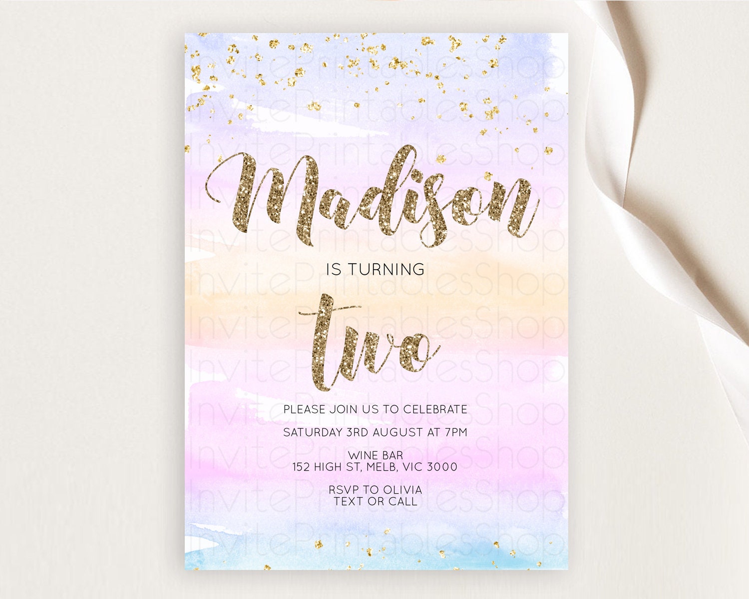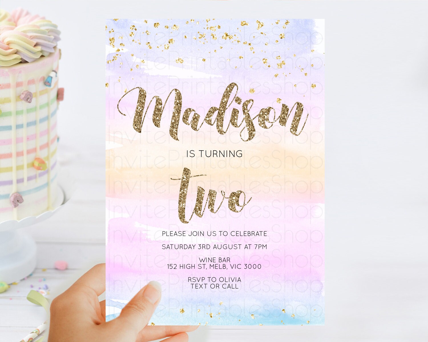 Rainbow Birthday Invitation Colorful Pastel Watercolor Invitation Gold Glitter Sprinkles Ombre Pastel 1st 2nd 3rd Birthday D10595