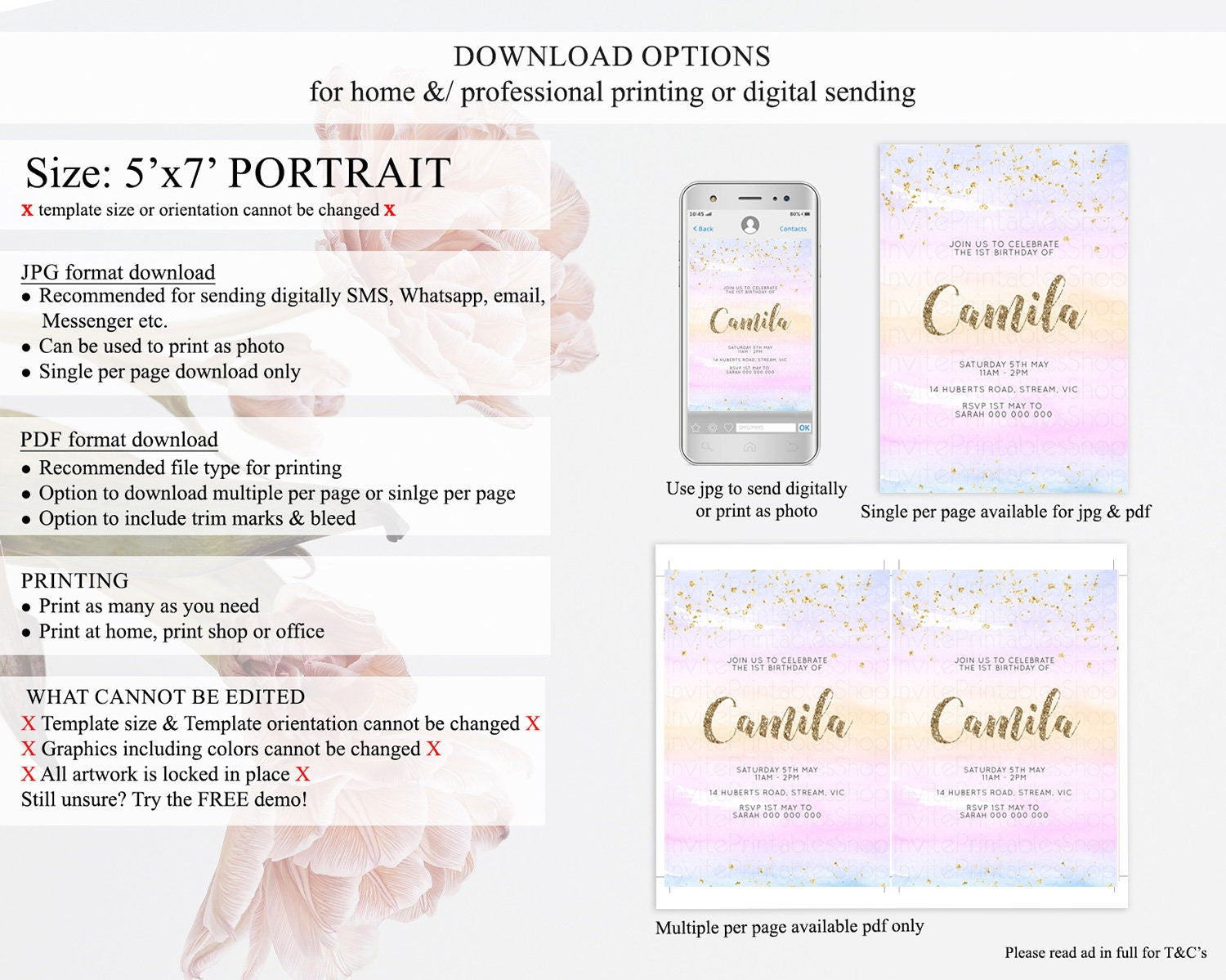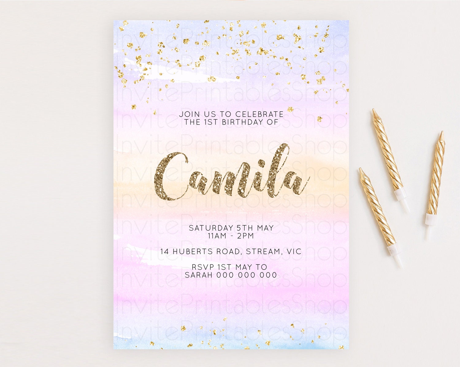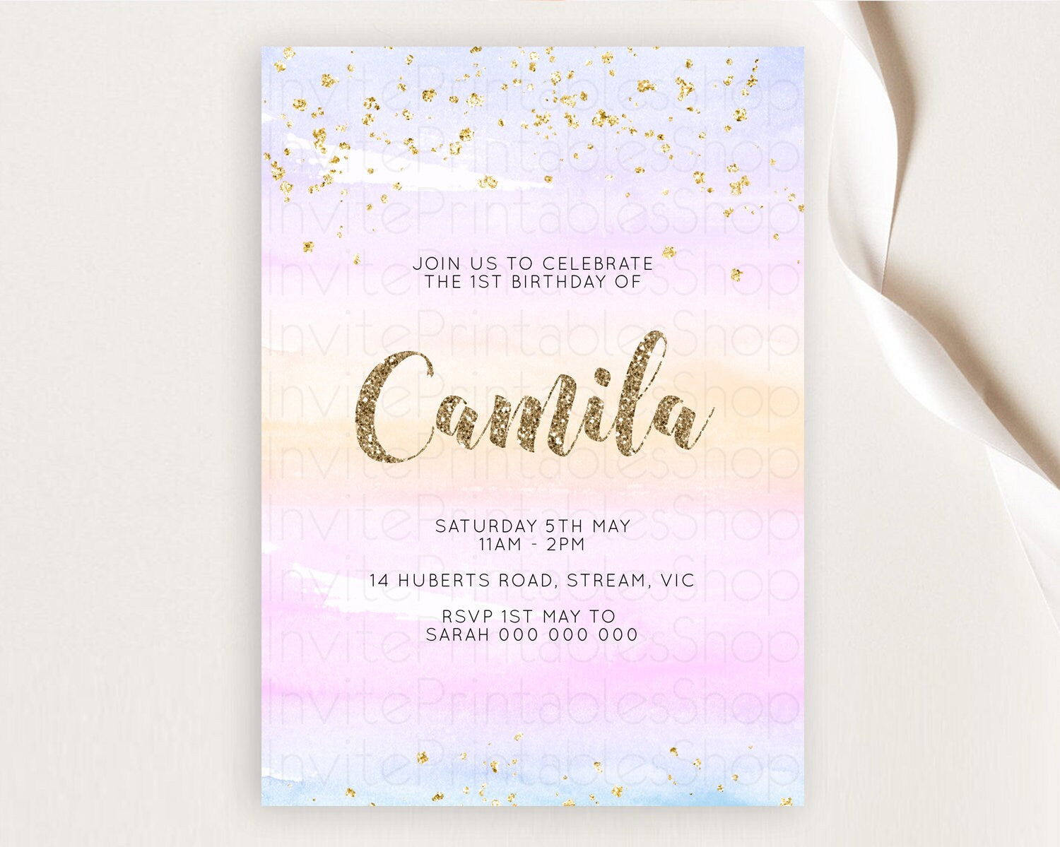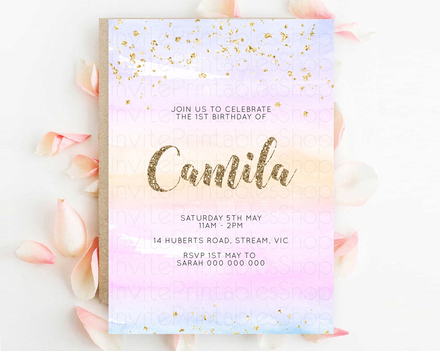 Rainbow Birthday Invitation Colorful Pastel Watercolor Invitation Gold Glitter Sprinkles Ombre Pastel 1st 2nd 3rd Birthday D10595