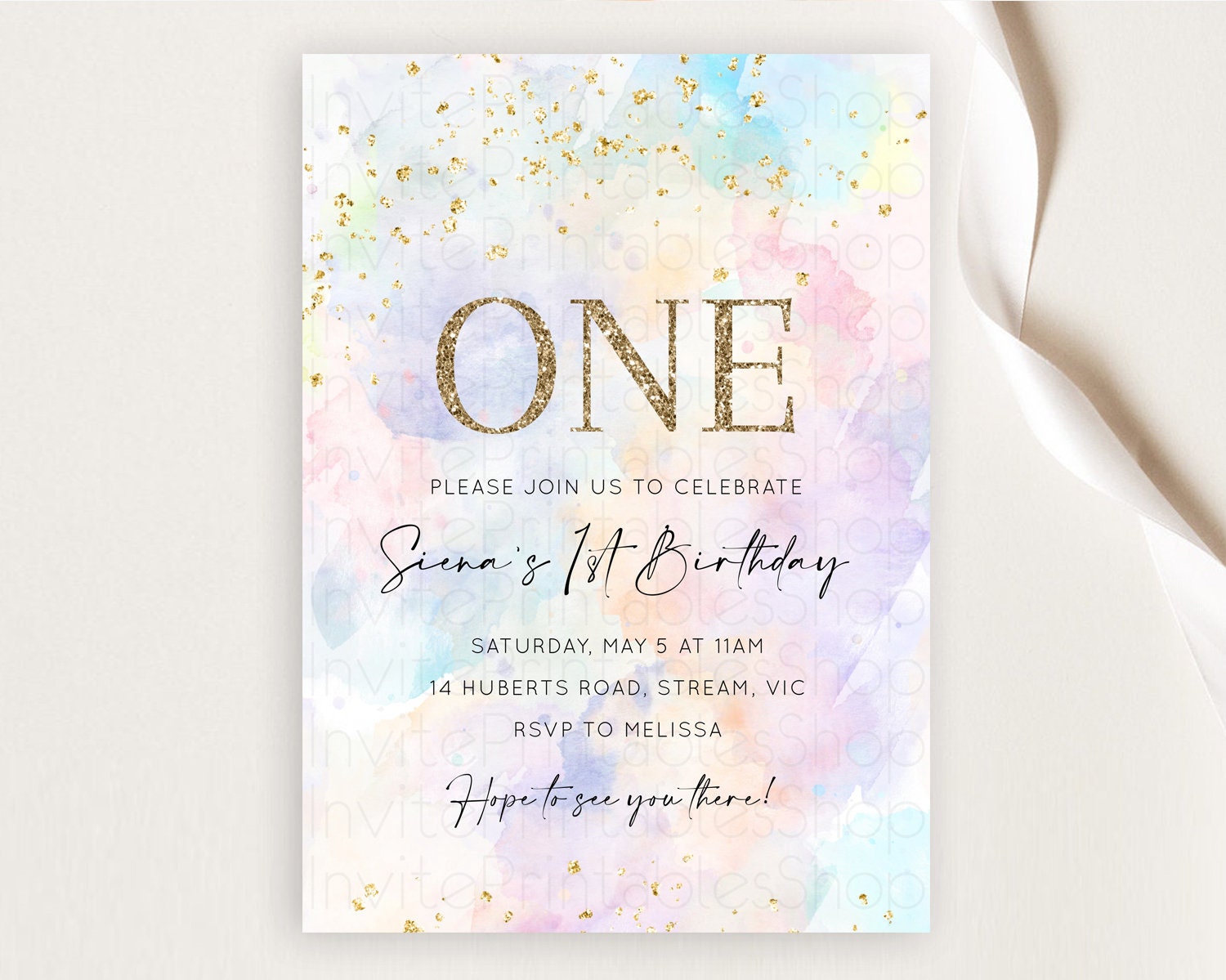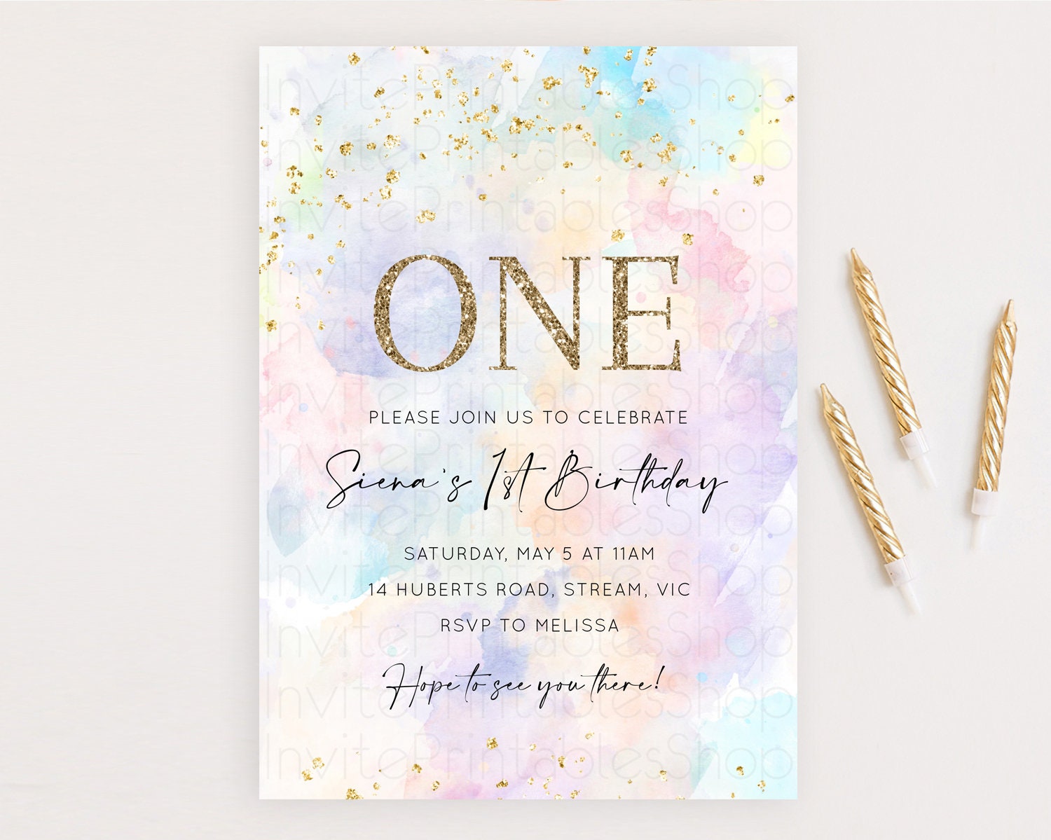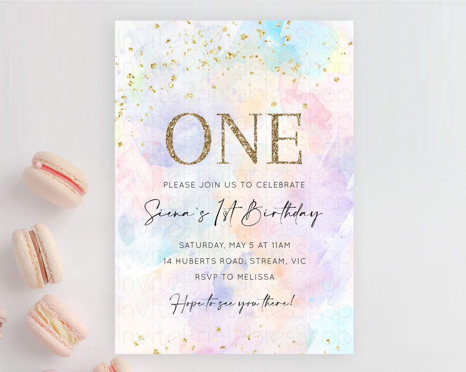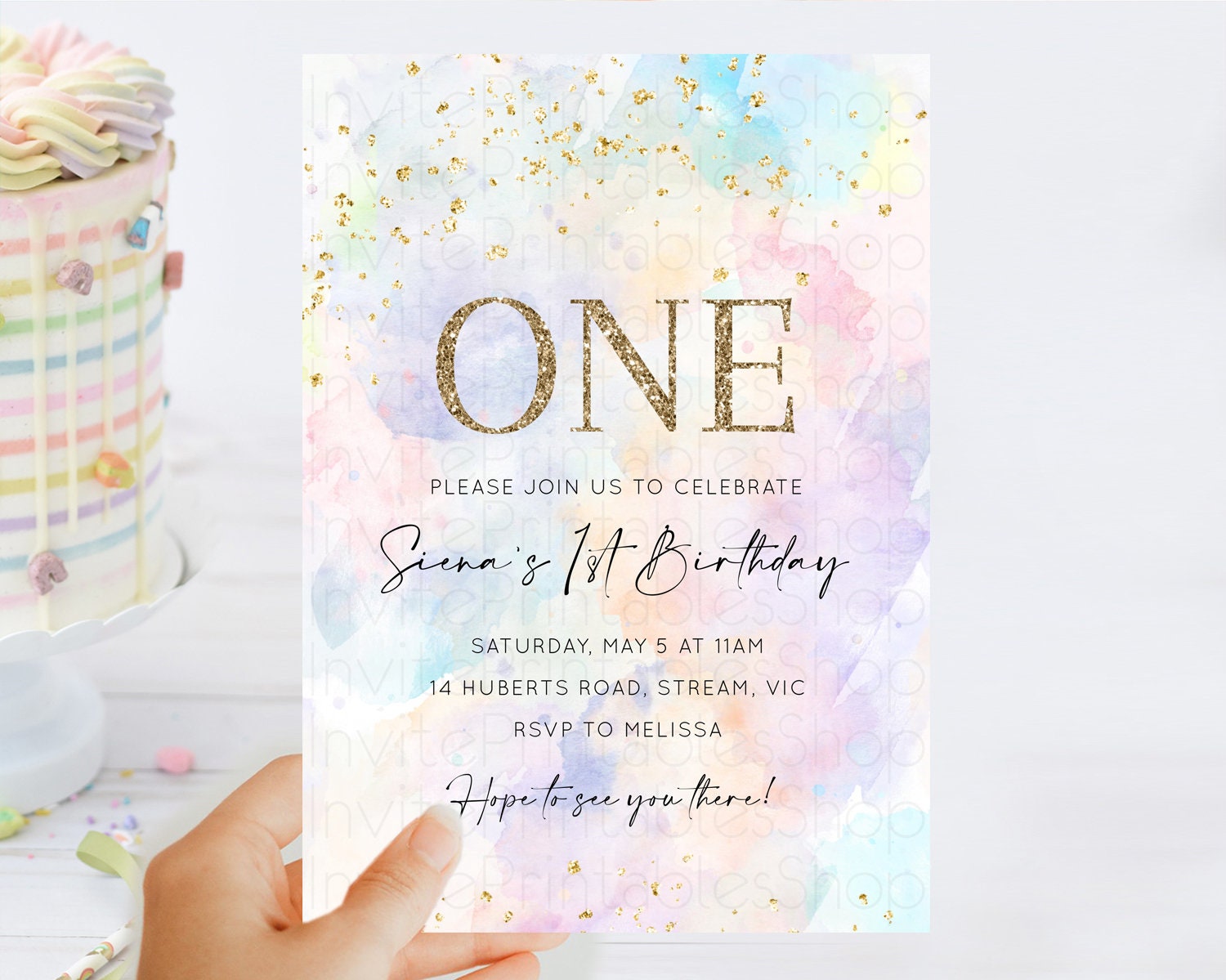 Rainbow Birthday Invitation Colorful Pastel Watercolor Invitation Gold Glitter Sprinkles Ombre Pastel 1st 2nd 3rd Birthday D10605