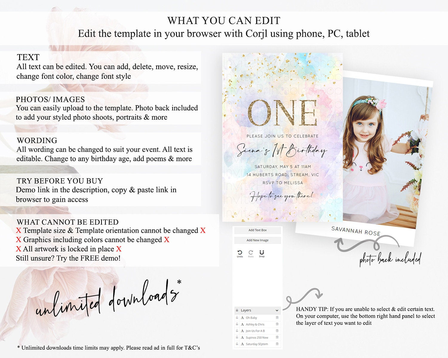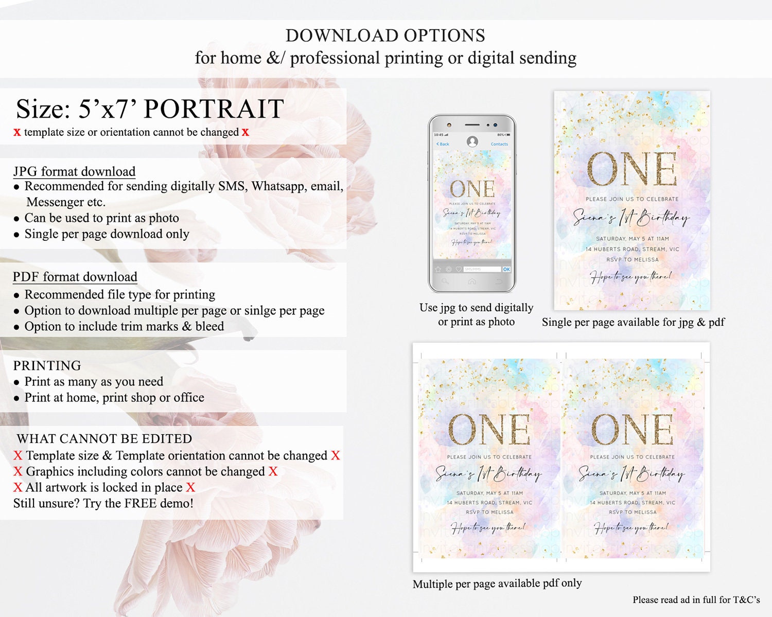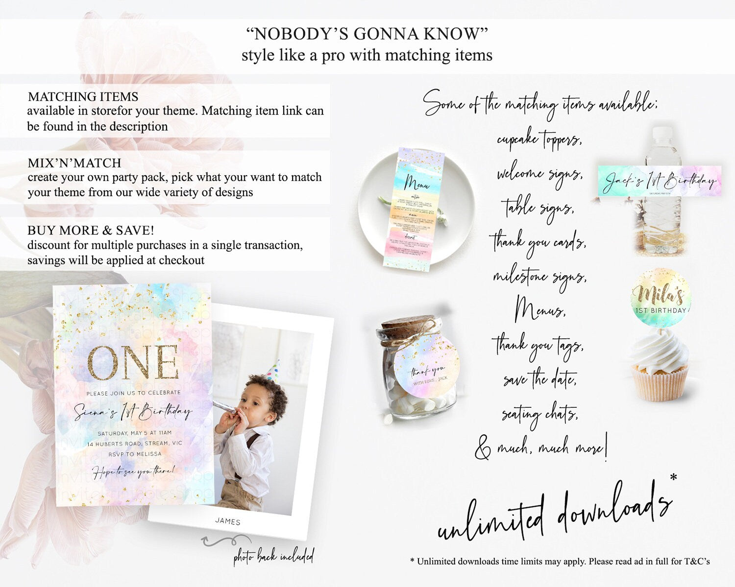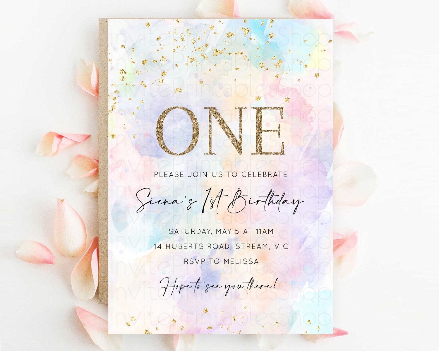 Rainbow Birthday Invitation Colorful Pastel Watercolor Invitation Gold Glitter Sprinkles Ombre Pastel 1st 2nd 3rd Birthday D10605