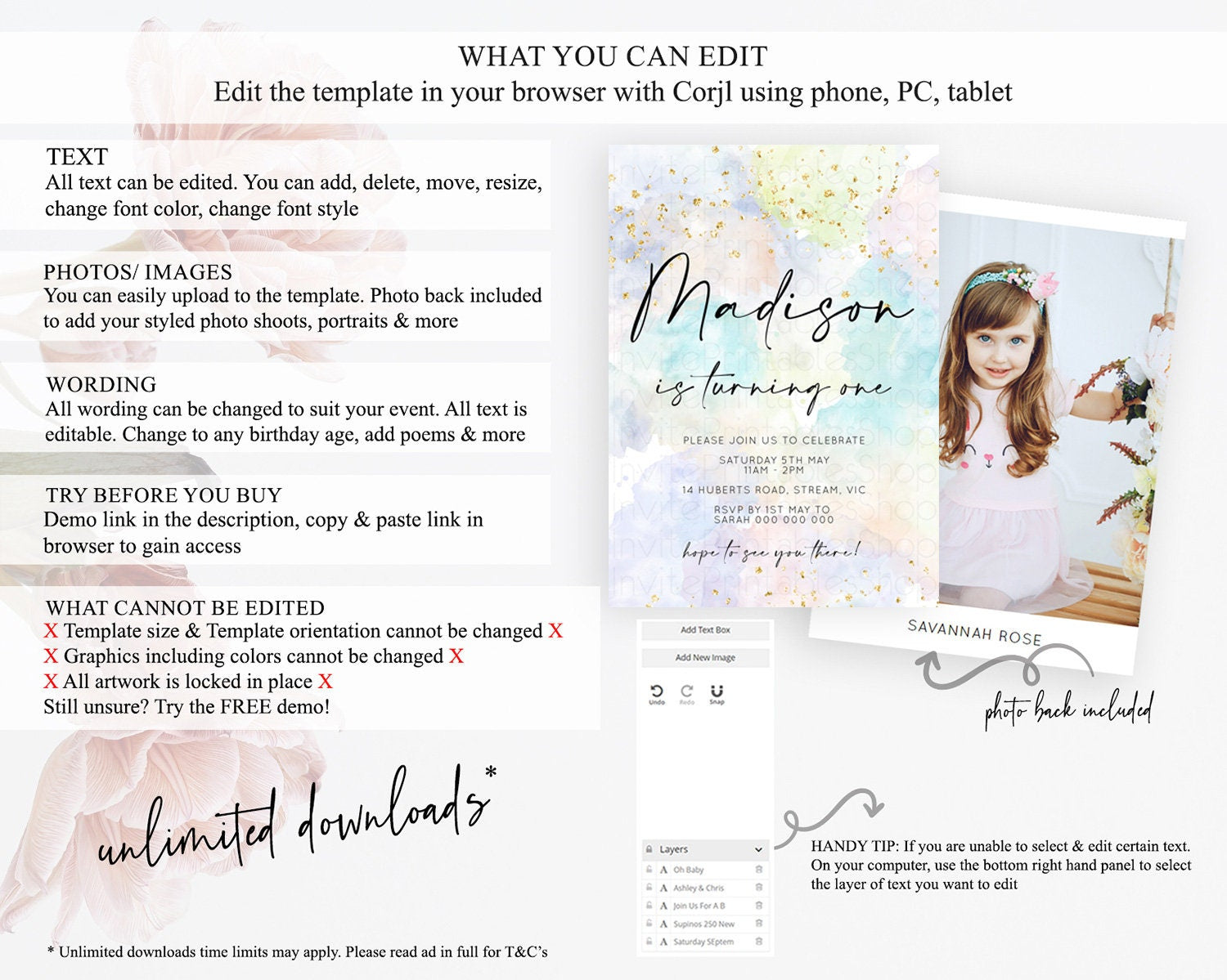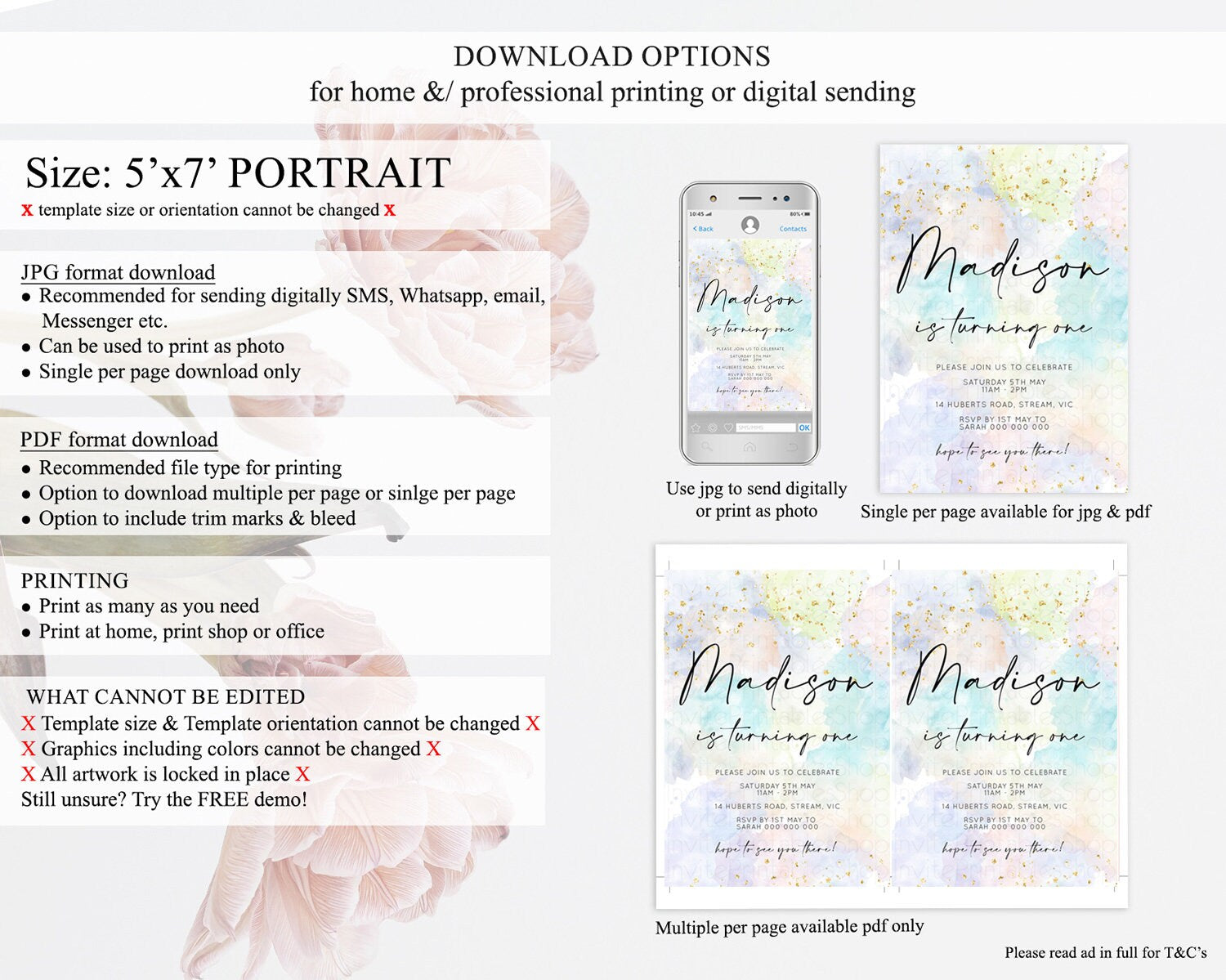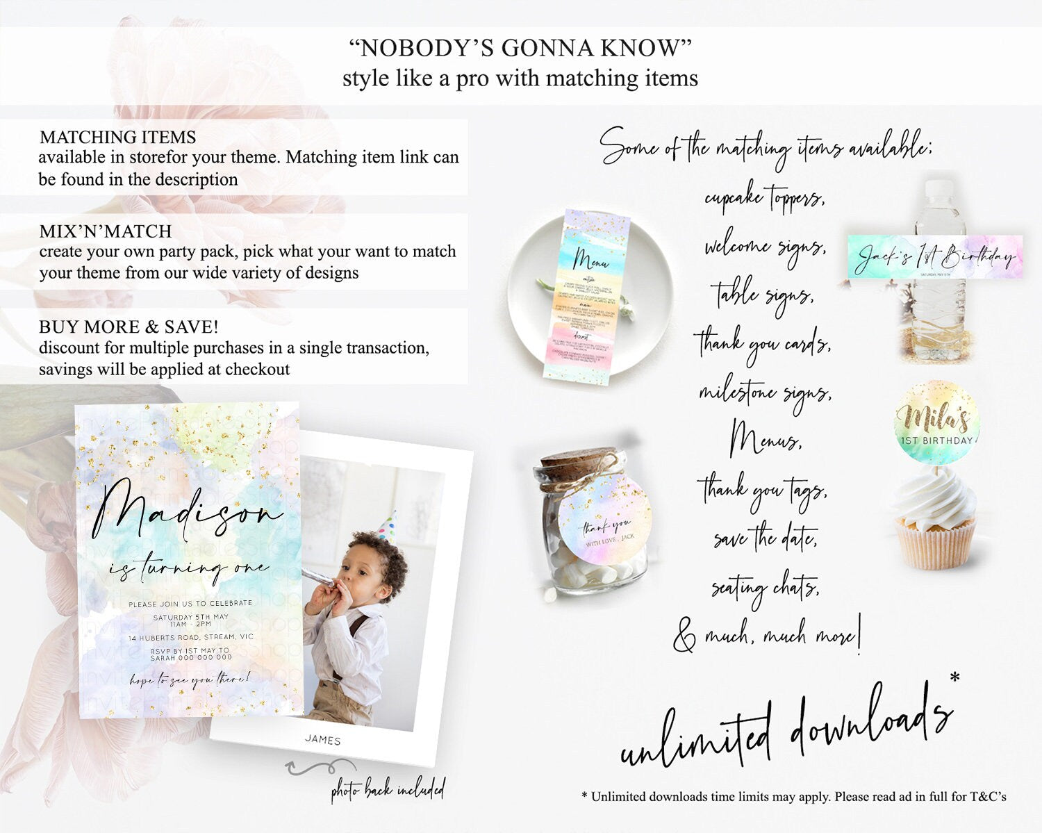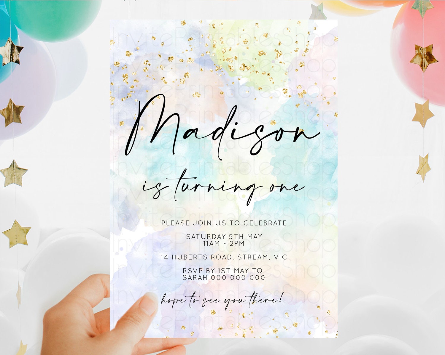Rainbow Birthday Invitation Colorful Pastel Watercolor Invitation Gold Glitter Sprinkles Ombre Pastel 1st 2nd 3rd Birthday D10613