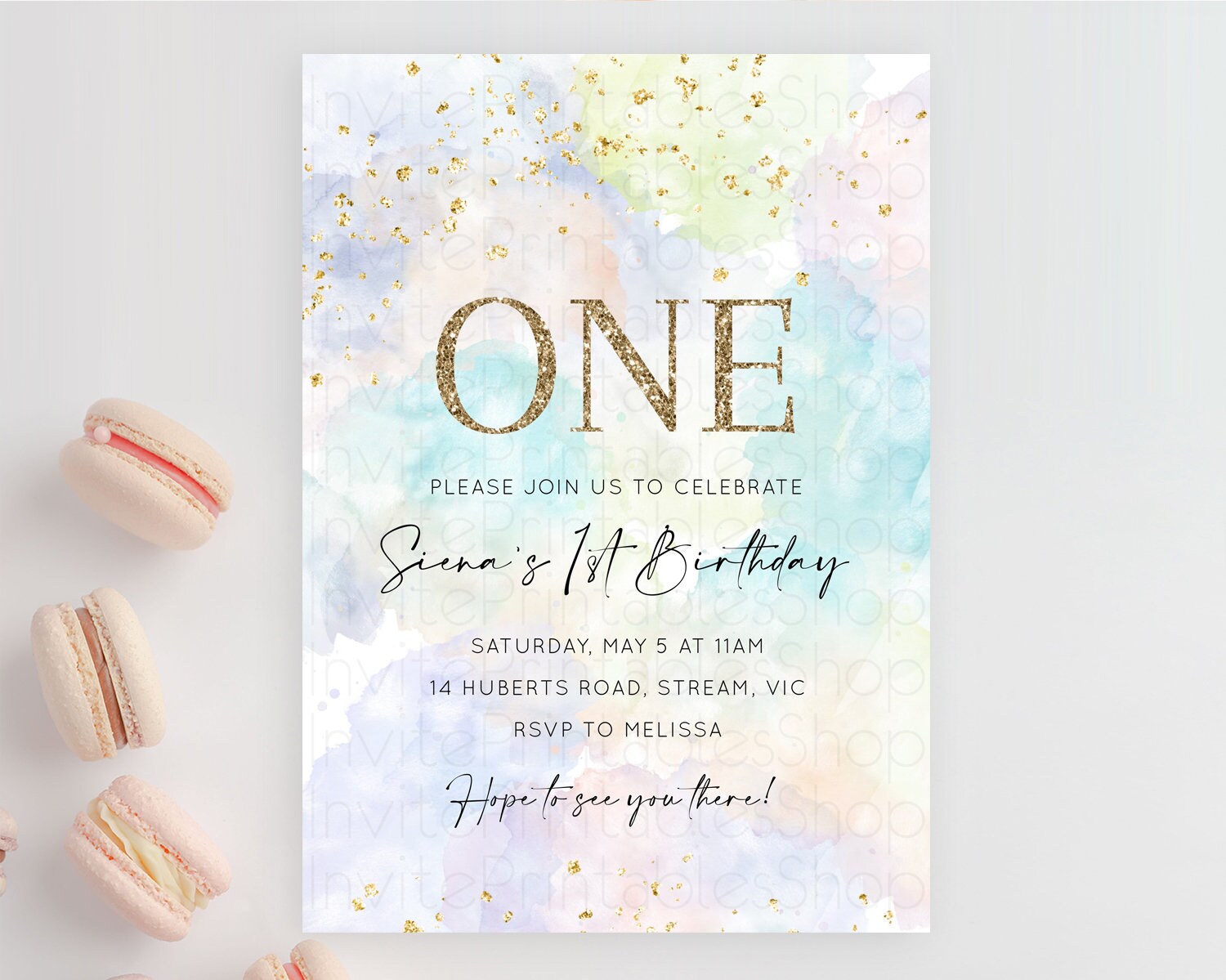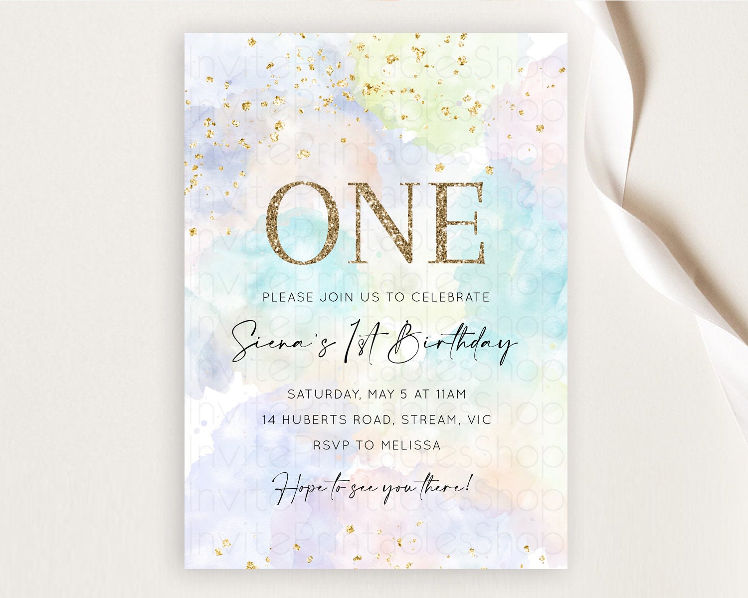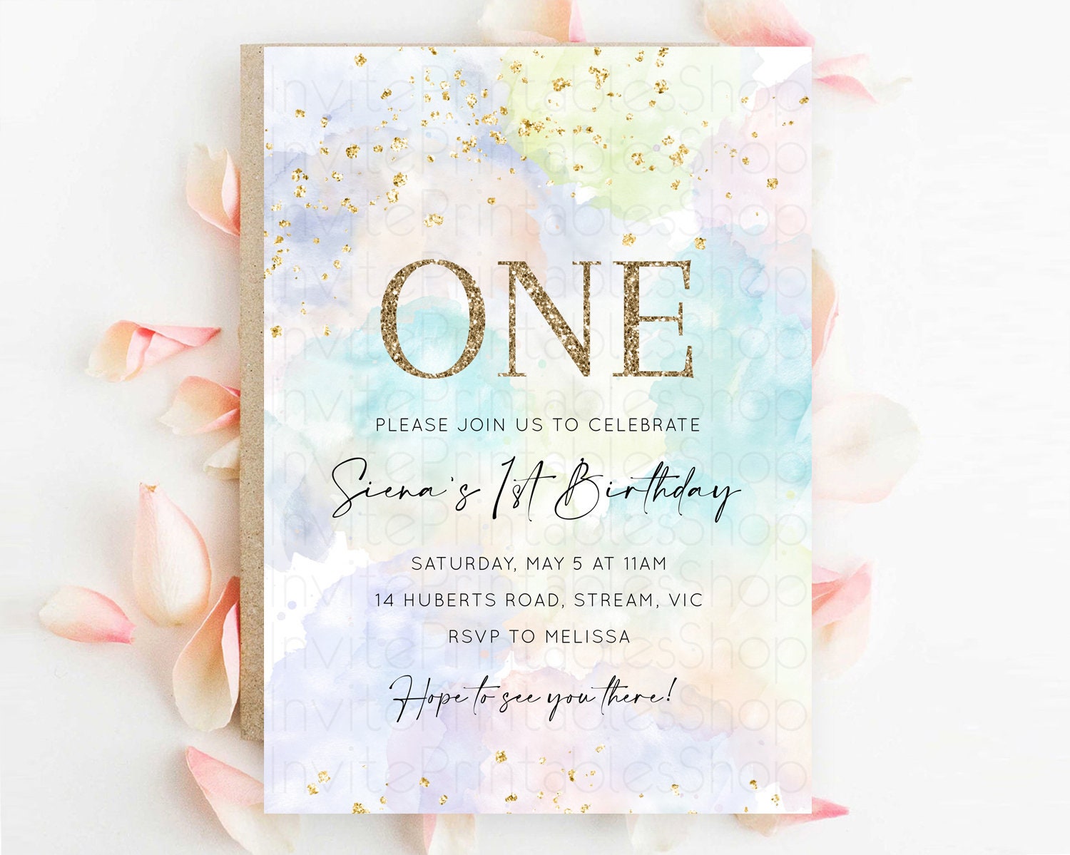 Rainbow Birthday Invitation Colorful Pastel Watercolor Invitation Gold Glitter Sprinkles Ombre Pastel 1st 2nd 3rd Birthday D10613