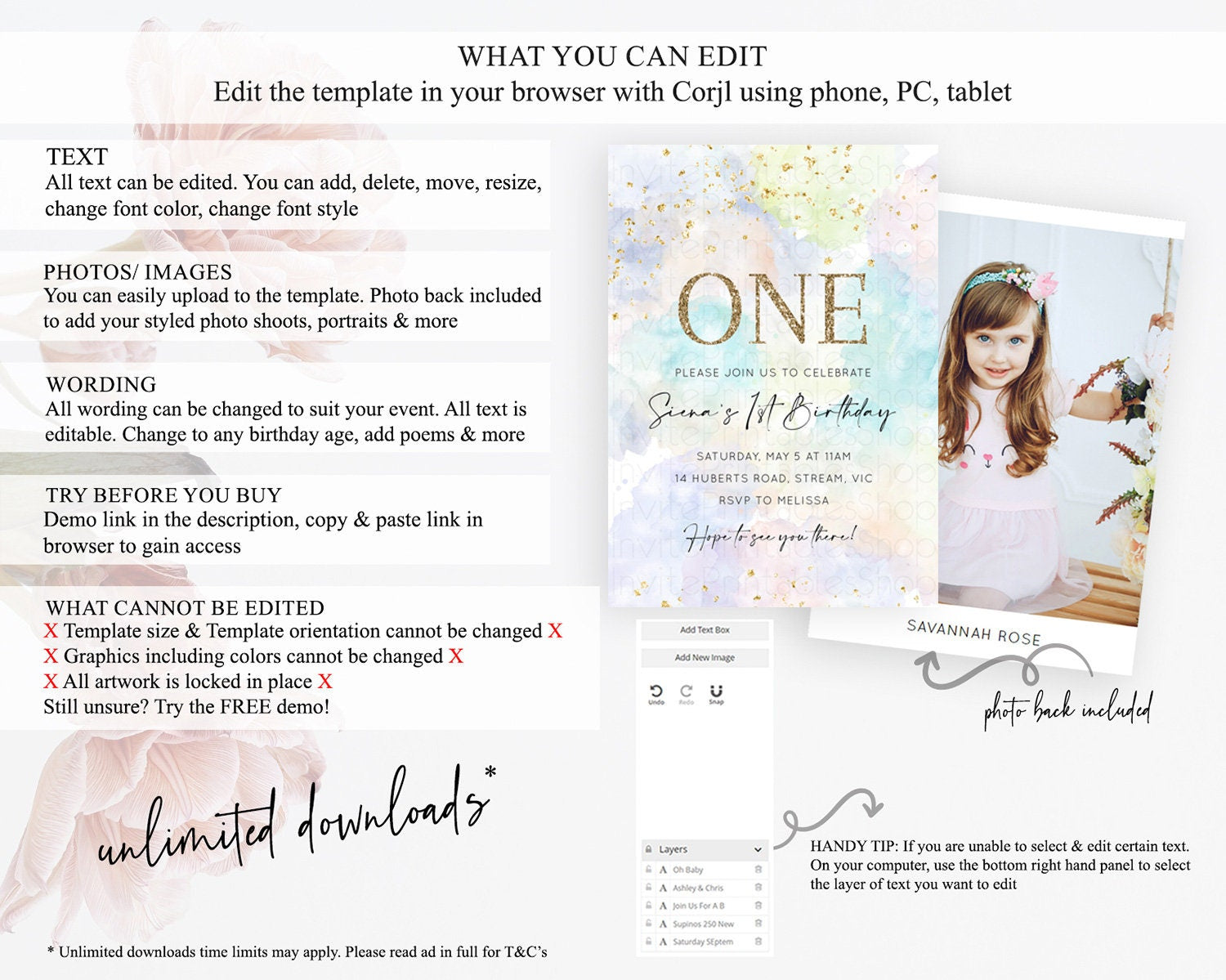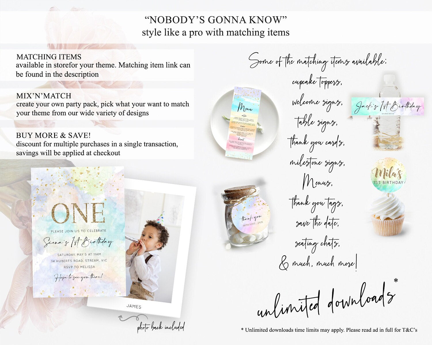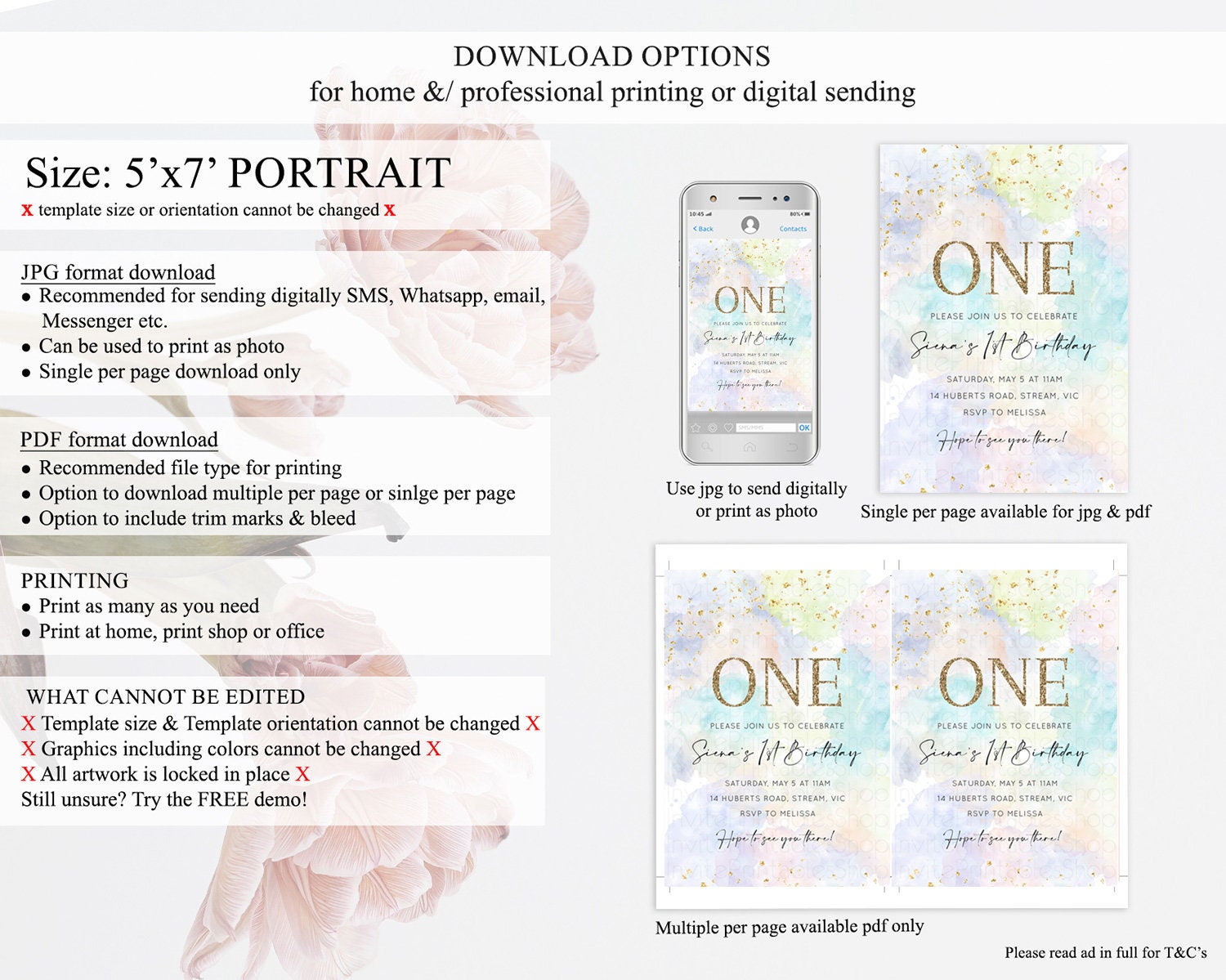Rainbow Birthday Invitation Colorful Pastel Watercolor Invitation Gold Glitter Sprinkles Ombre Pastel 1st 2nd 3rd Birthday D10613