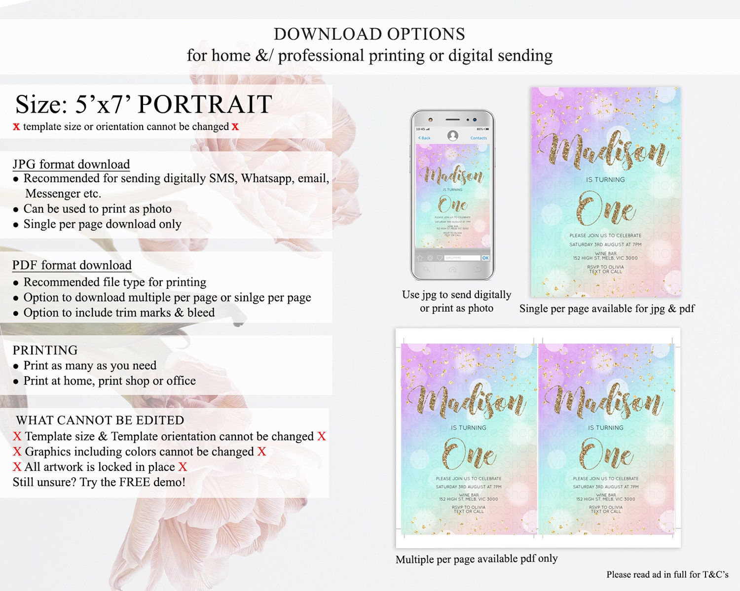 Rainbow Birthday Invitation Colorful Pastel Watercolor Invitation Gold Glitter Sprinkles Ombre Pastel 1st 2nd 3rd Birthday D10621