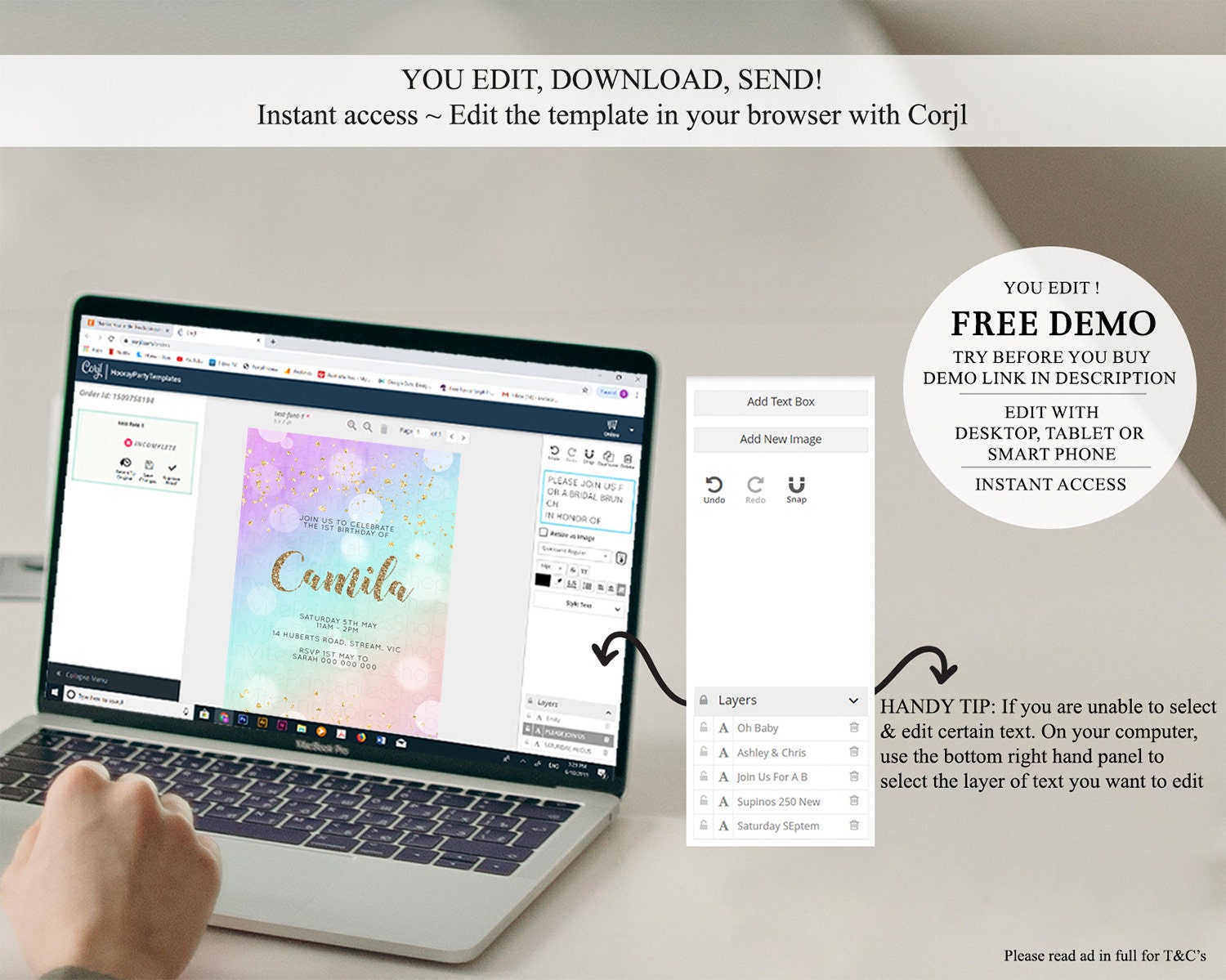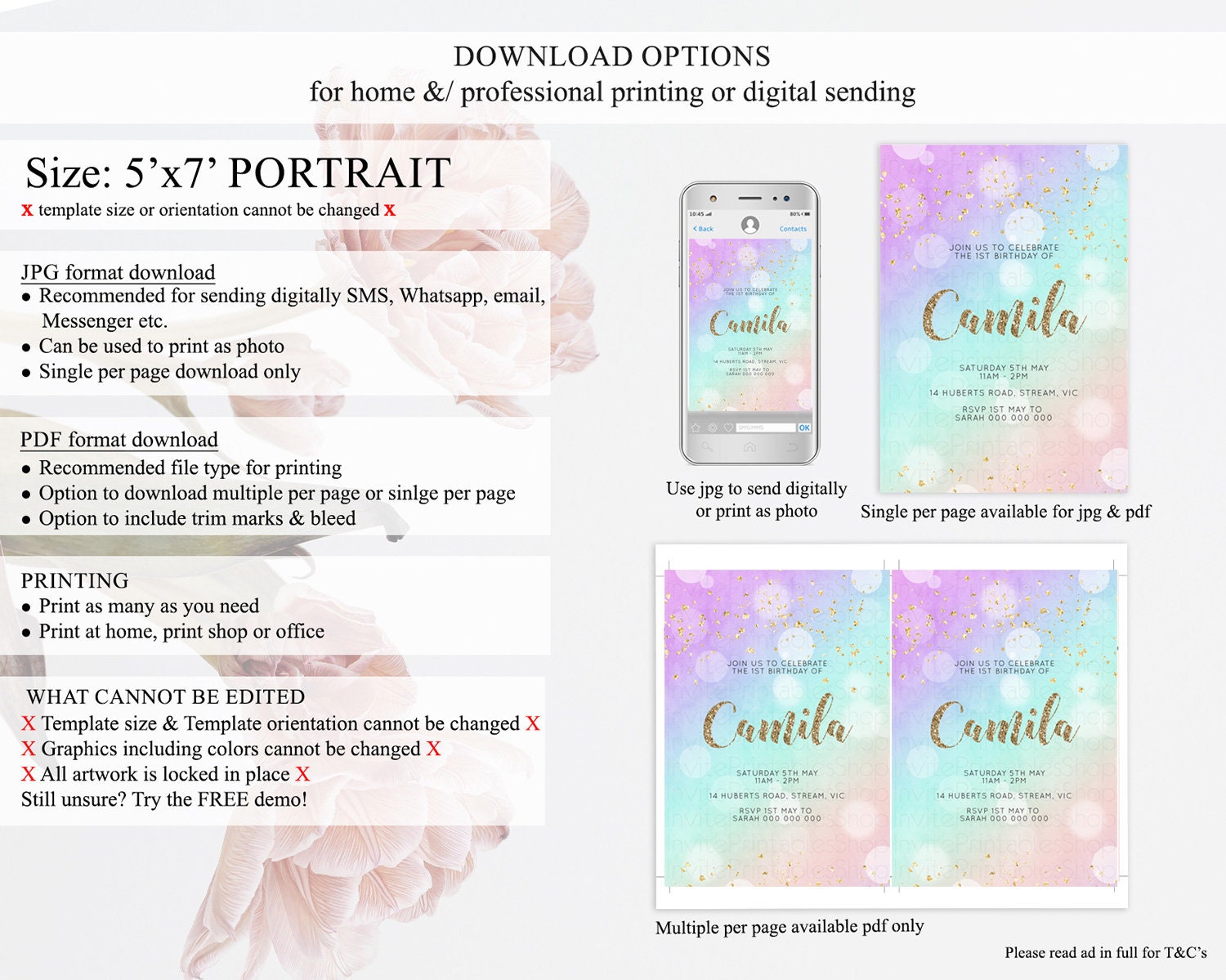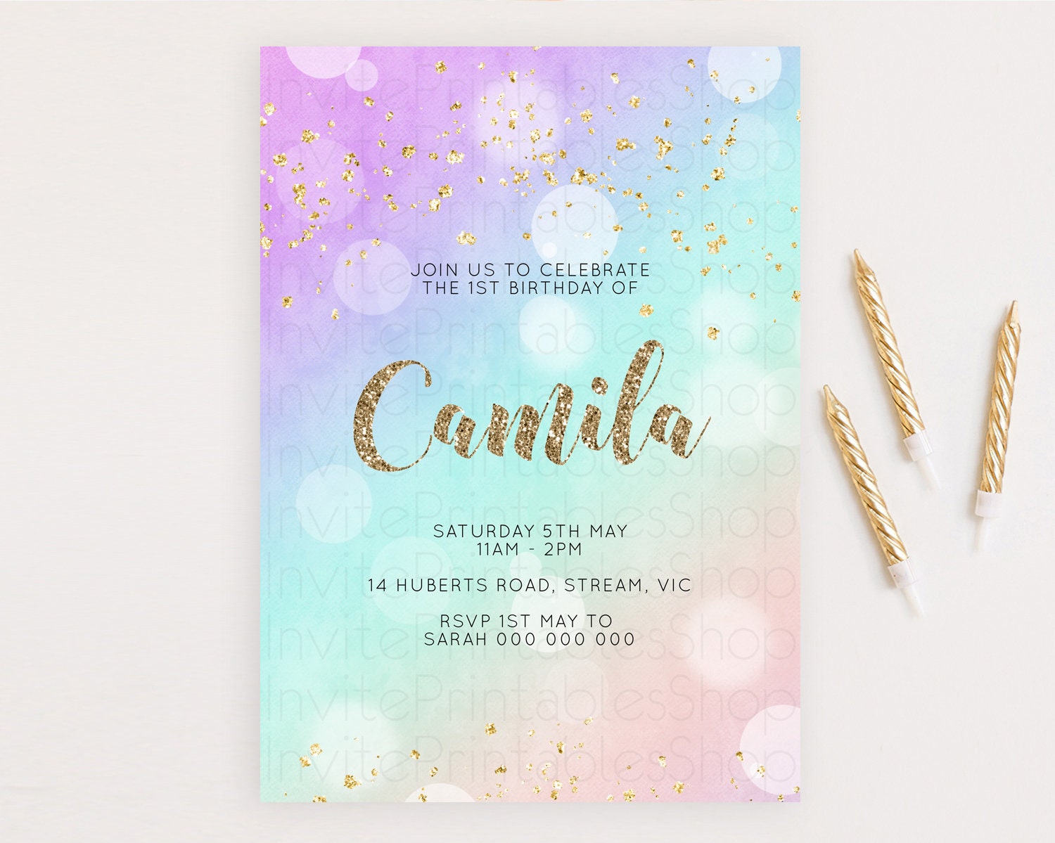 Rainbow Birthday Invitation Colorful Pastel Watercolor Invitation Gold Glitter Sprinkles Ombre Pastel 1st 2nd 3rd Birthday D10621