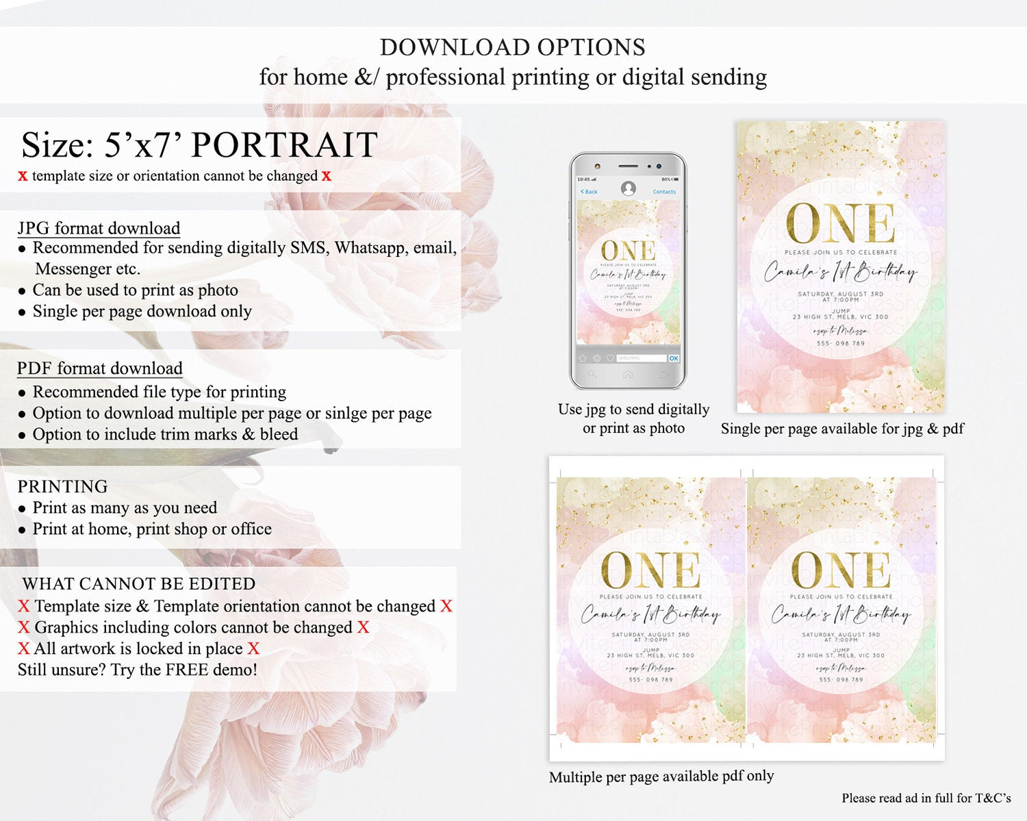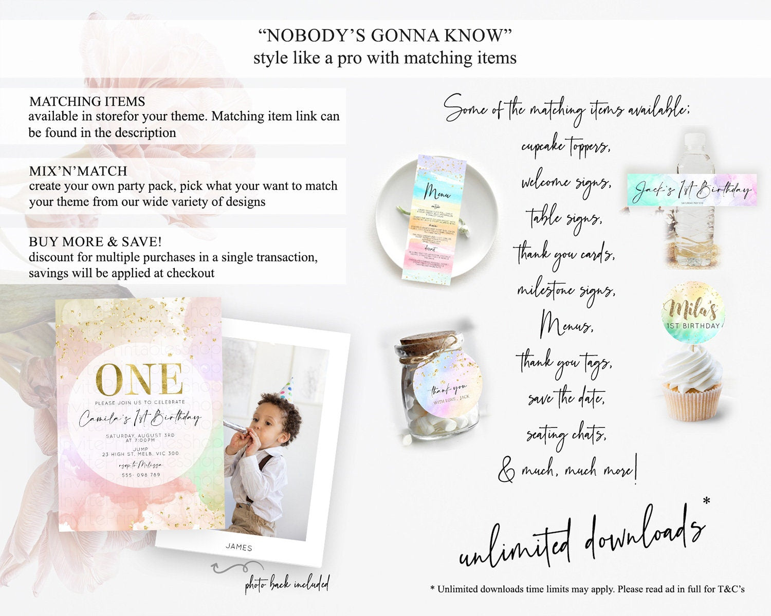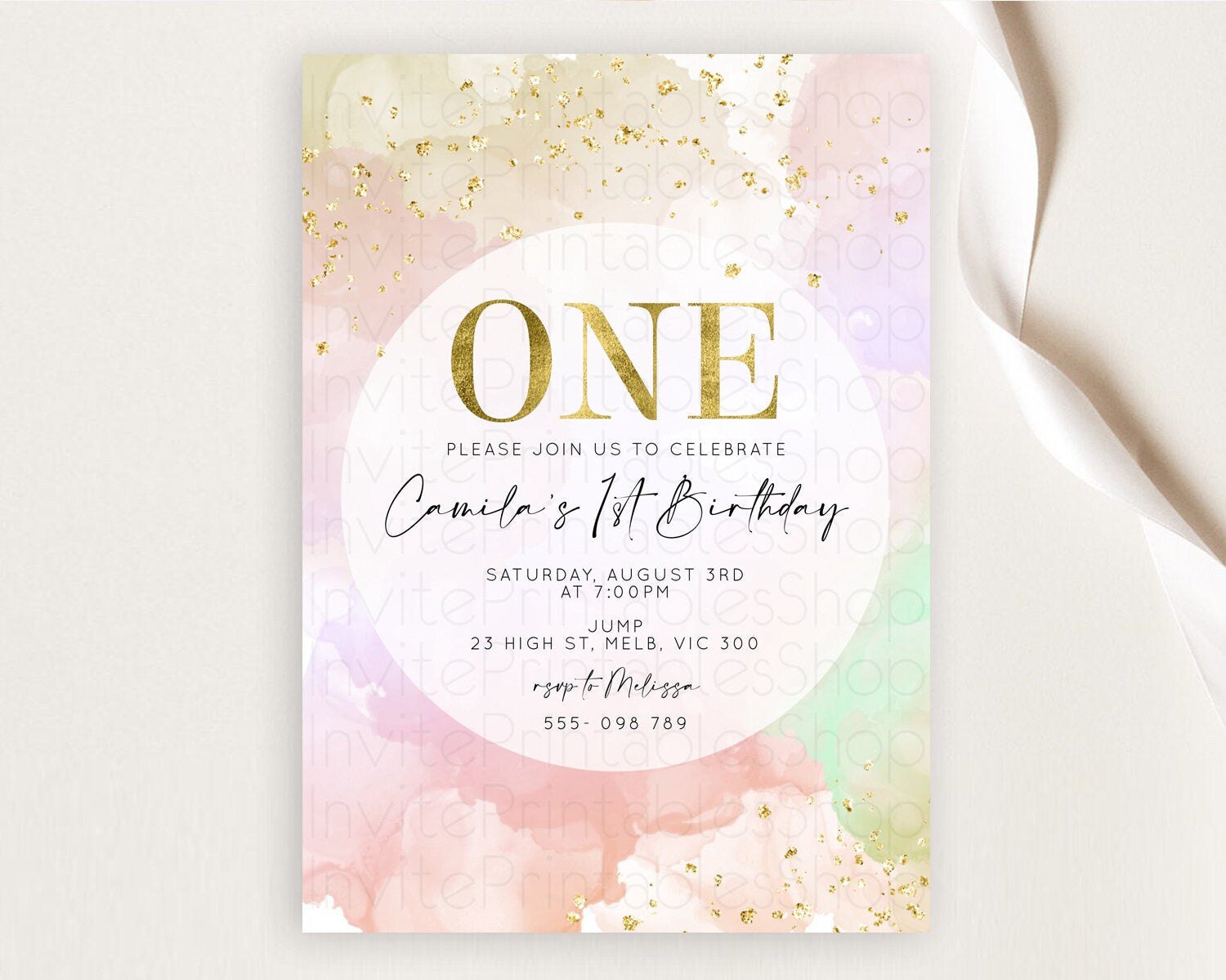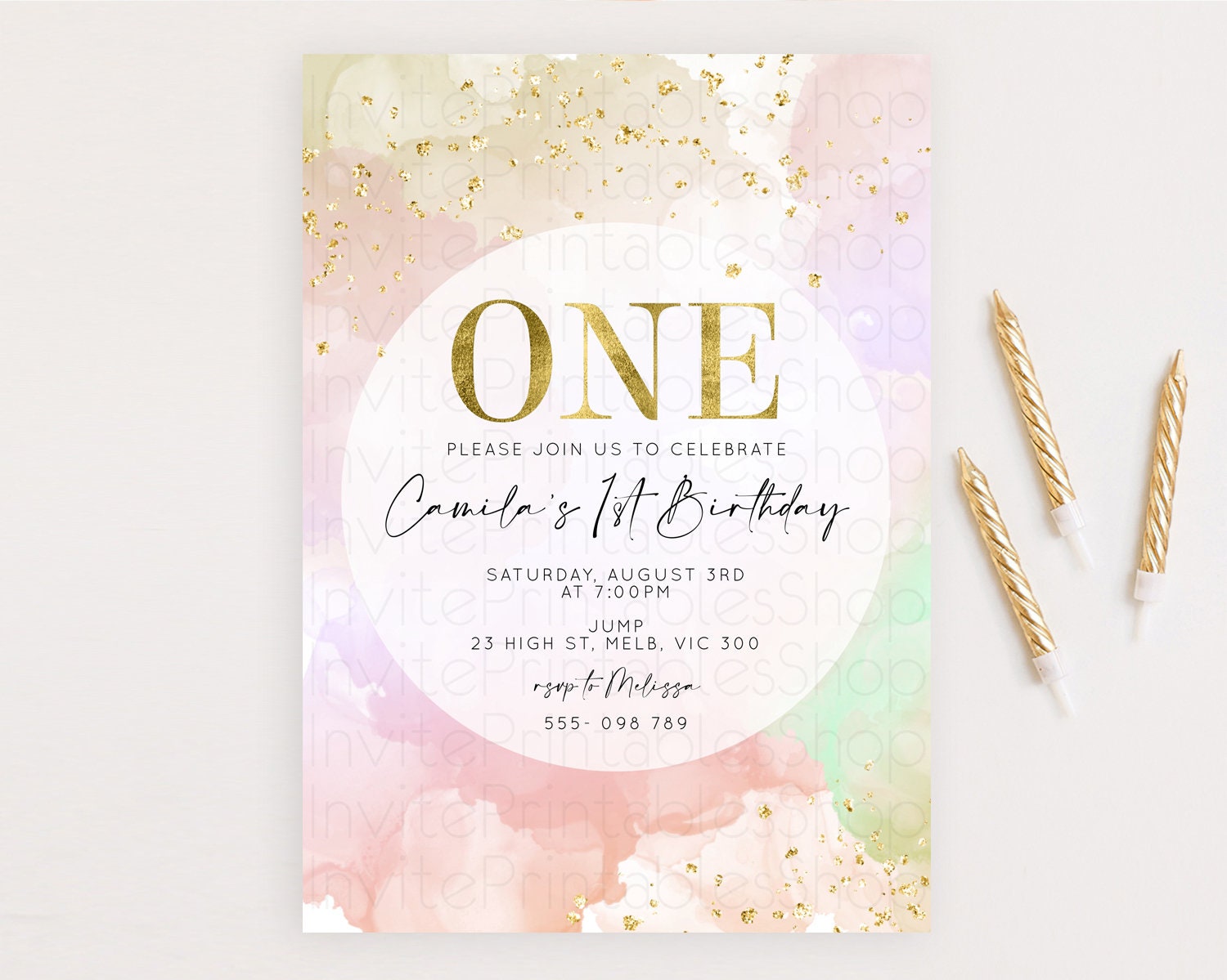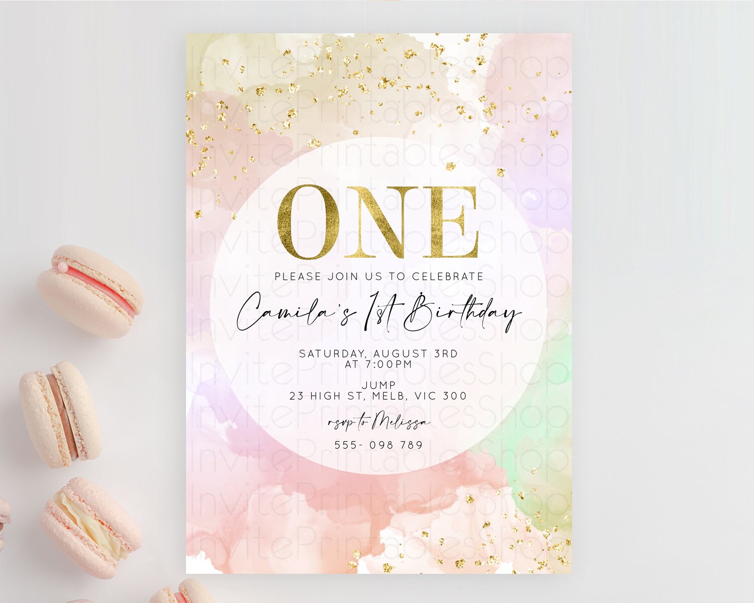 Rainbow Birthday Invitation Colorful Pastel Watercolor Invitation Gold Glitter Sprinkles Ombre Pastel 1st 2nd 3rd Birthday D10627