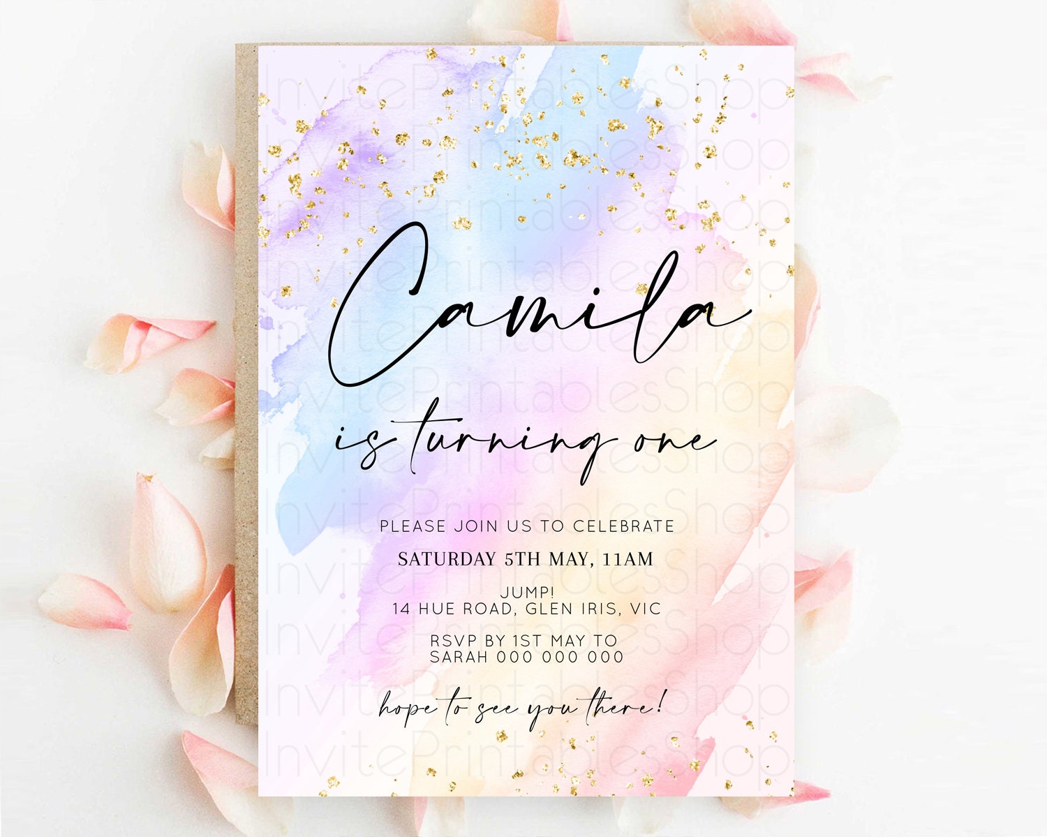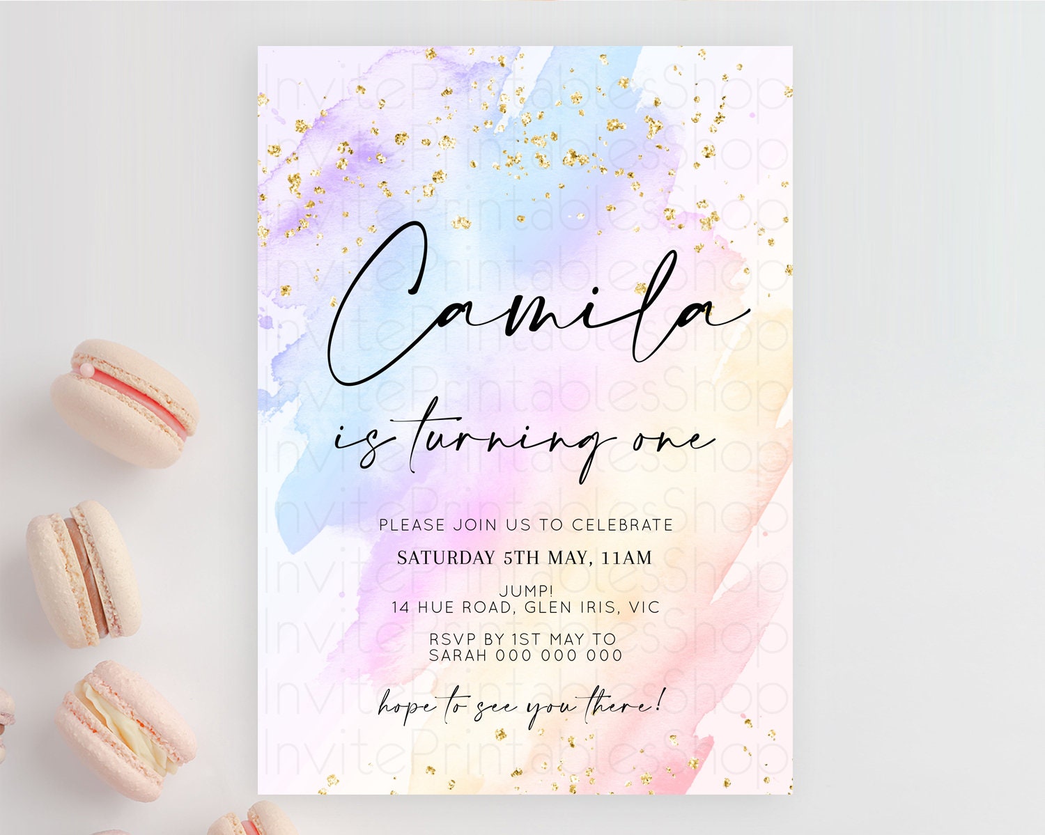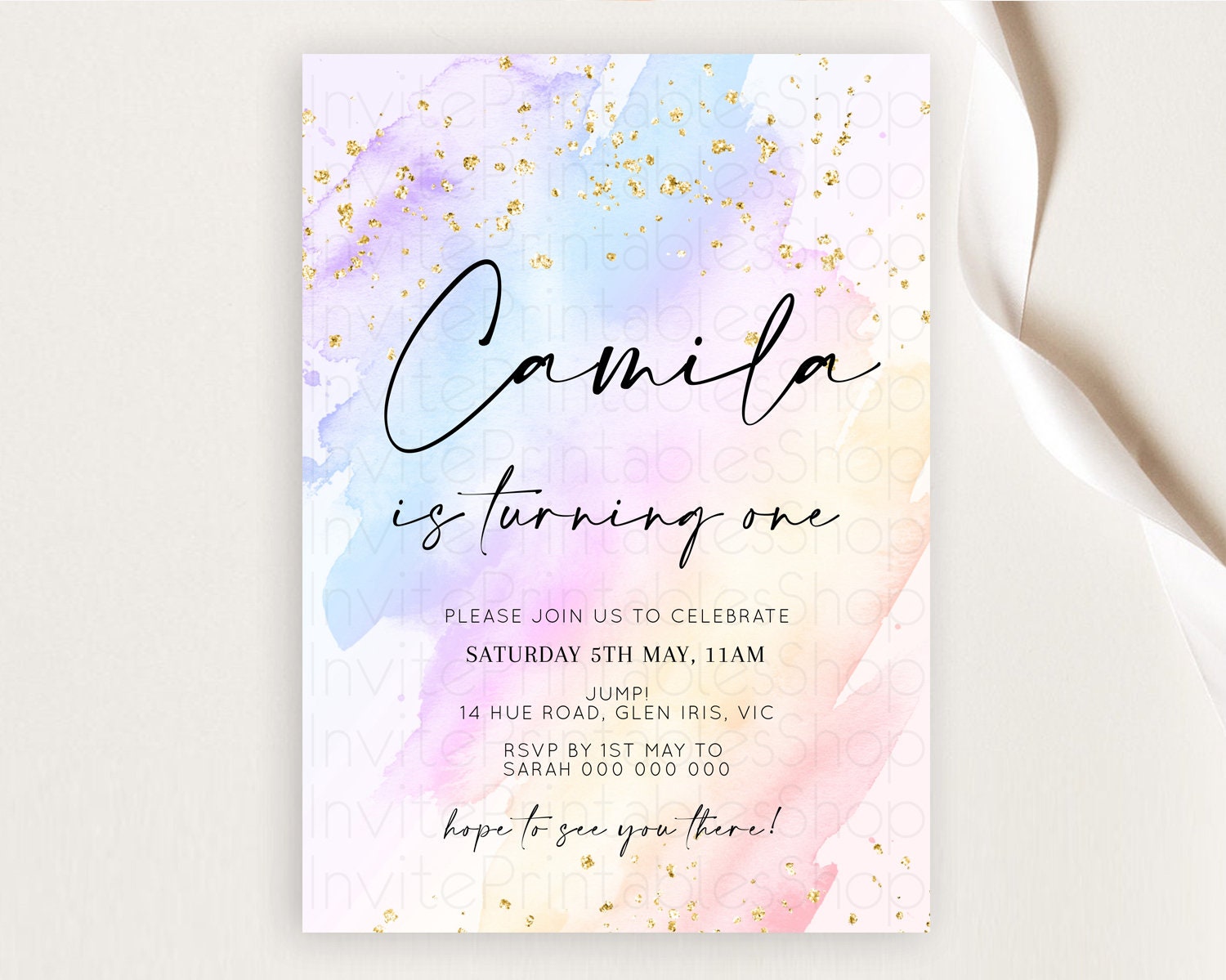 Rainbow Birthday Invitation Colorful Pastel Watercolor Invitation Gold Glitter Sprinkles Ombre Pastel 1st 2nd 3rd Birthday D10635