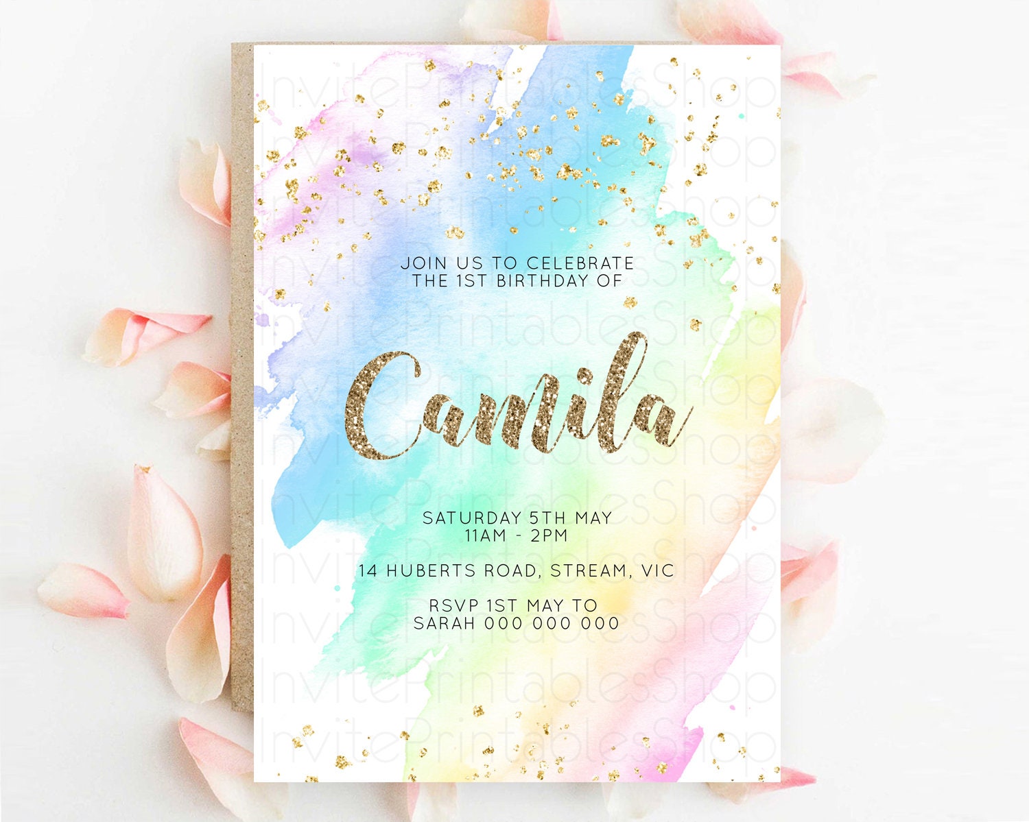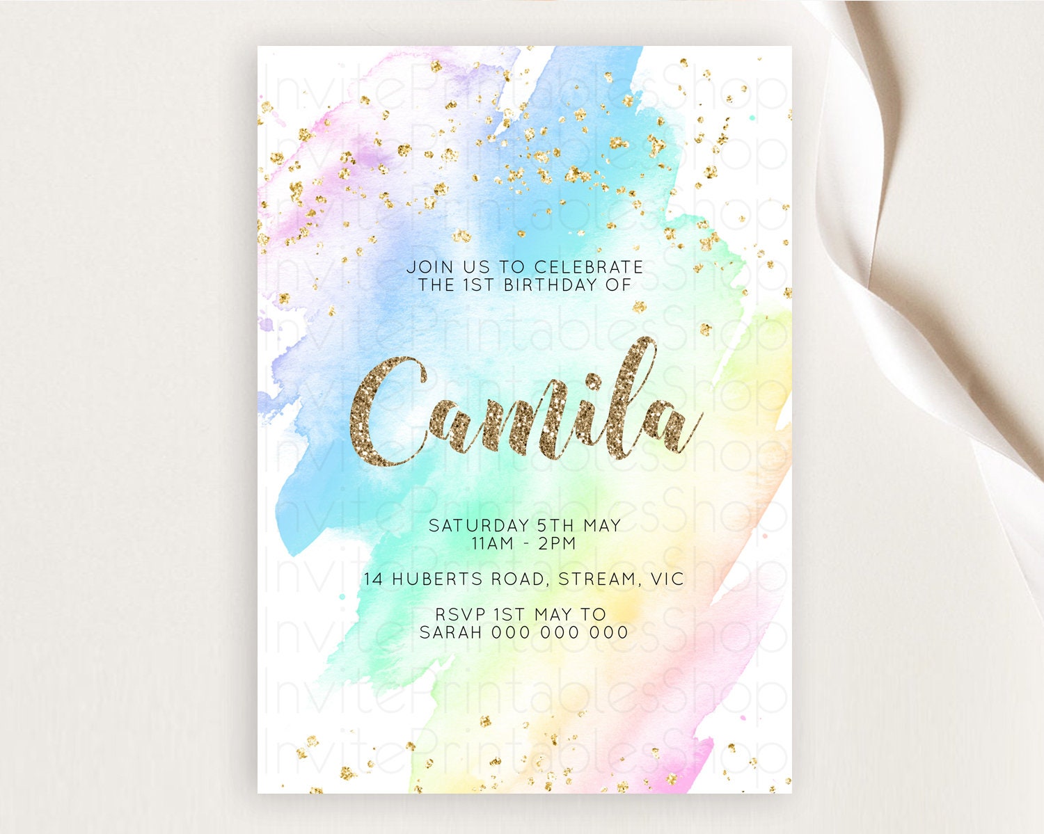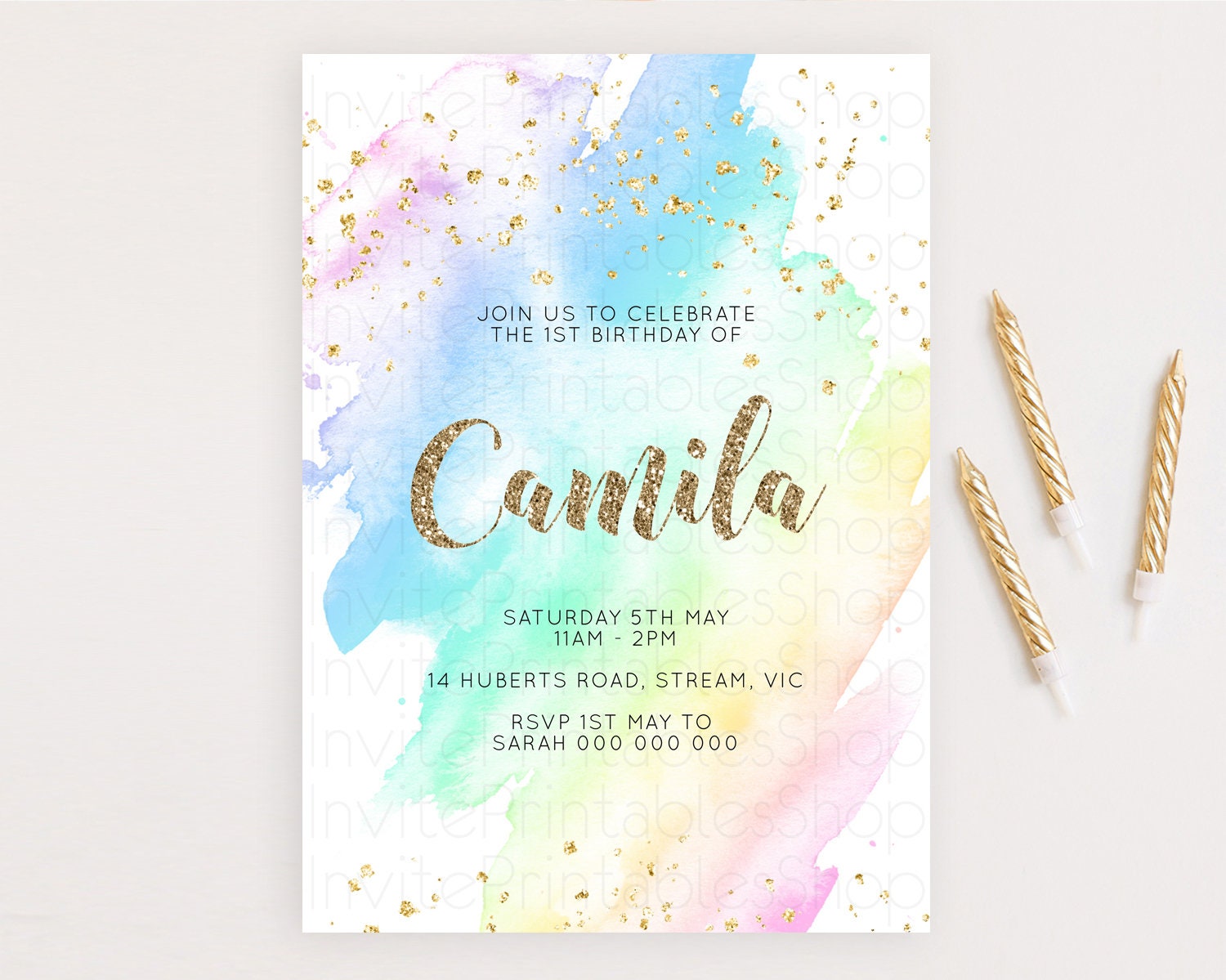 Rainbow Birthday Invitation Colorful Pastel Watercolor Invitation Gold Glitter Sprinkles Ombre Pastel 1st 2nd 3rd Birthday D10637