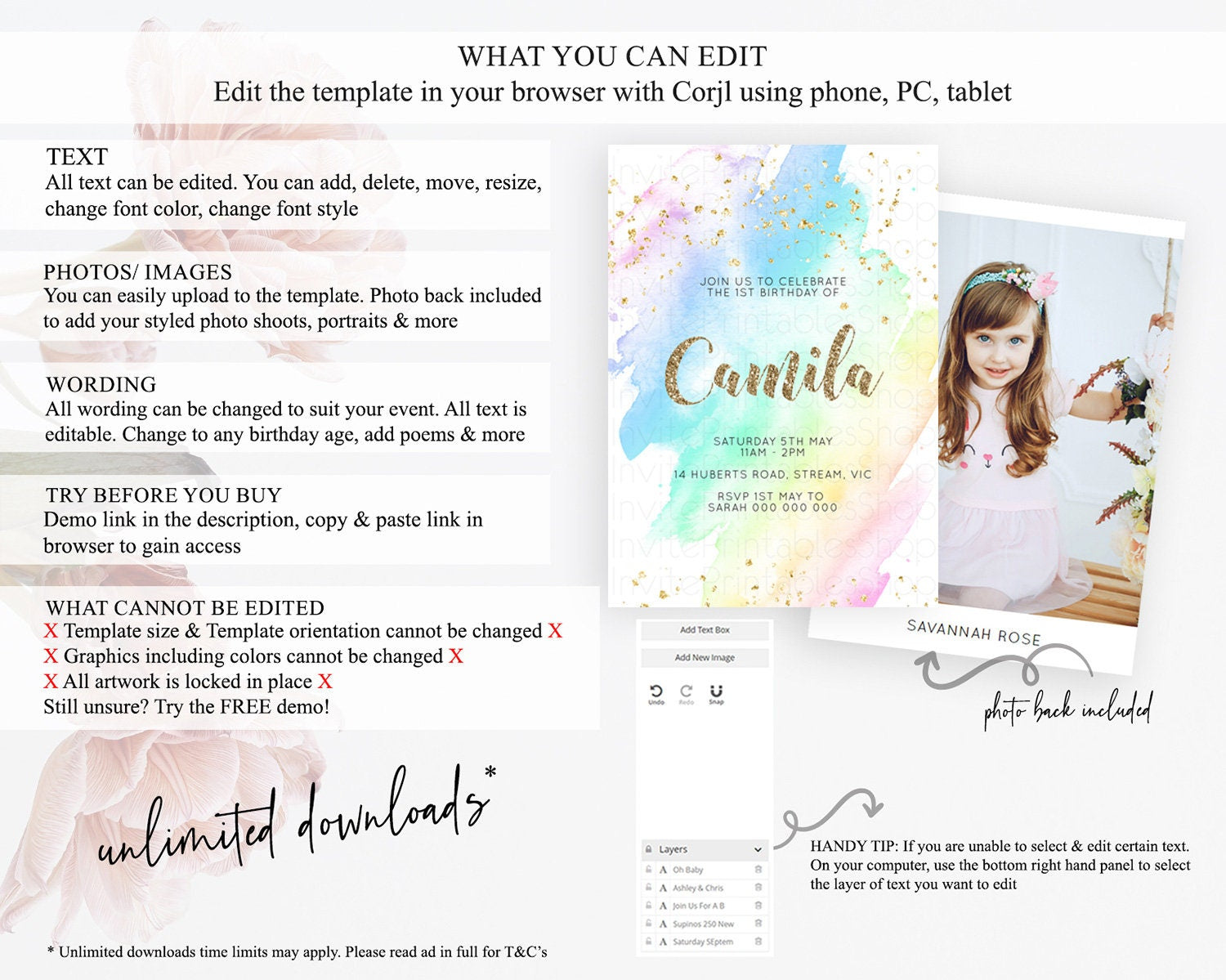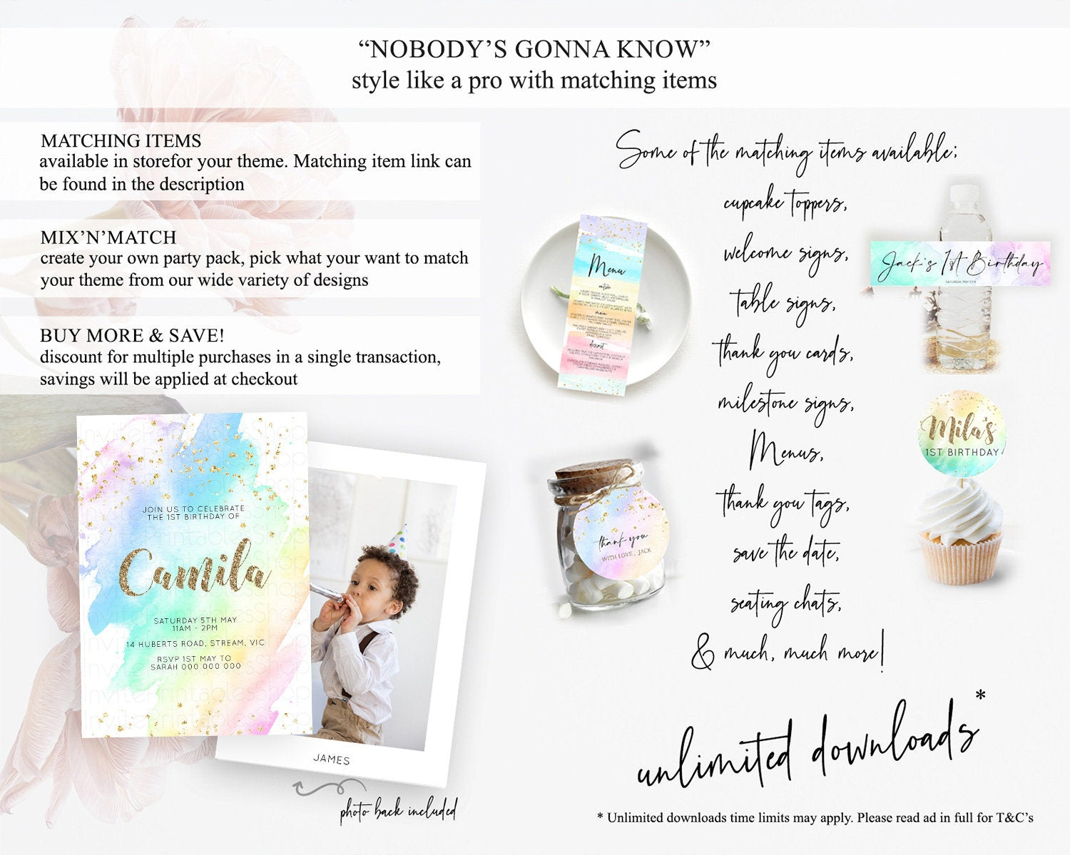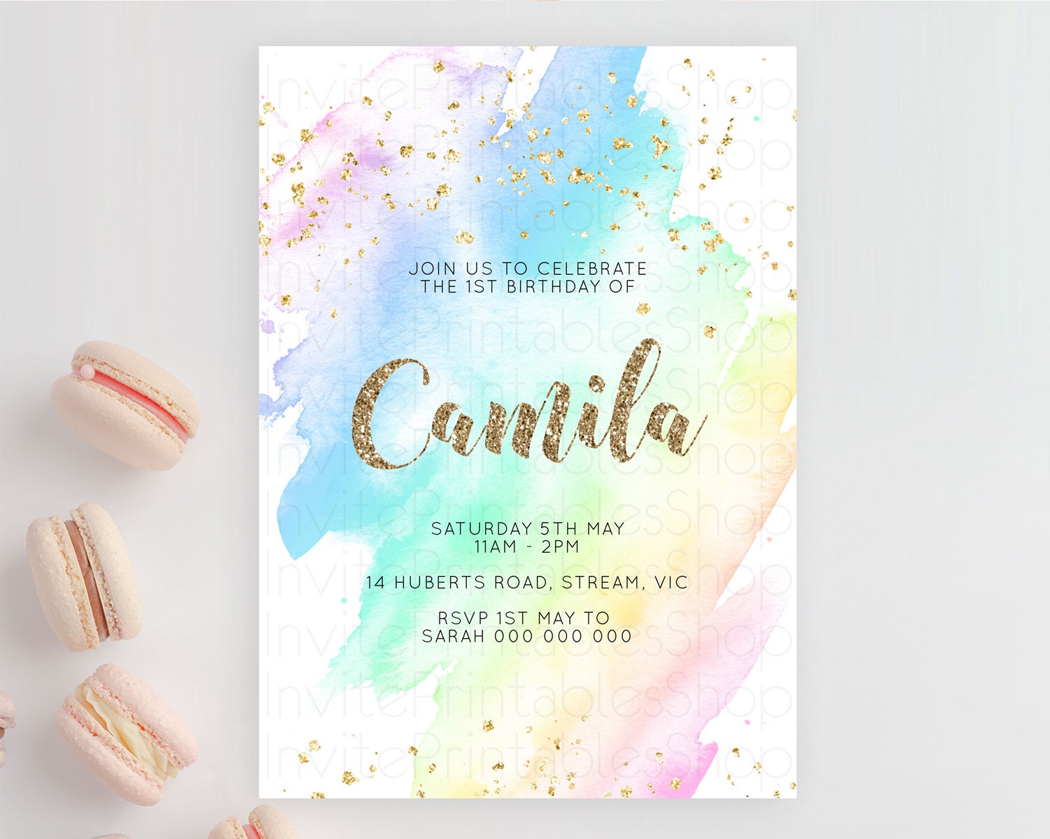 Rainbow Birthday Invitation Colorful Pastel Watercolor Invitation Gold Glitter Sprinkles Ombre Pastel 1st 2nd 3rd Birthday D10637