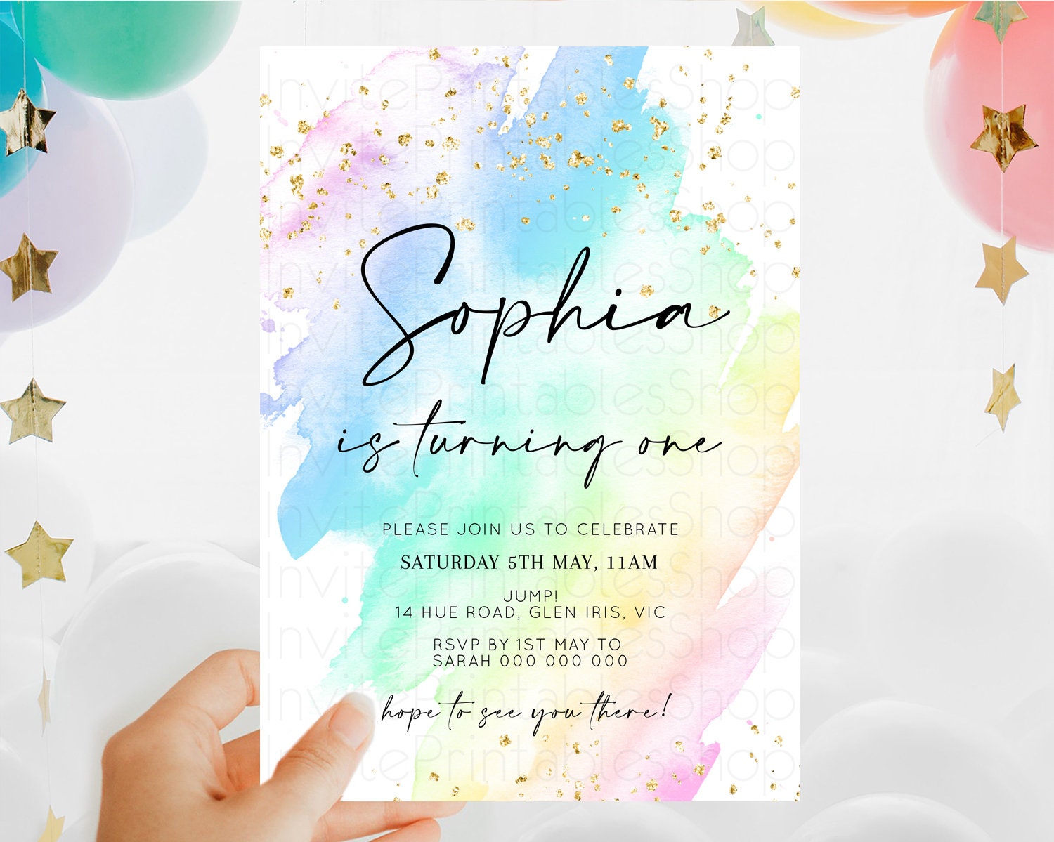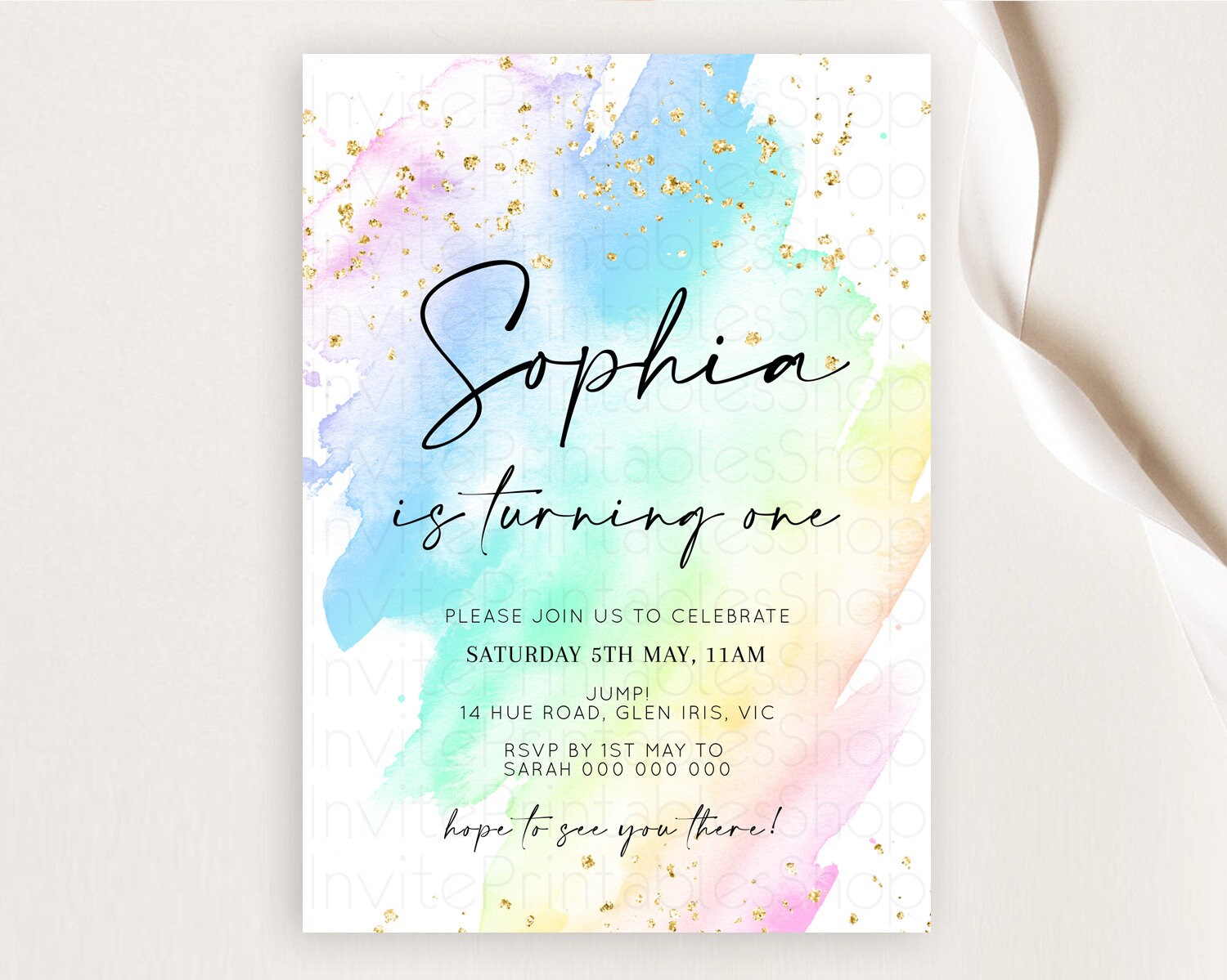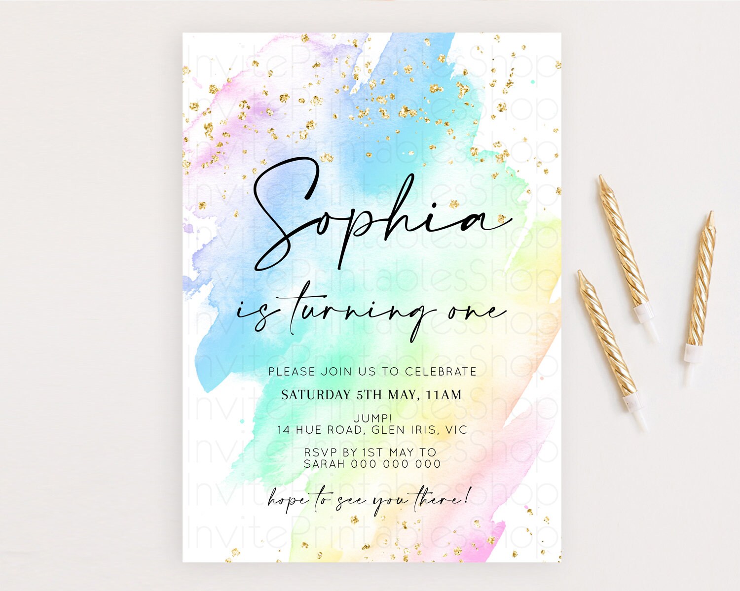 Rainbow Birthday Invitation Colorful Pastel Watercolor Invitation Gold Glitter Sprinkles Ombre Pastel 1st 2nd 3rd Birthday D10640