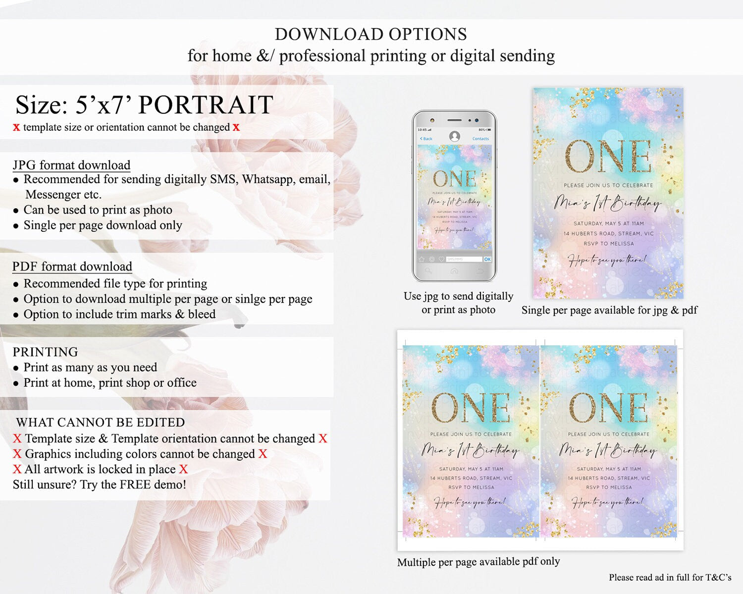 Rainbow Birthday Invitation Colorful Pastel Watercolor Invitation Gold Glitter Sprinkles Ombre Pastel 1st 2nd 3rd Birthday D10675