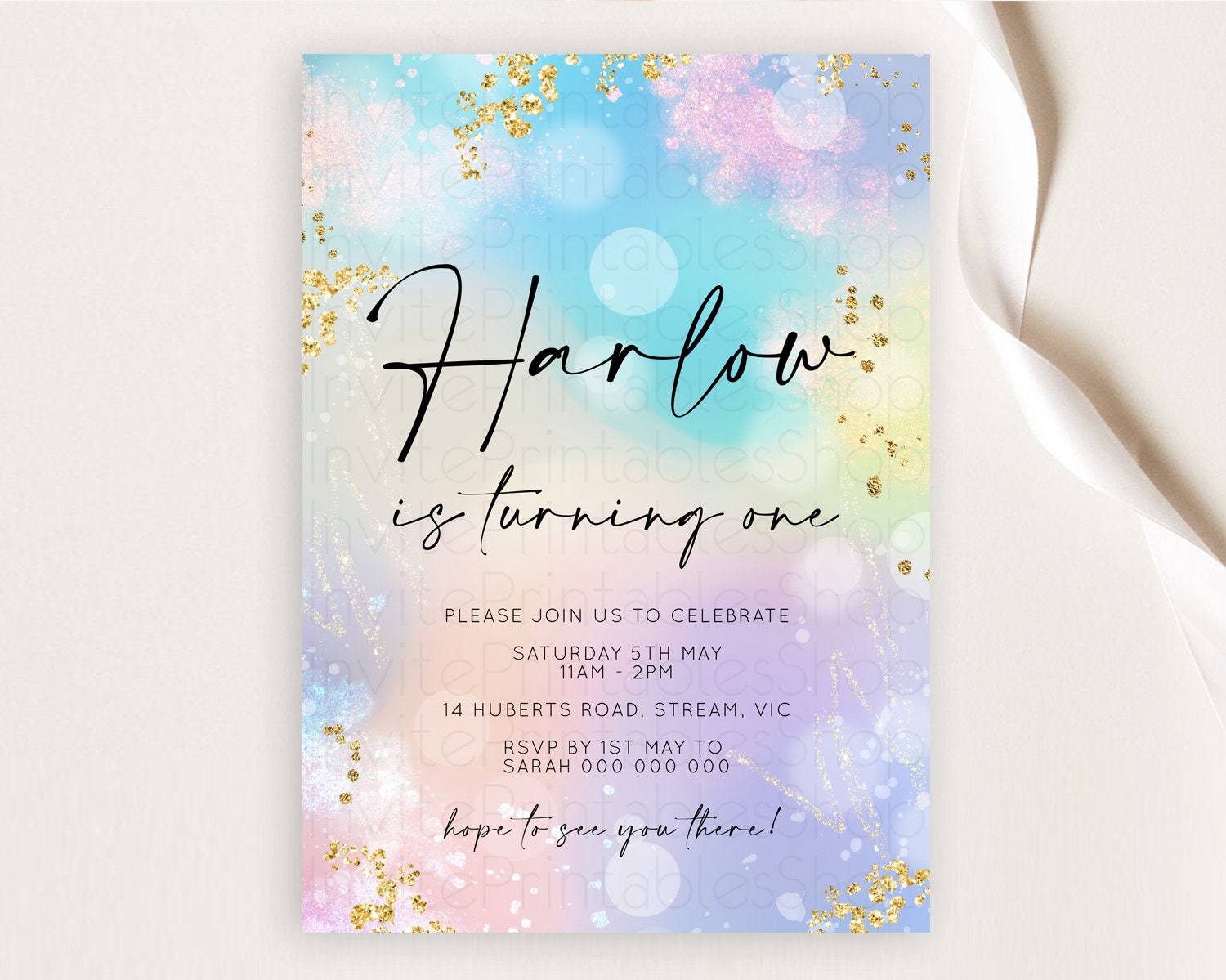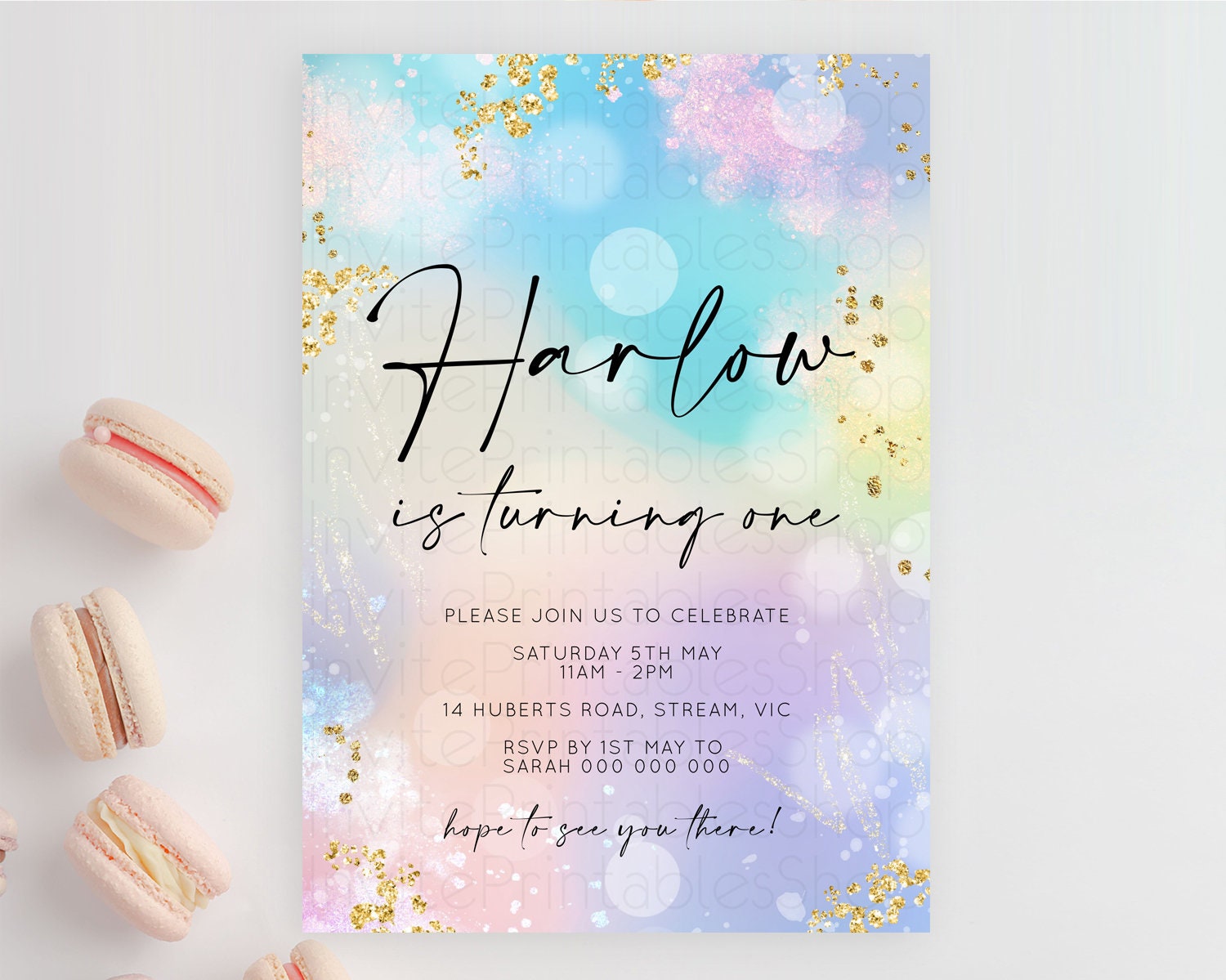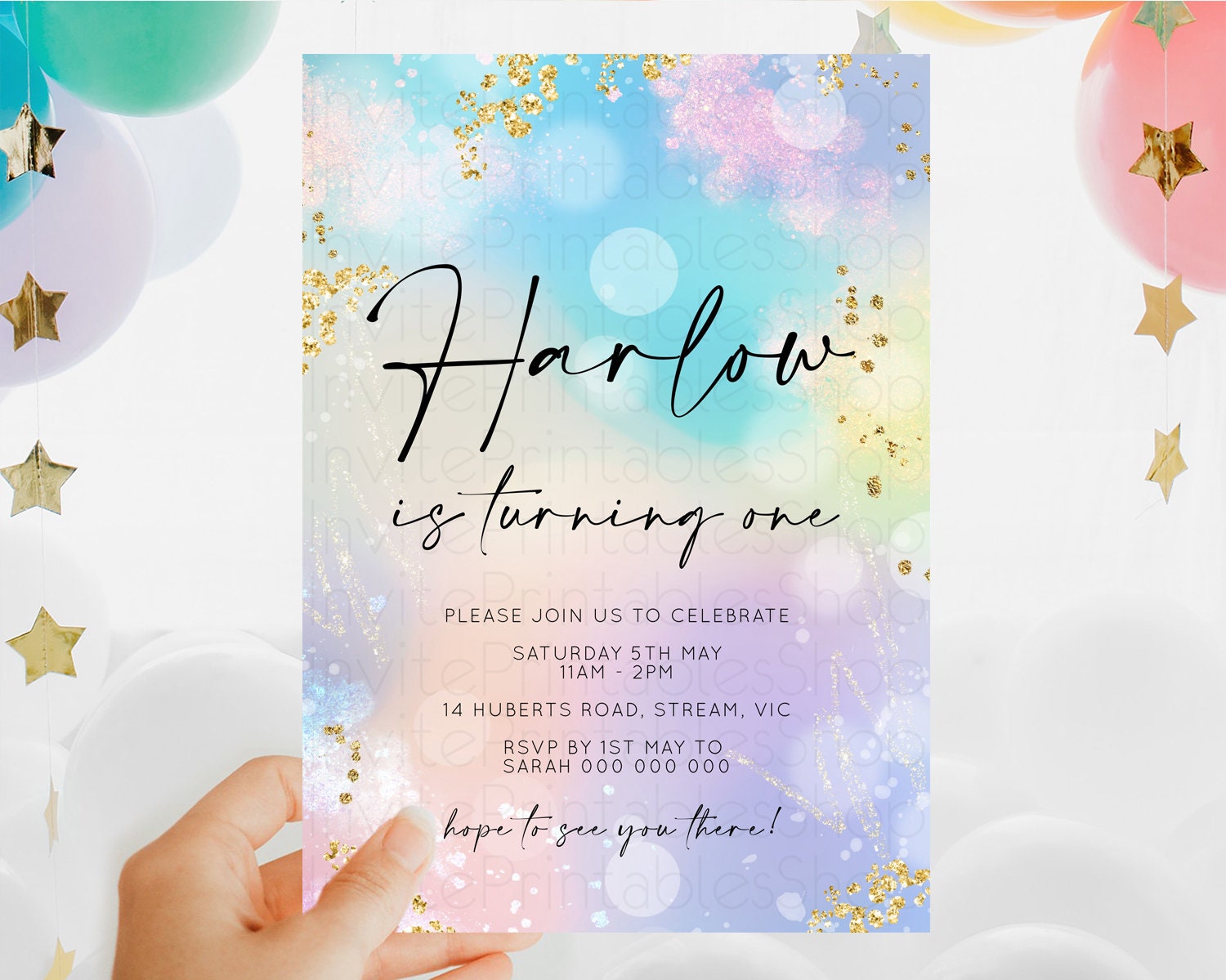 Rainbow Birthday Invitation Colorful Pastel Watercolor Invitation Gold Glitter Sprinkles Ombre Pastel 1st 2nd 3rd Birthday D10675