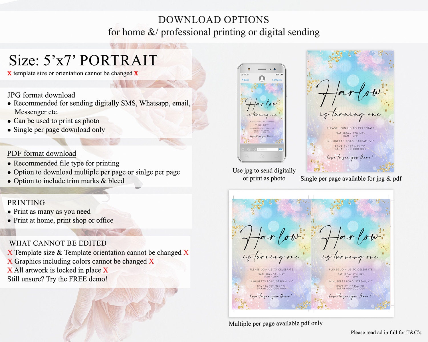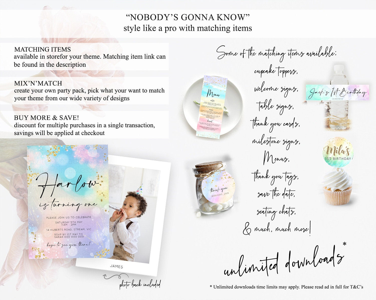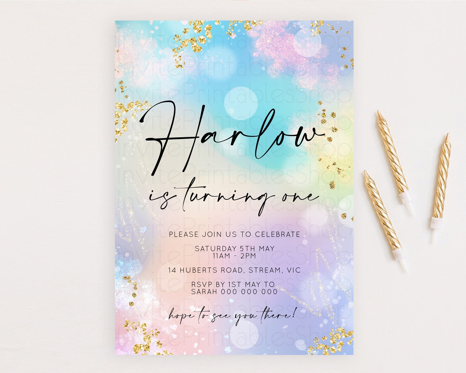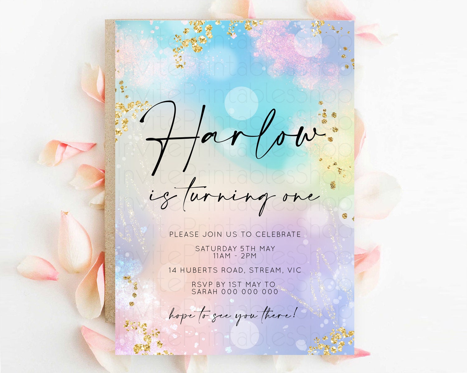 Rainbow Birthday Invitation Colorful Pastel Watercolor Invitation Gold Glitter Sprinkles Ombre Pastel 1st 2nd 3rd Birthday D10675