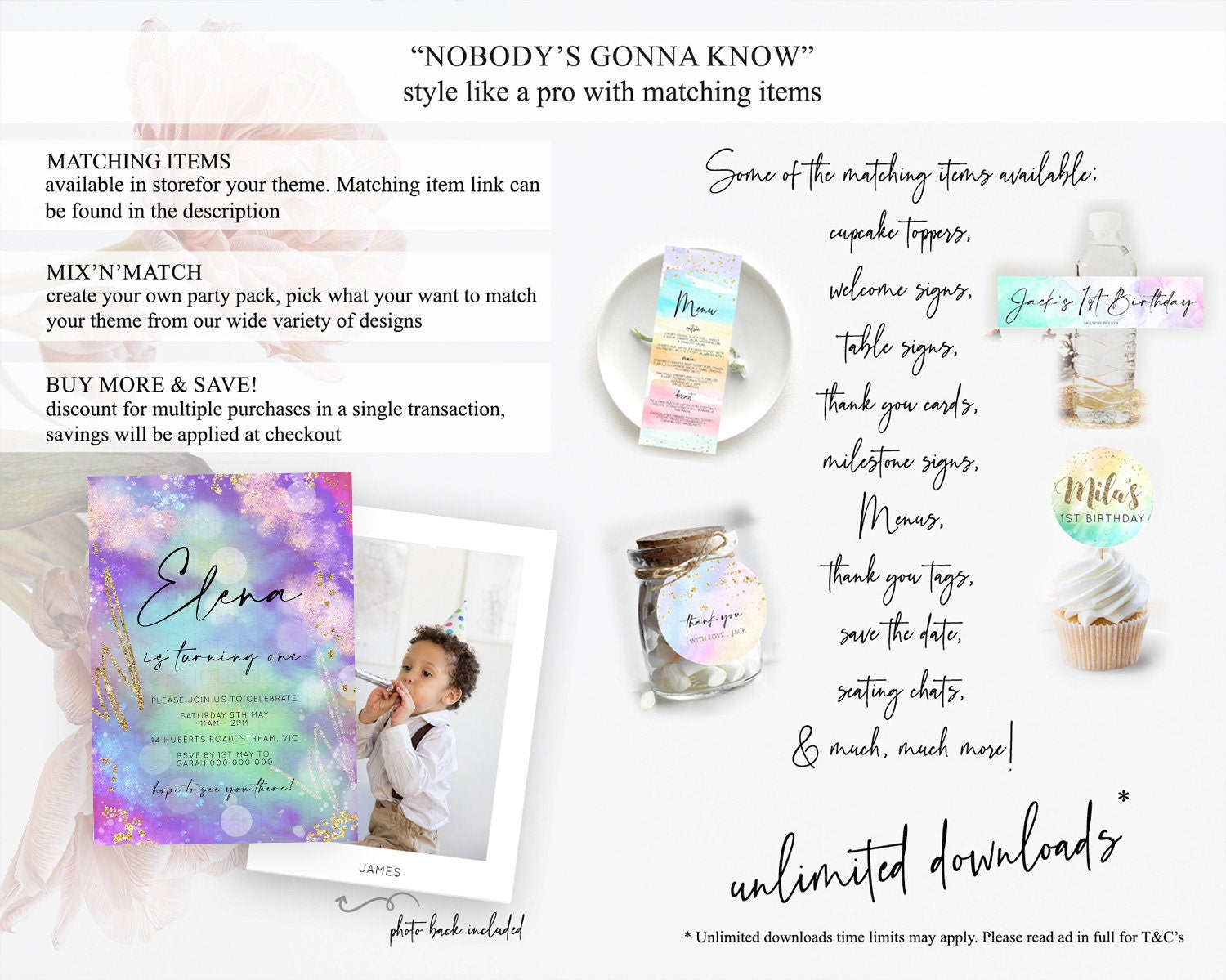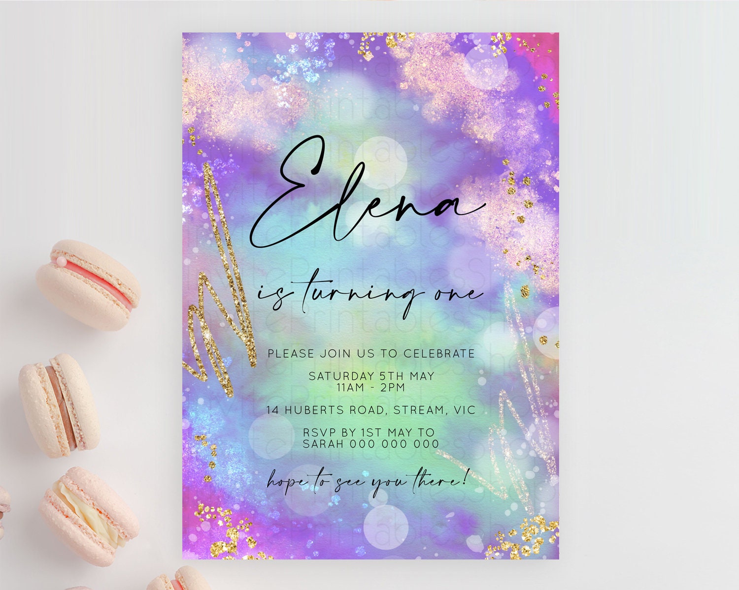 Rainbow Birthday Invitation Colorful Pastel Watercolor Invitation Gold Glitter Sprinkles Ombre Pastel 1st 2nd 3rd Birthday D10680