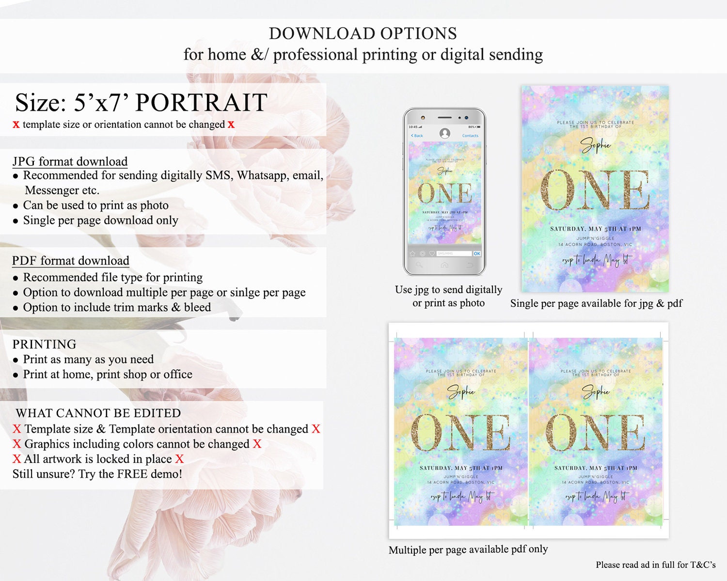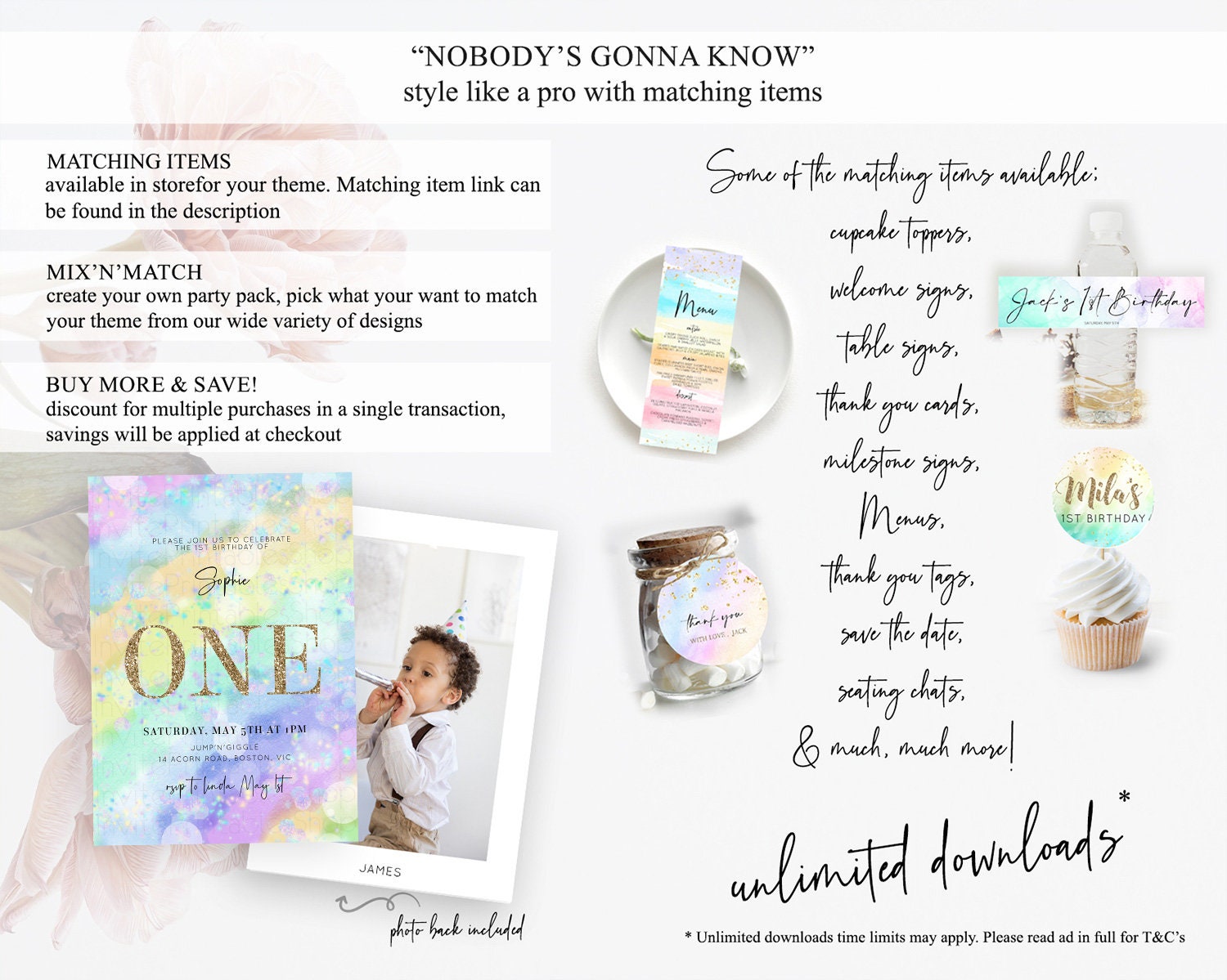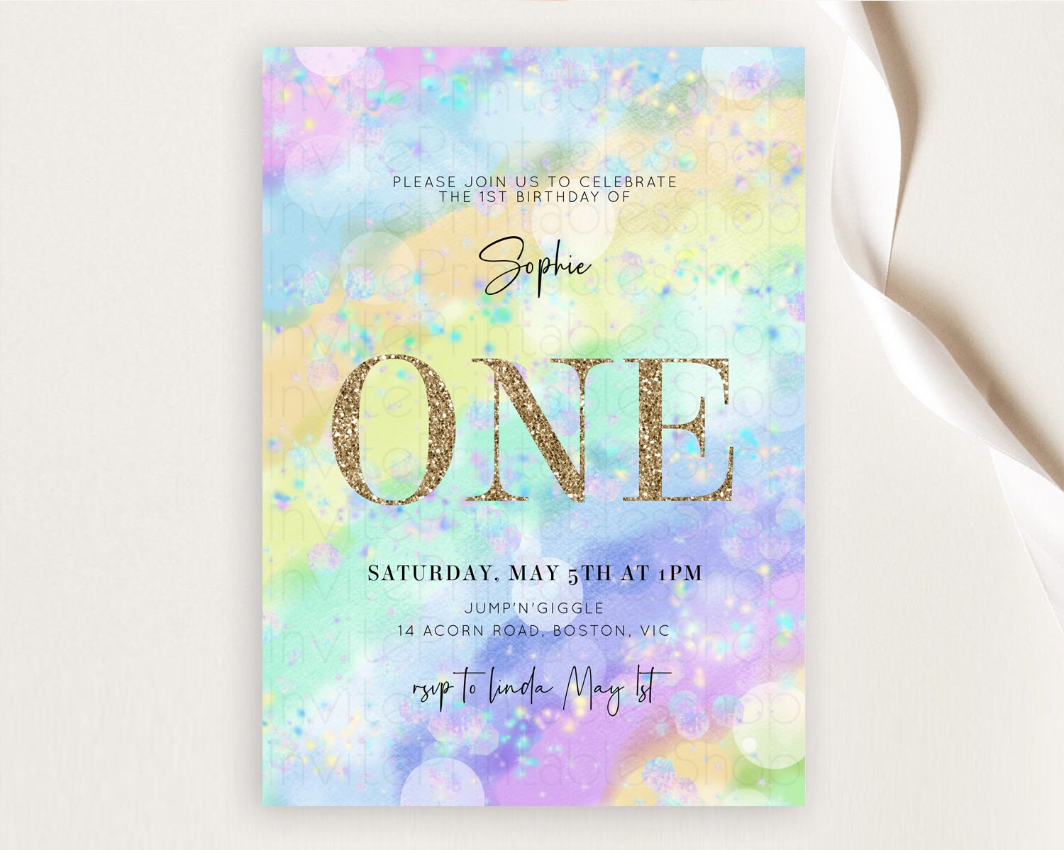 Rainbow Birthday Invitation Colorful Pastel Watercolor Invitation Gold Glitter Sprinkles Ombre Pastel 1st 2nd 3rd Birthday D10689