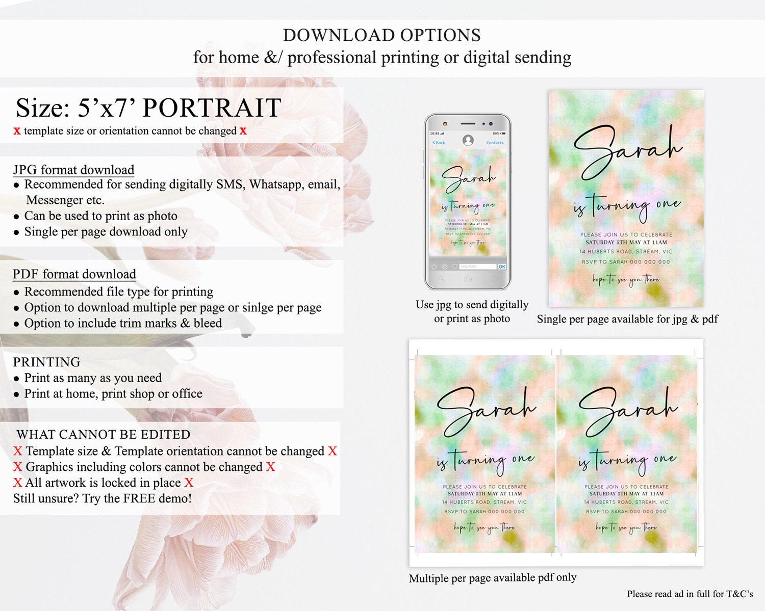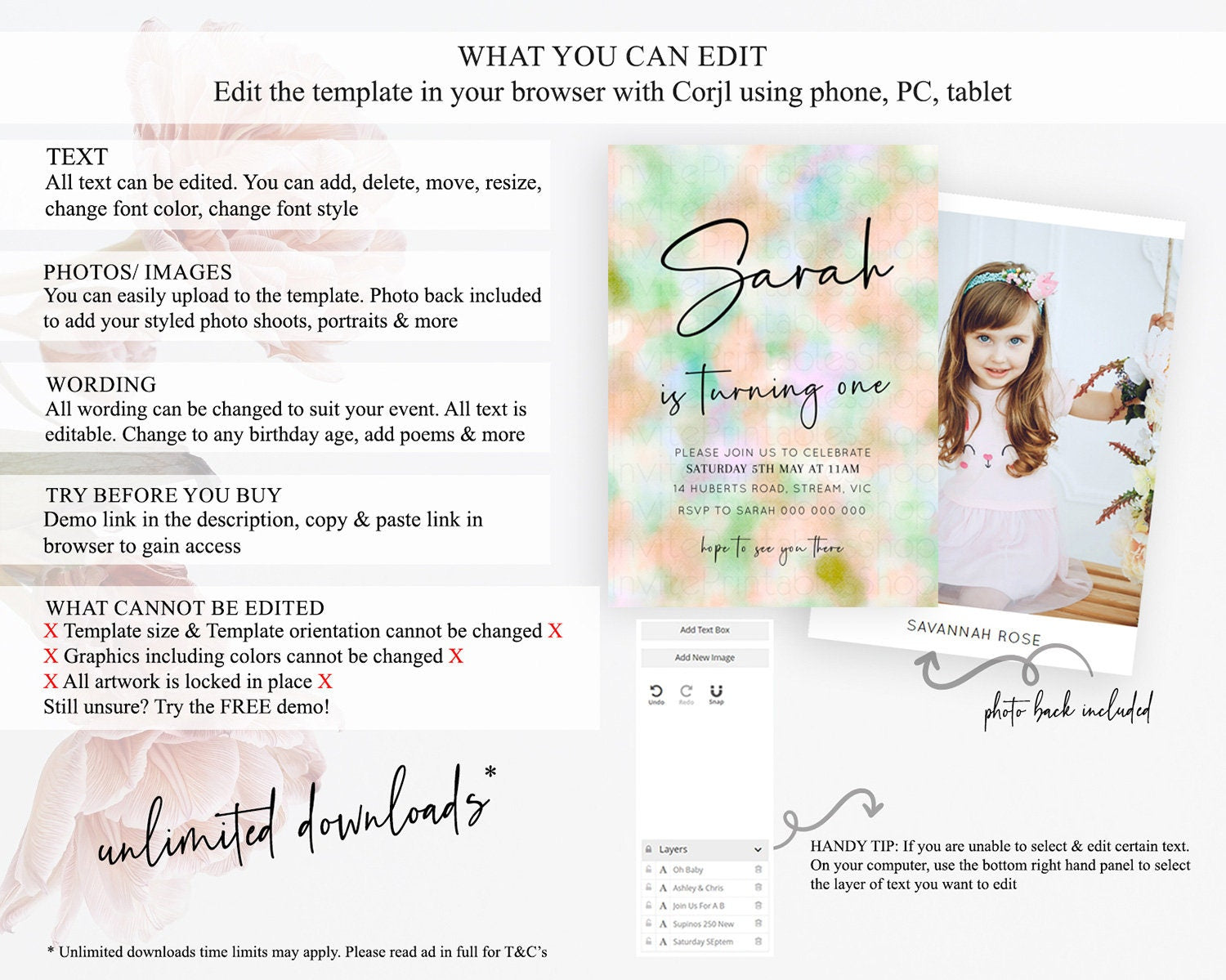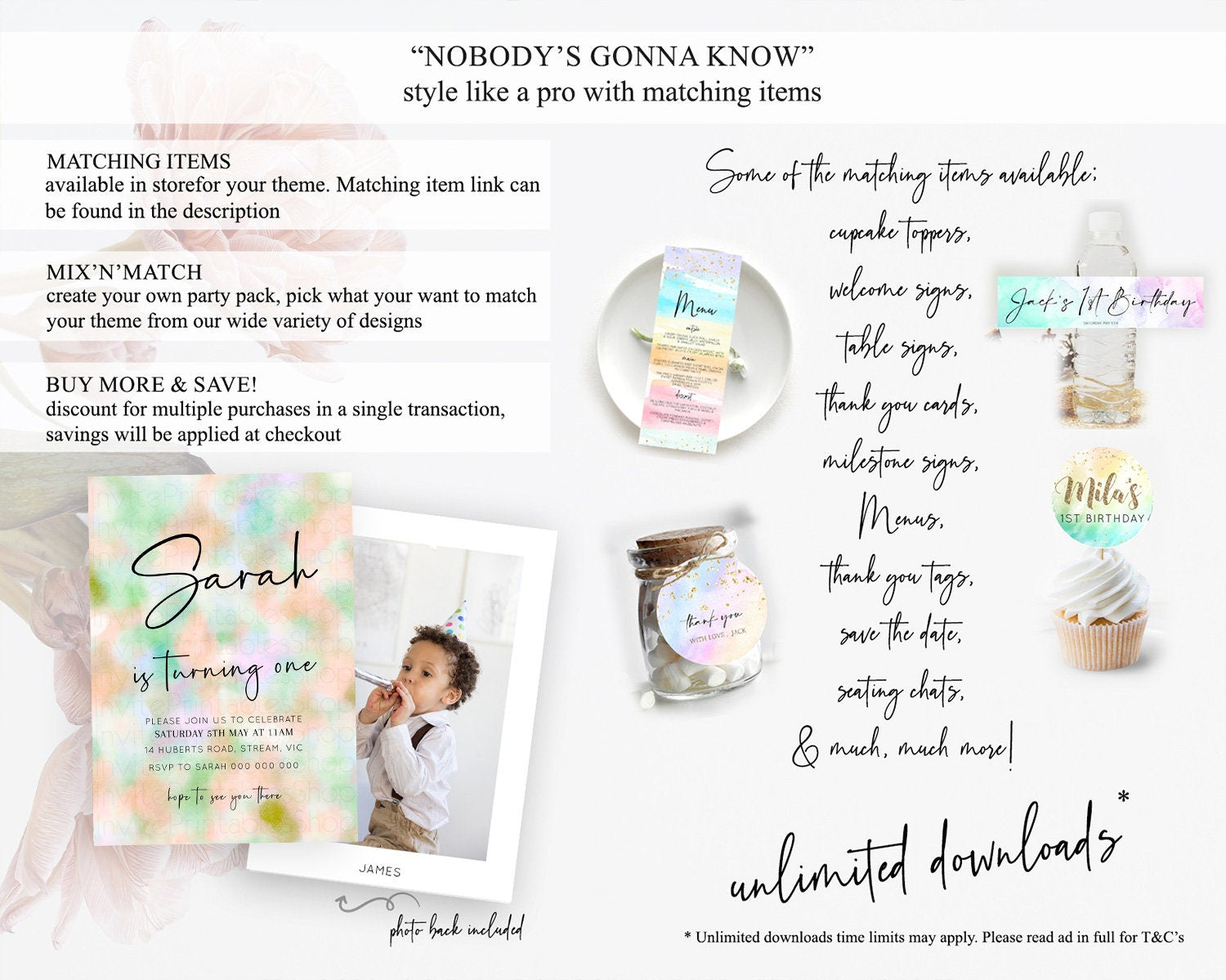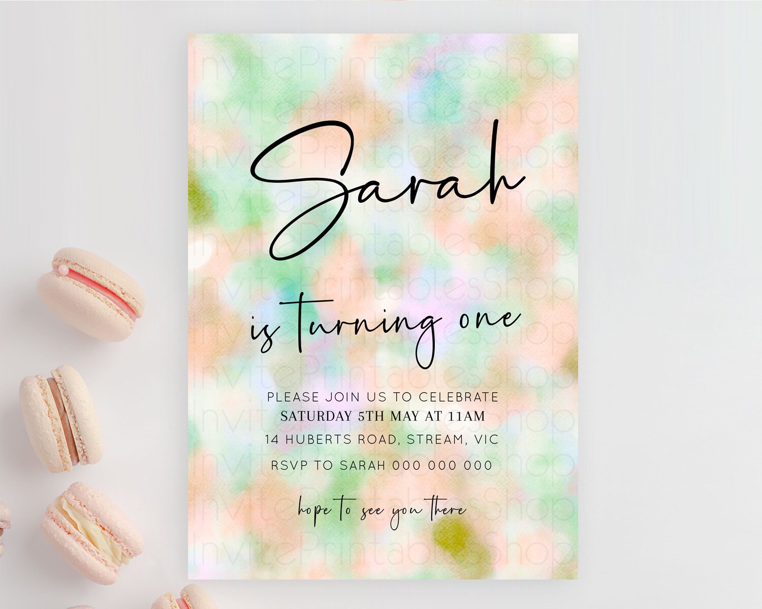 Rainbow Birthday Invitation Colorful Pastel Watercolor Invitation Gold Glitter Sprinkles Ombre Pastel 1st 2nd 3rd Birthday D10693
