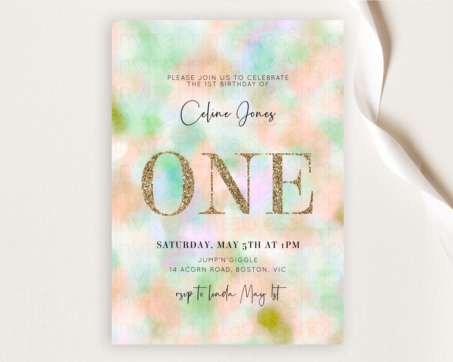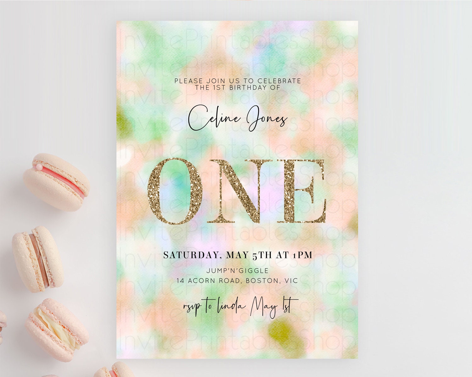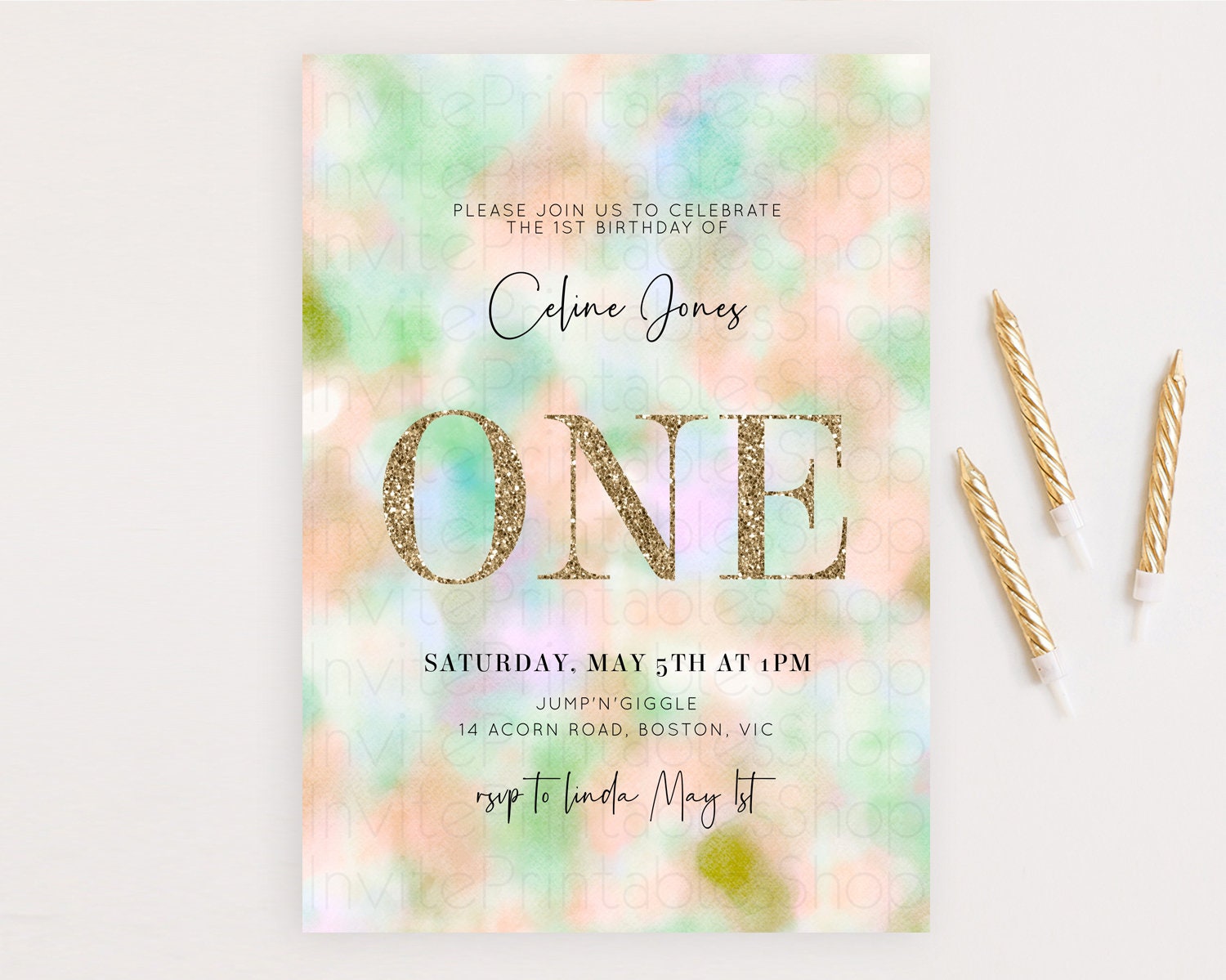 Rainbow Birthday Invitation Colorful Pastel Watercolor Invitation Gold Glitter Sprinkles Ombre Pastel 1st 2nd 3rd Birthday D10693