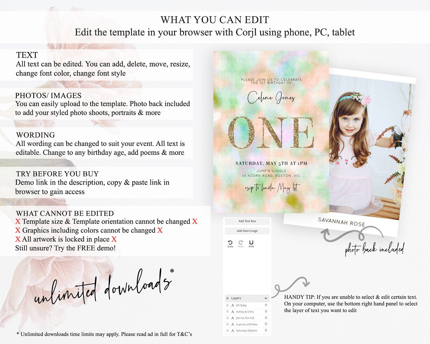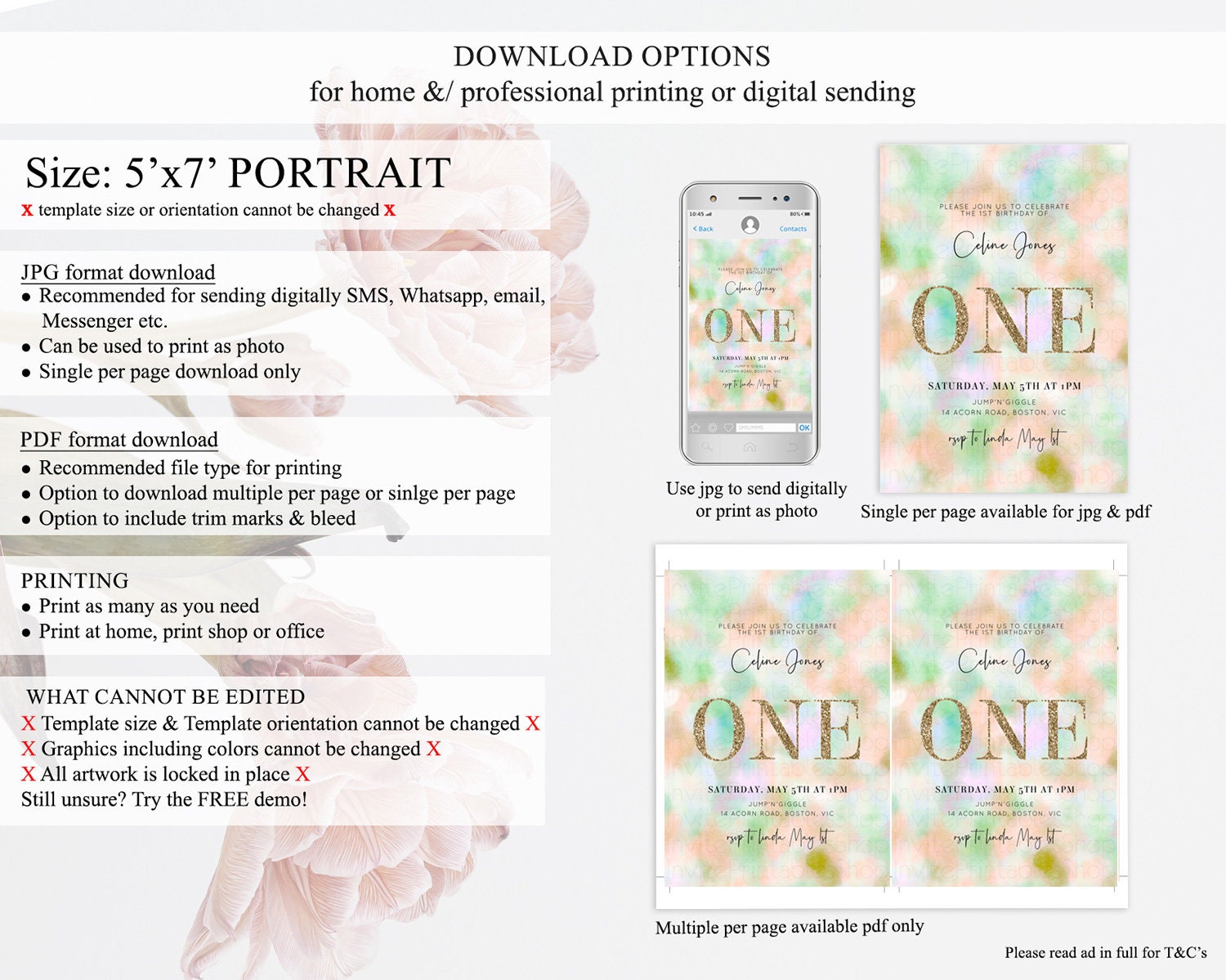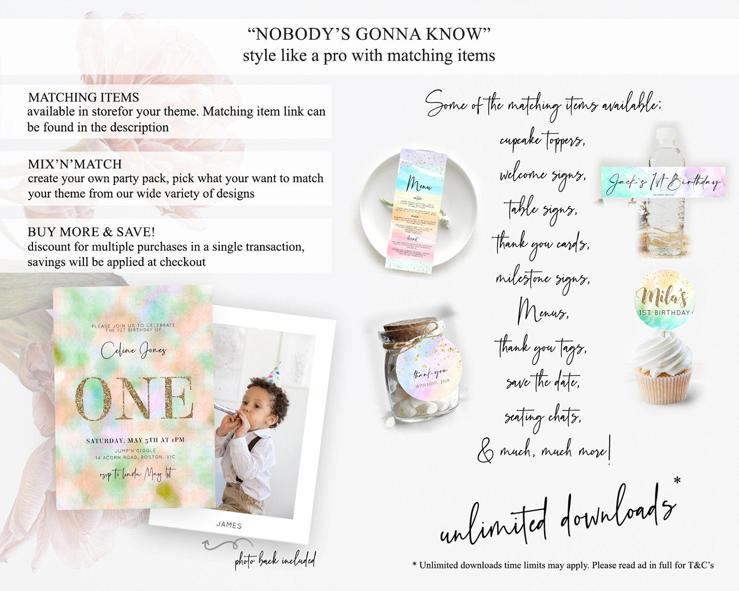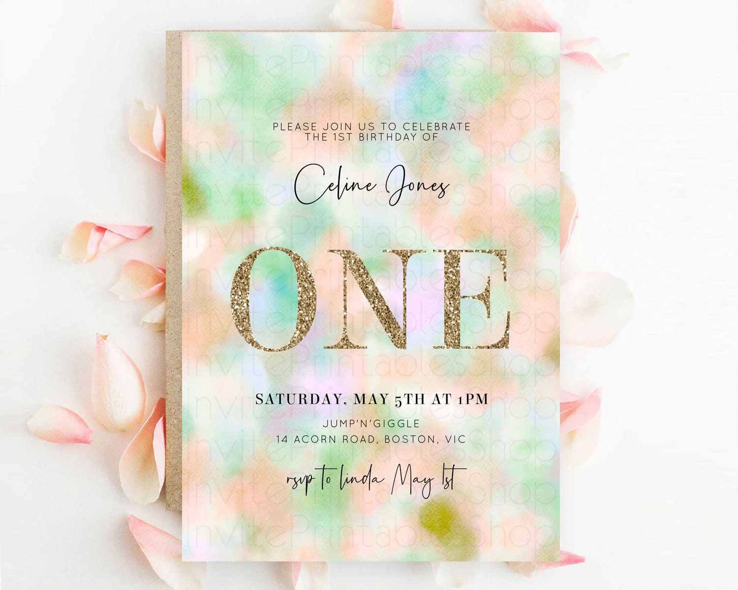 Rainbow Birthday Invitation Colorful Pastel Watercolor Invitation Gold Glitter Sprinkles Ombre Pastel 1st 2nd 3rd Birthday D10693