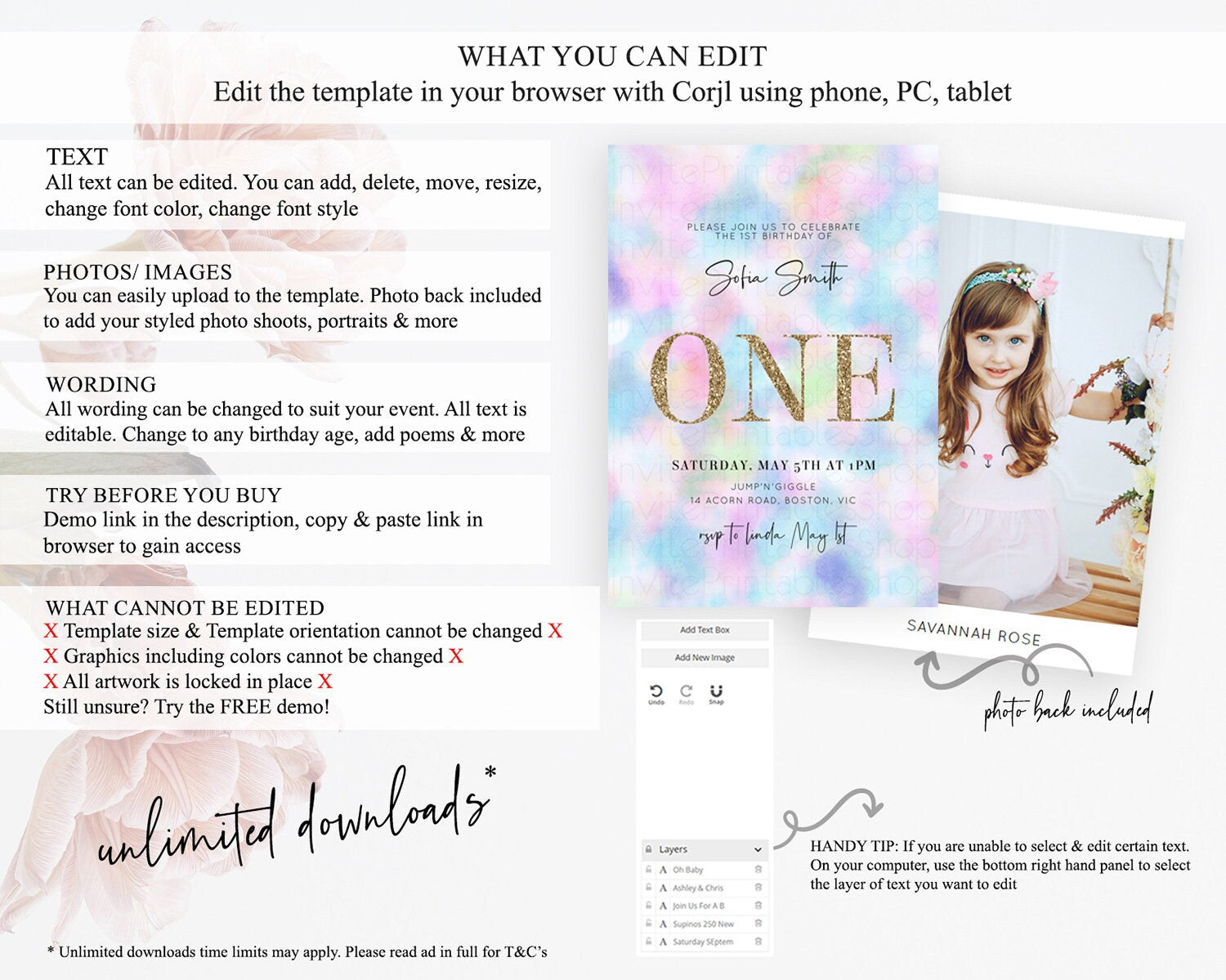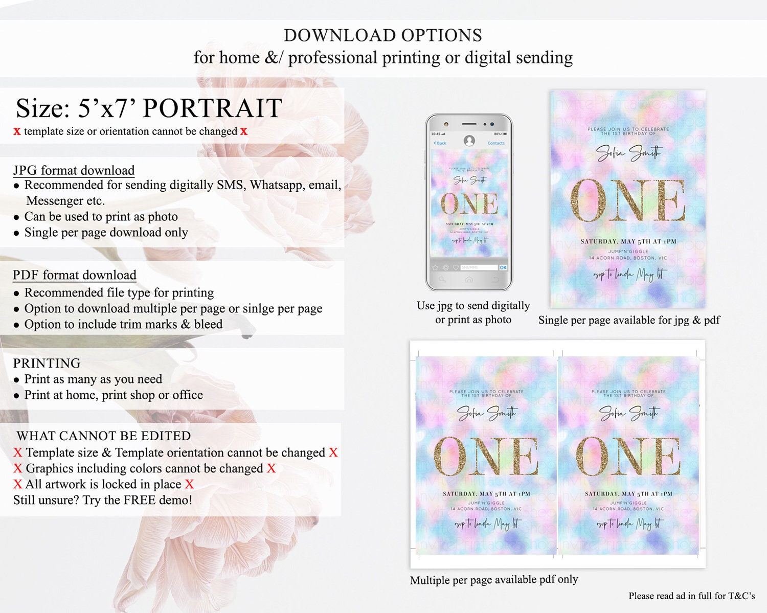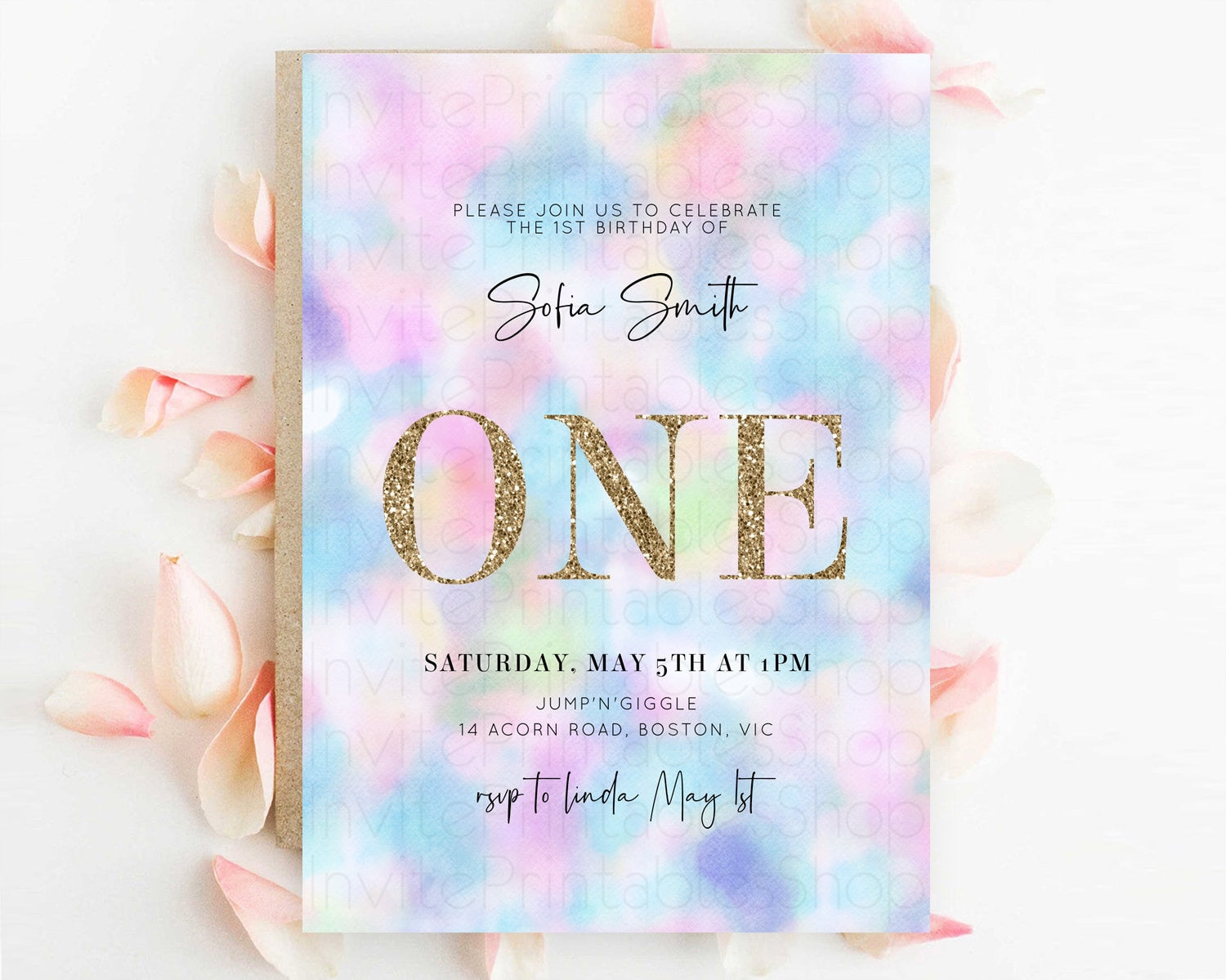 Rainbow Birthday Invitation Colorful Pastel Watercolor Invitation Gold Glitter Sprinkles Ombre Pastel 1st 2nd 3rd Birthday D10694