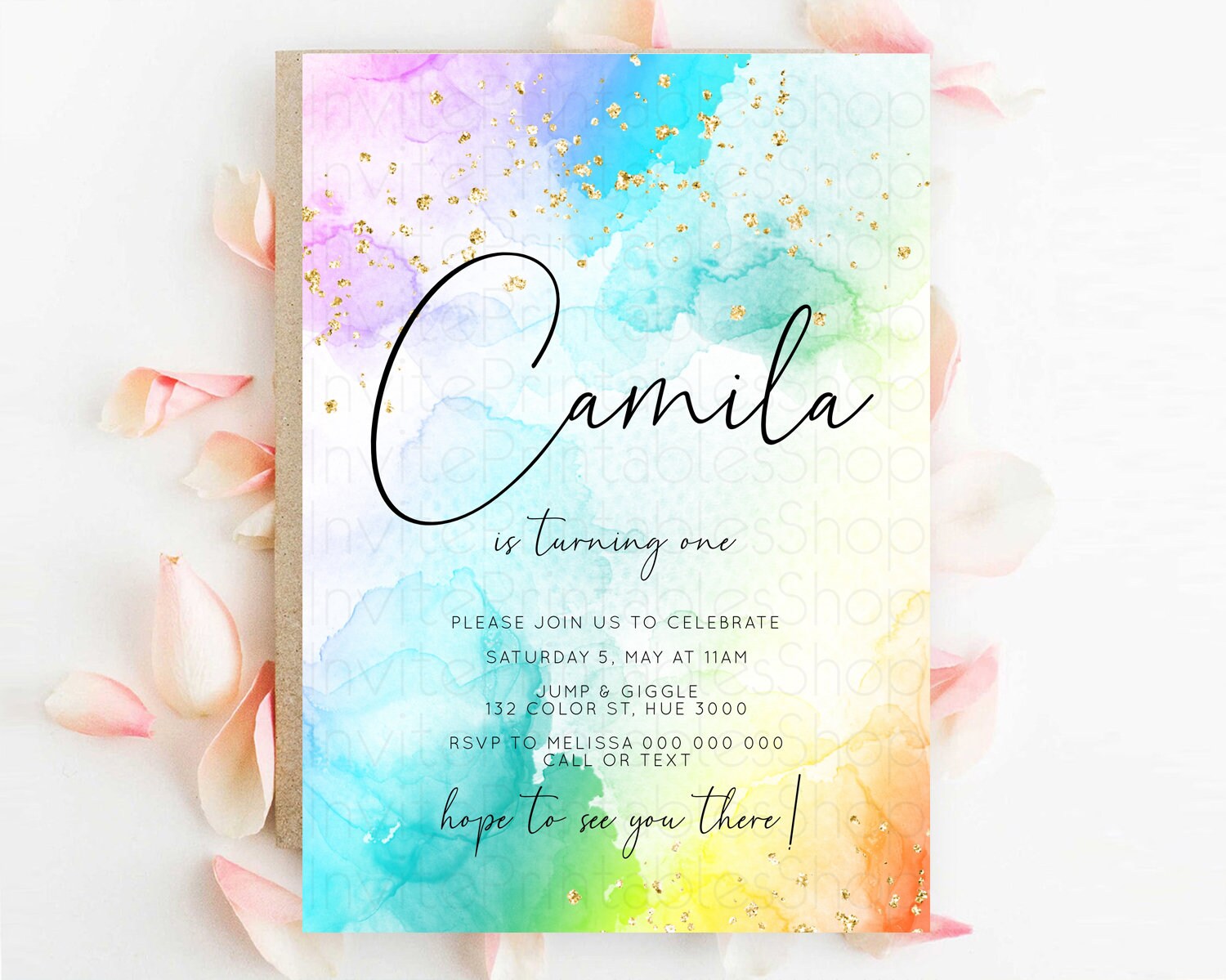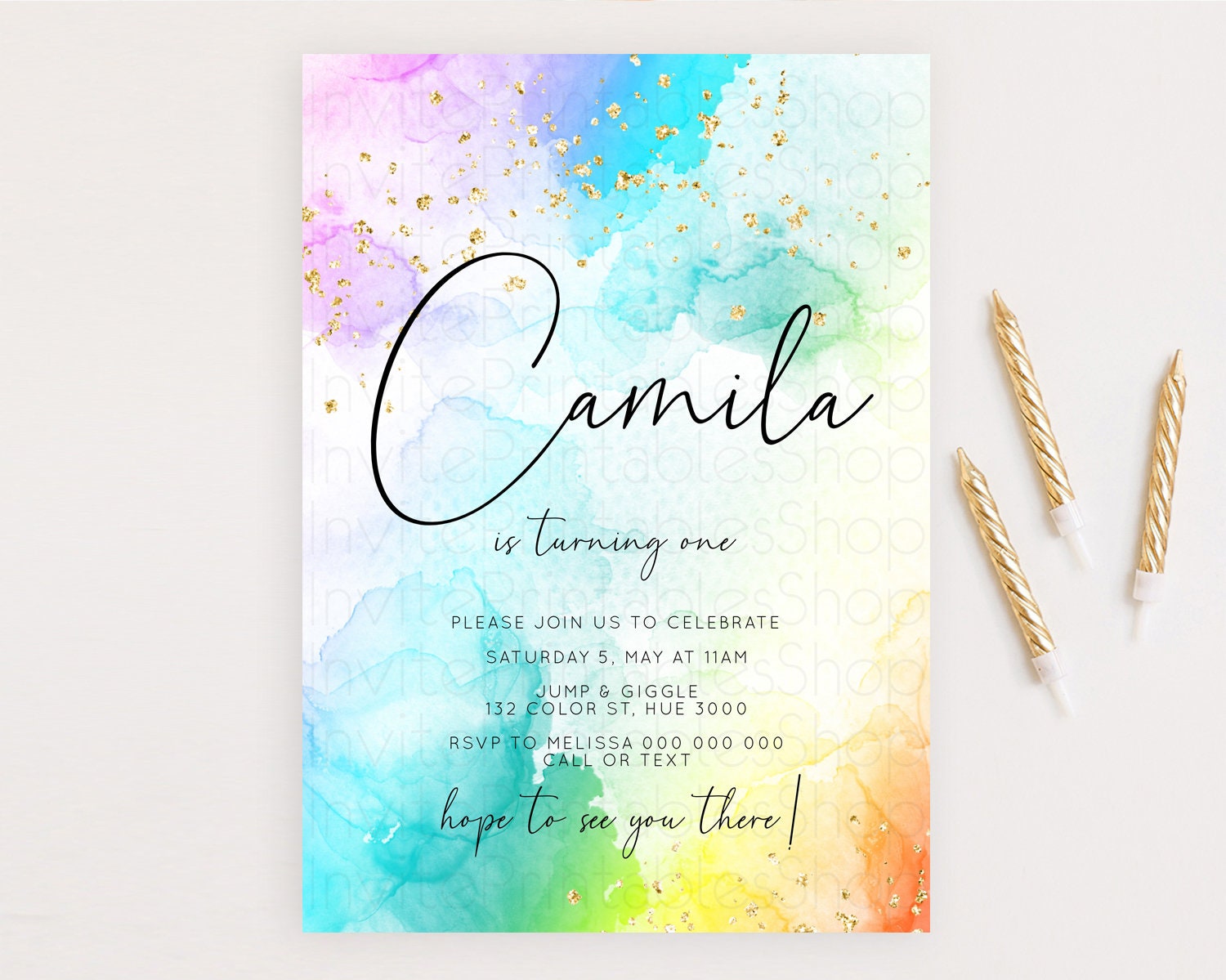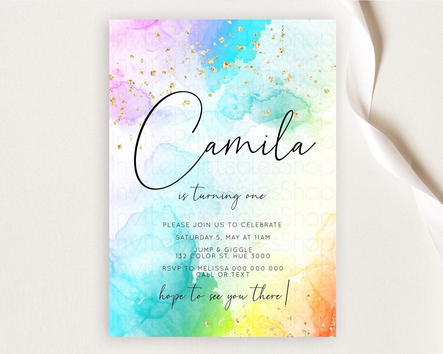 Rainbow Birthday Invitation Colorful Pastel Watercolor Invitation Gold Glitter Sprinkles Ombre Pastel 1st 2nd 3rd Birthday D10771