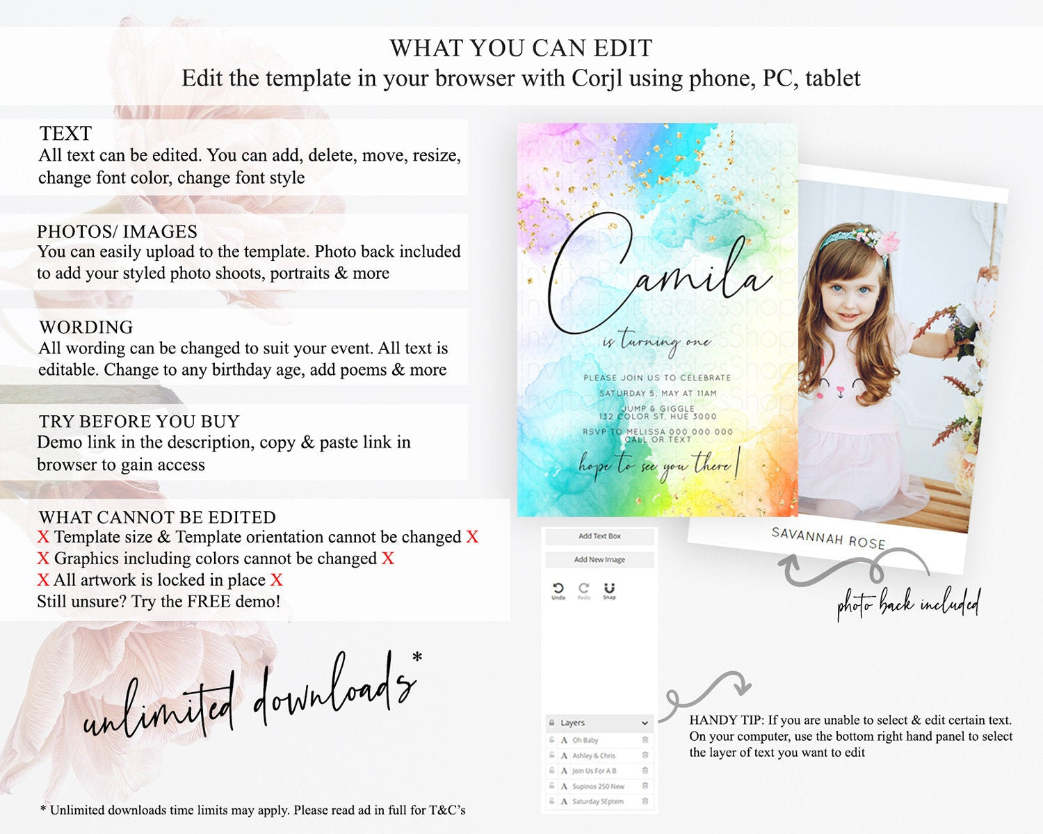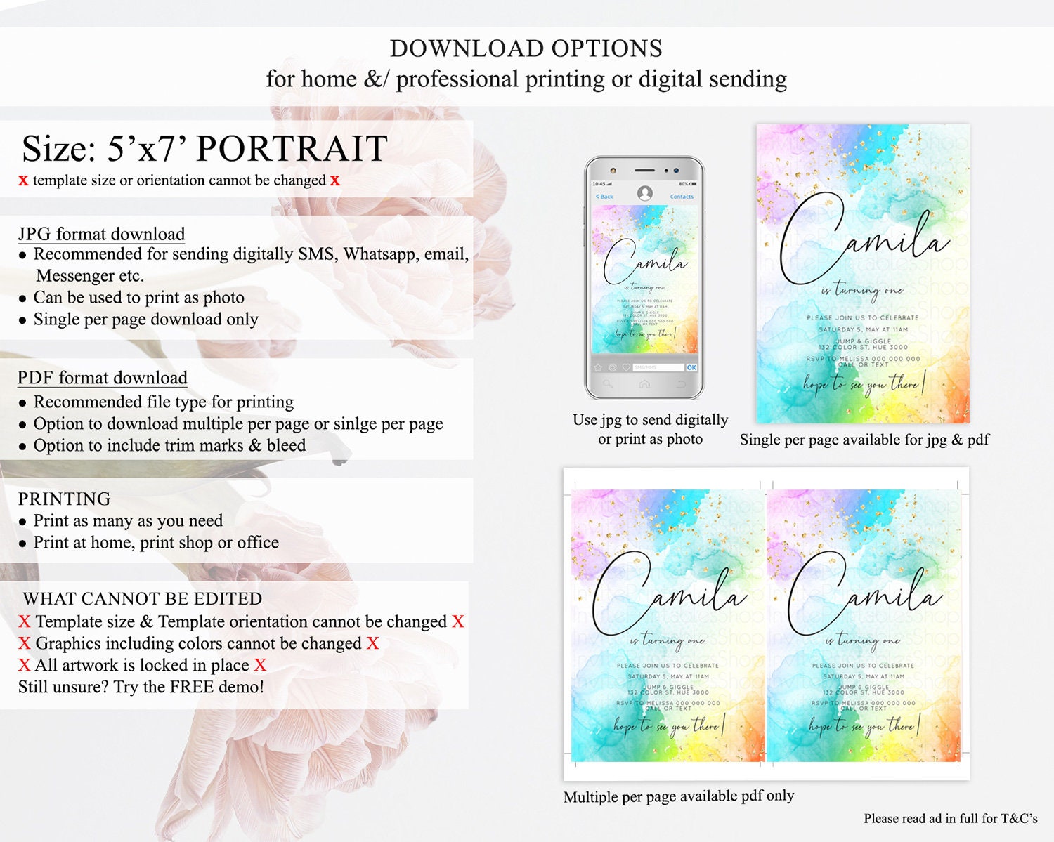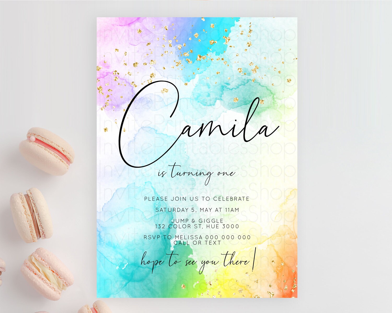 Rainbow Birthday Invitation Colorful Pastel Watercolor Invitation Gold Glitter Sprinkles Ombre Pastel 1st 2nd 3rd Birthday D10771
