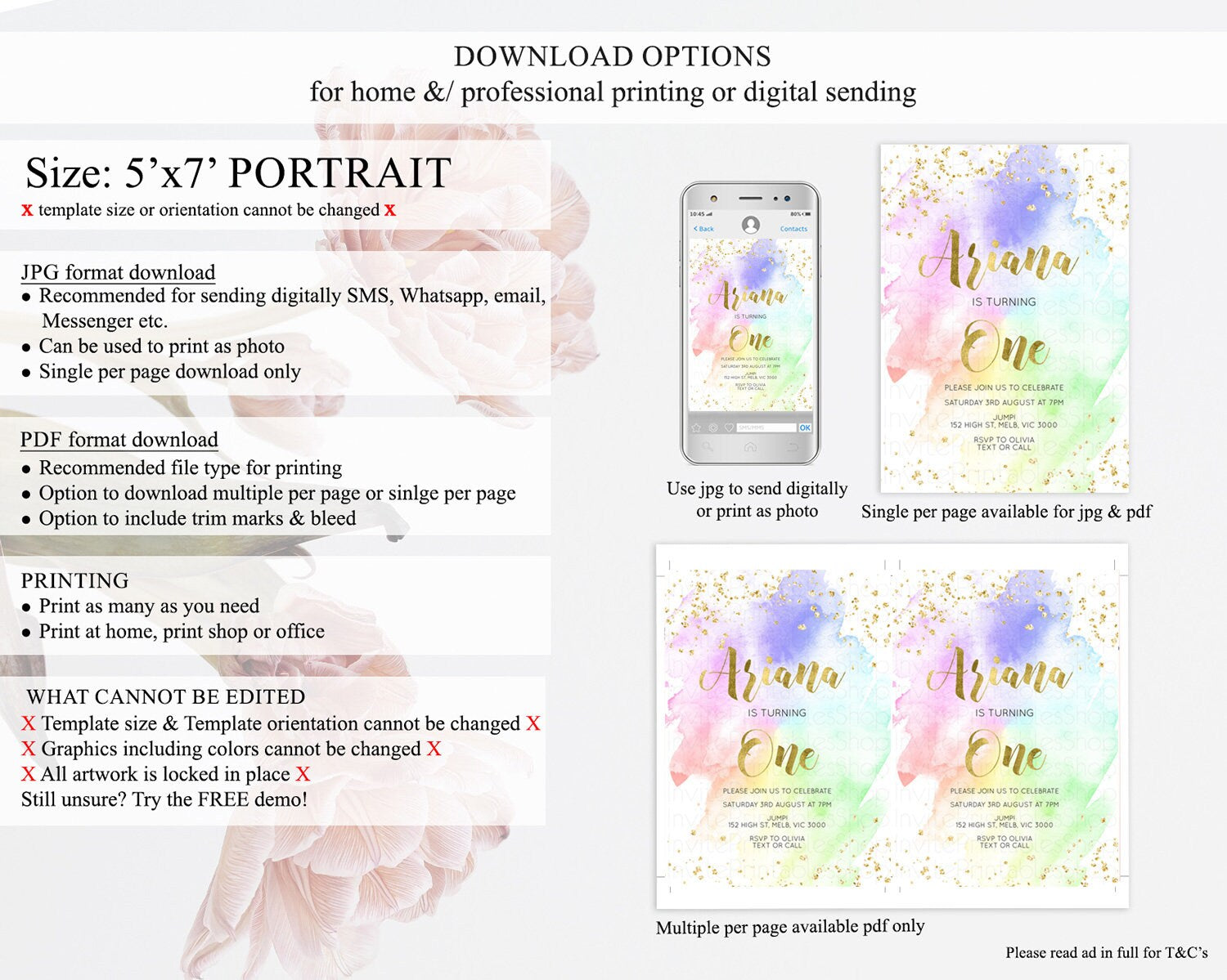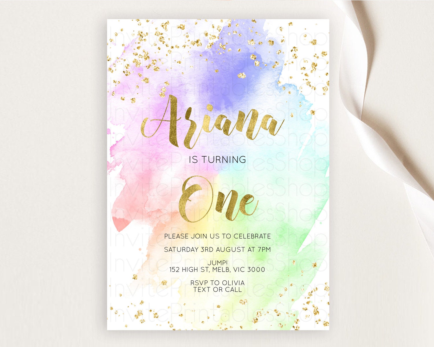 Rainbow Birthday Invitation Colorful Pastel Watercolor Invitation Gold Glitter Sprinkles Ombre Pastel 1st 2nd 3rd Birthday D10876
