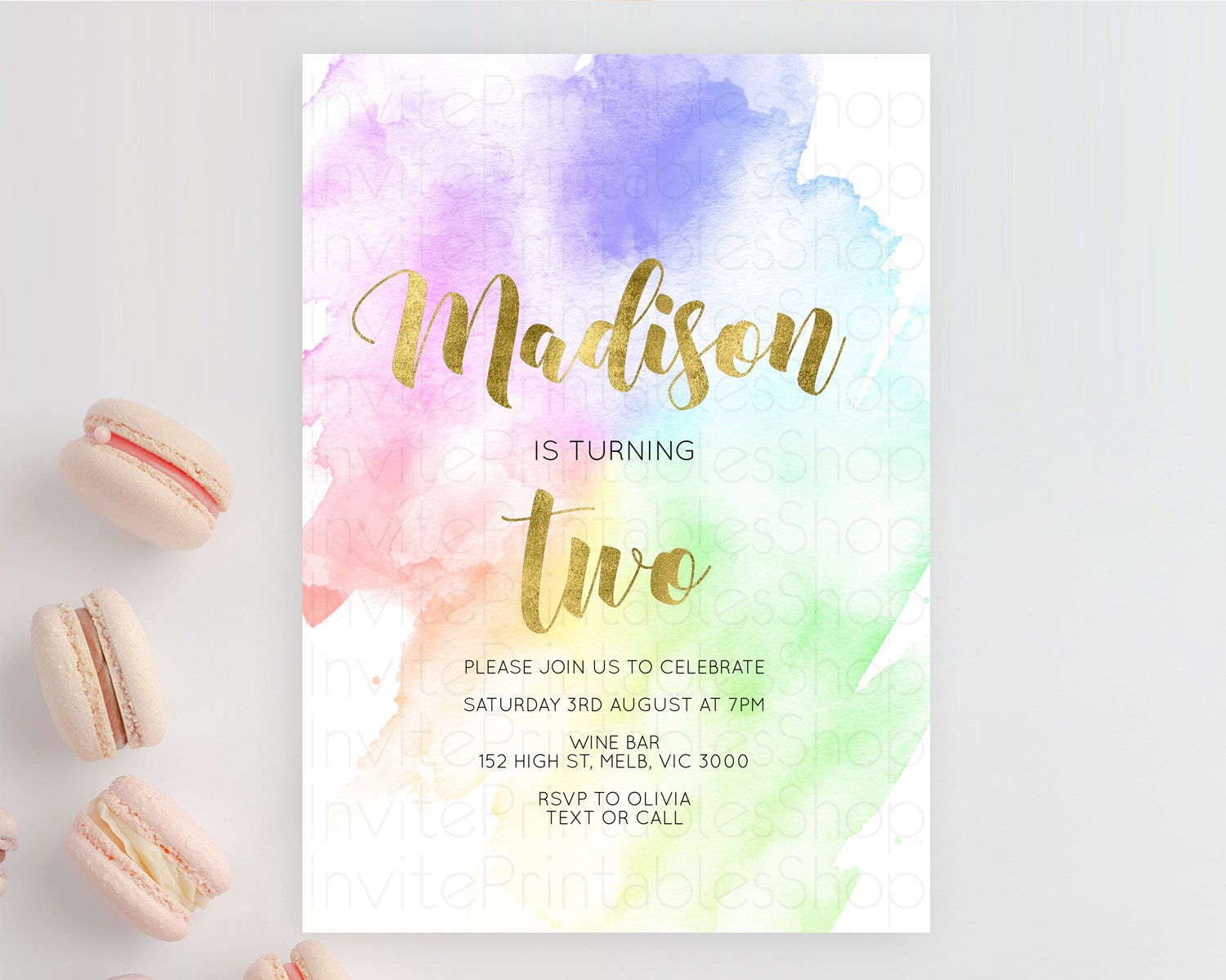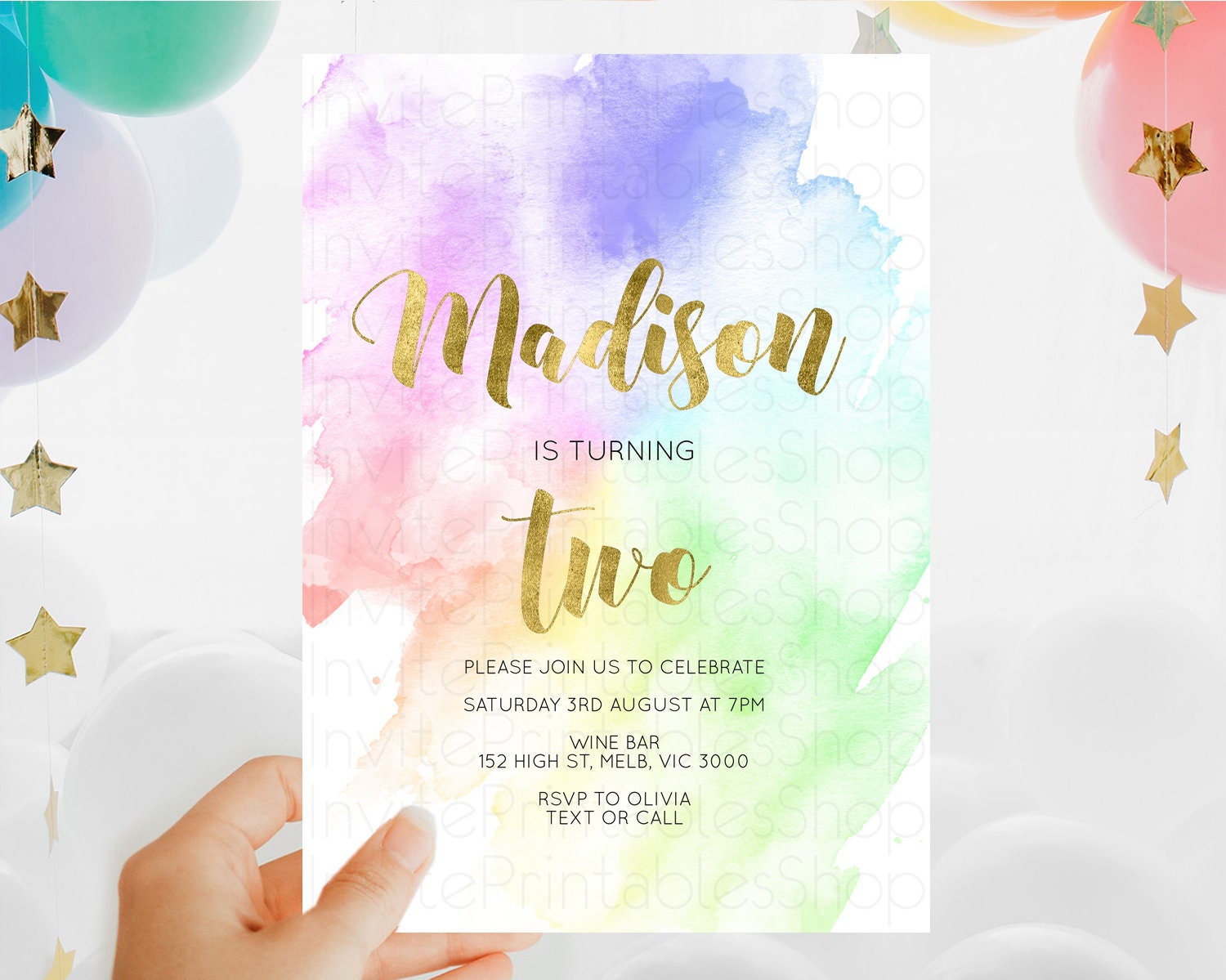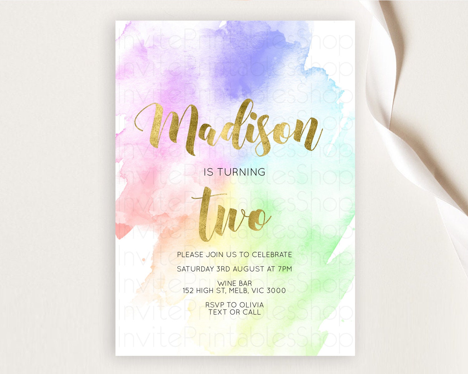 Rainbow Birthday Invitation Colorful Pastel Watercolor Invitation Gold Glitter Sprinkles Ombre Pastel 1st 2nd 3rd Birthday D10876