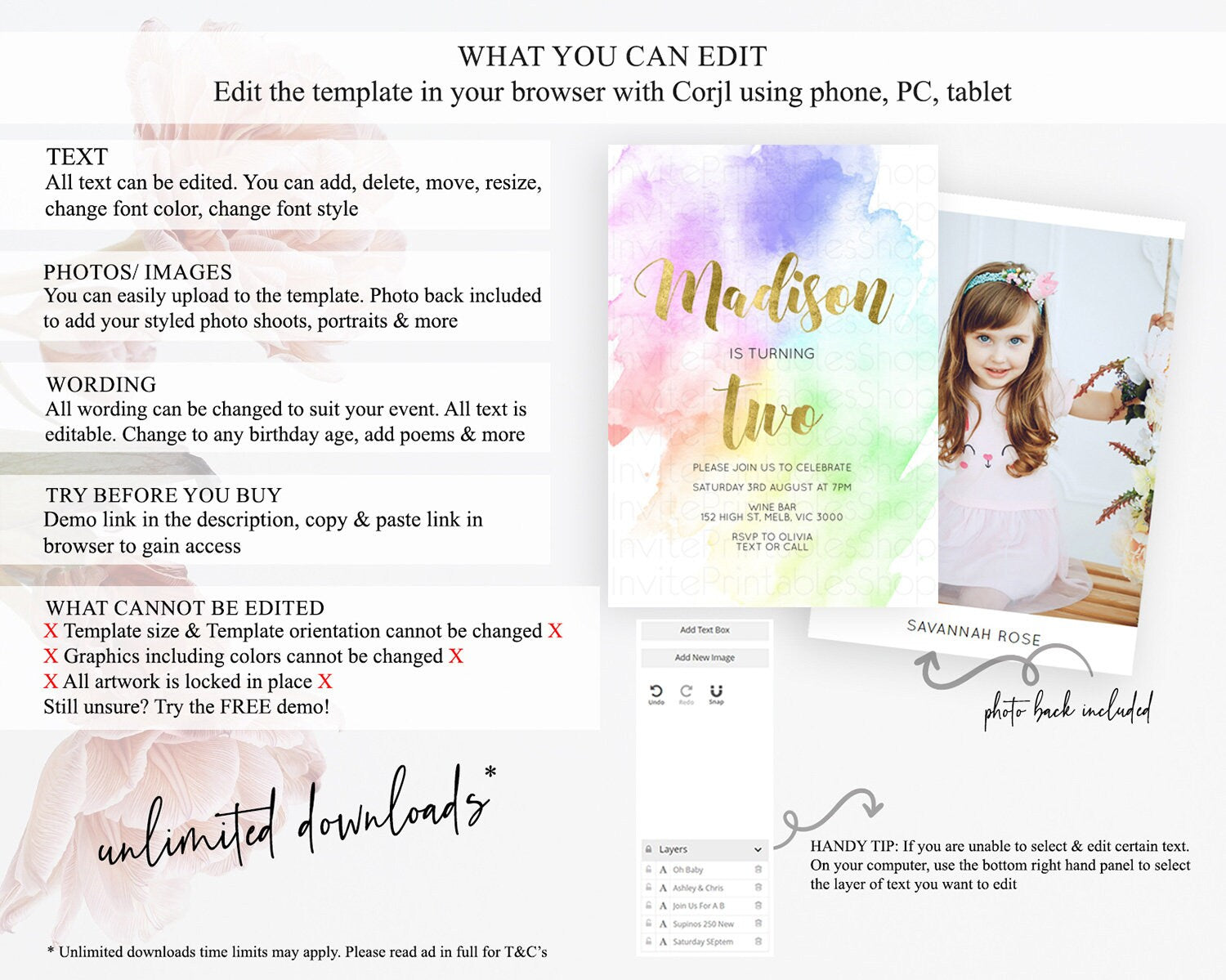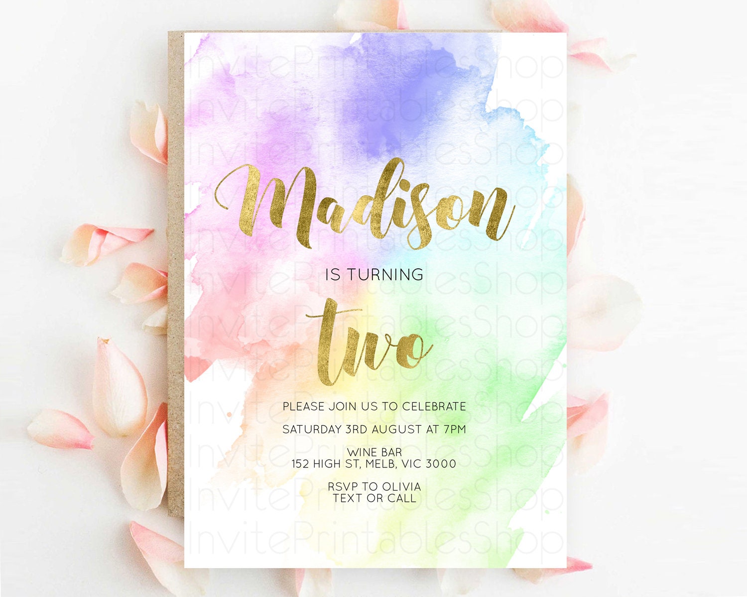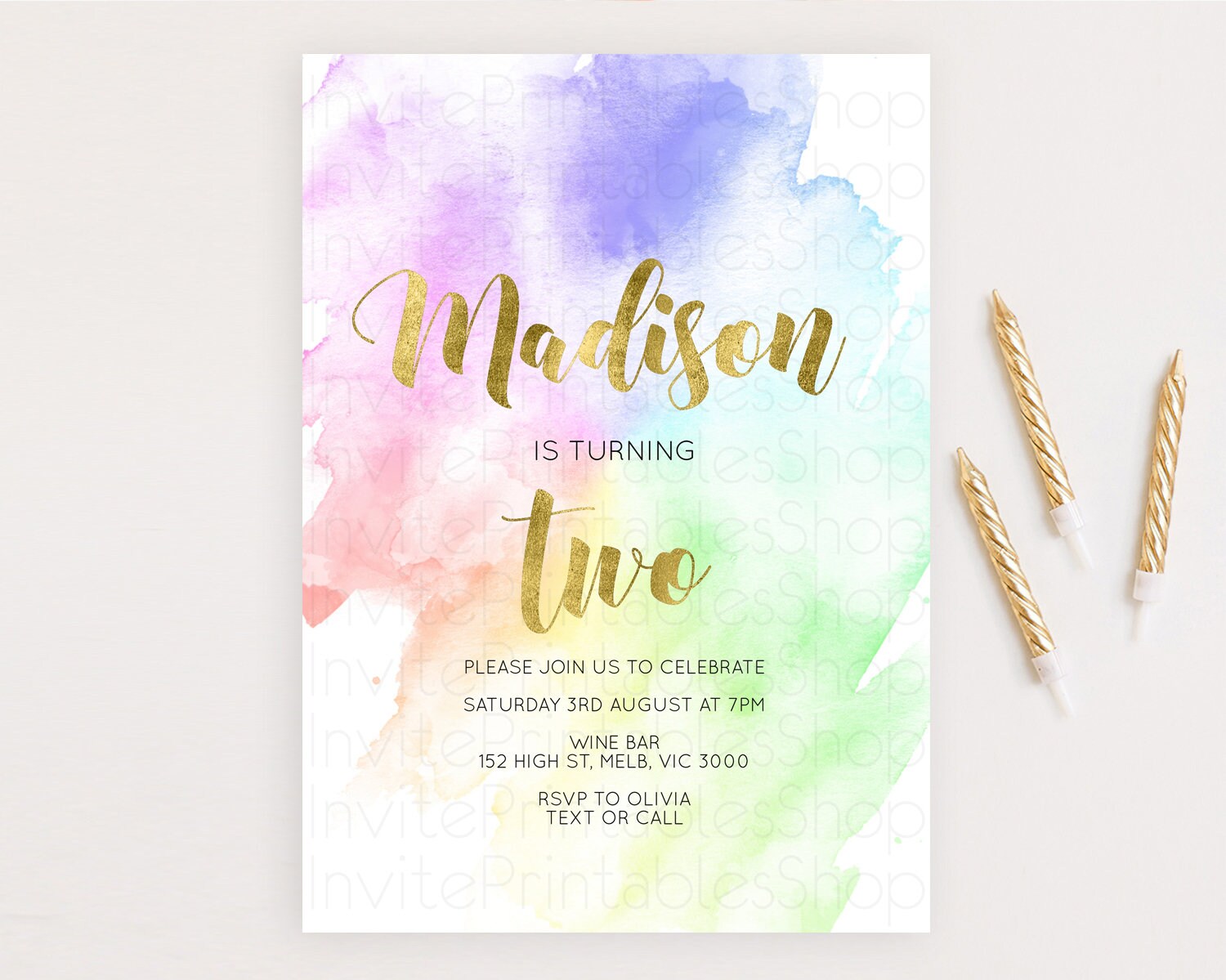 Rainbow Birthday Invitation Colorful Pastel Watercolor Invitation Gold Glitter Sprinkles Ombre Pastel 1st 2nd 3rd Birthday D10876