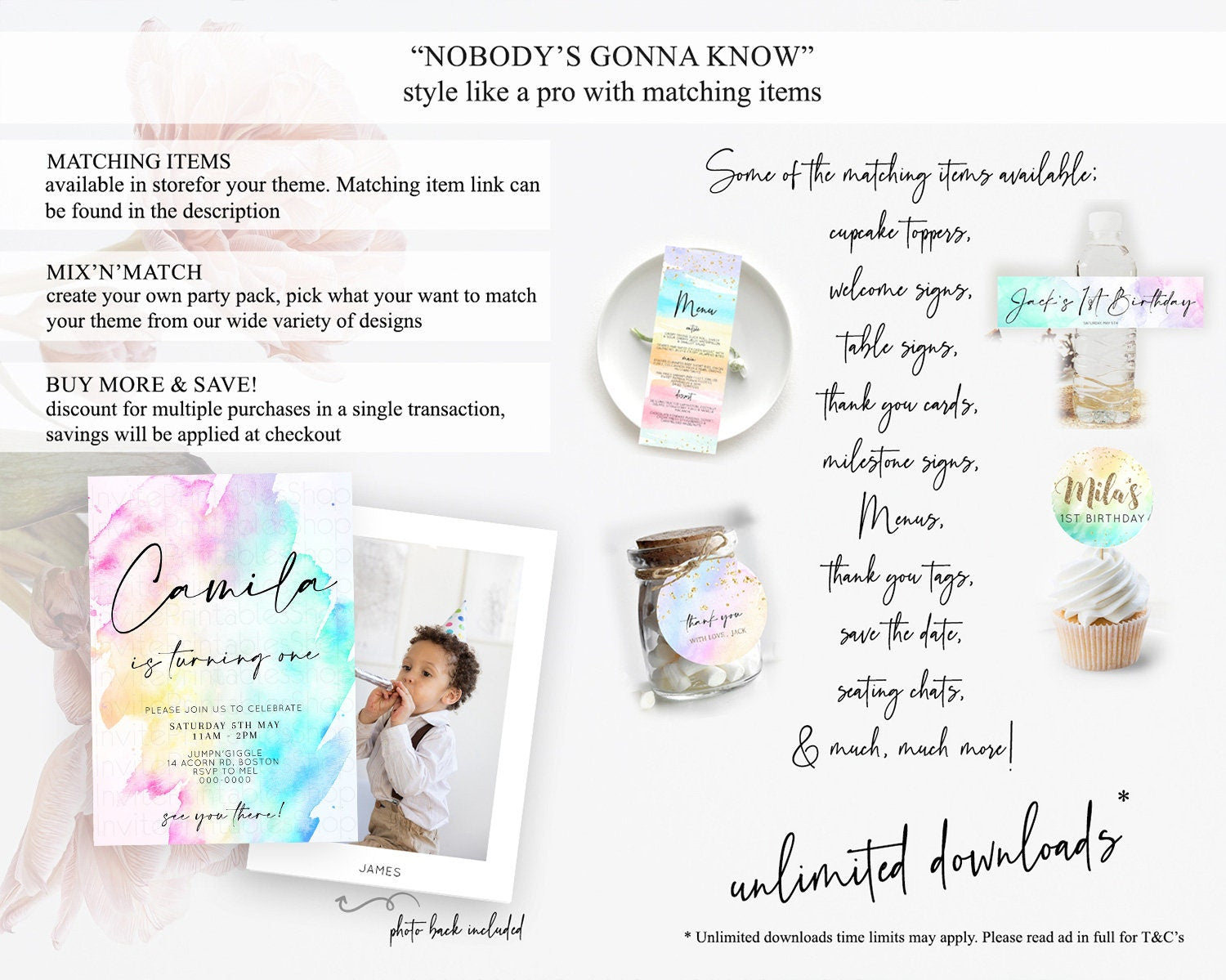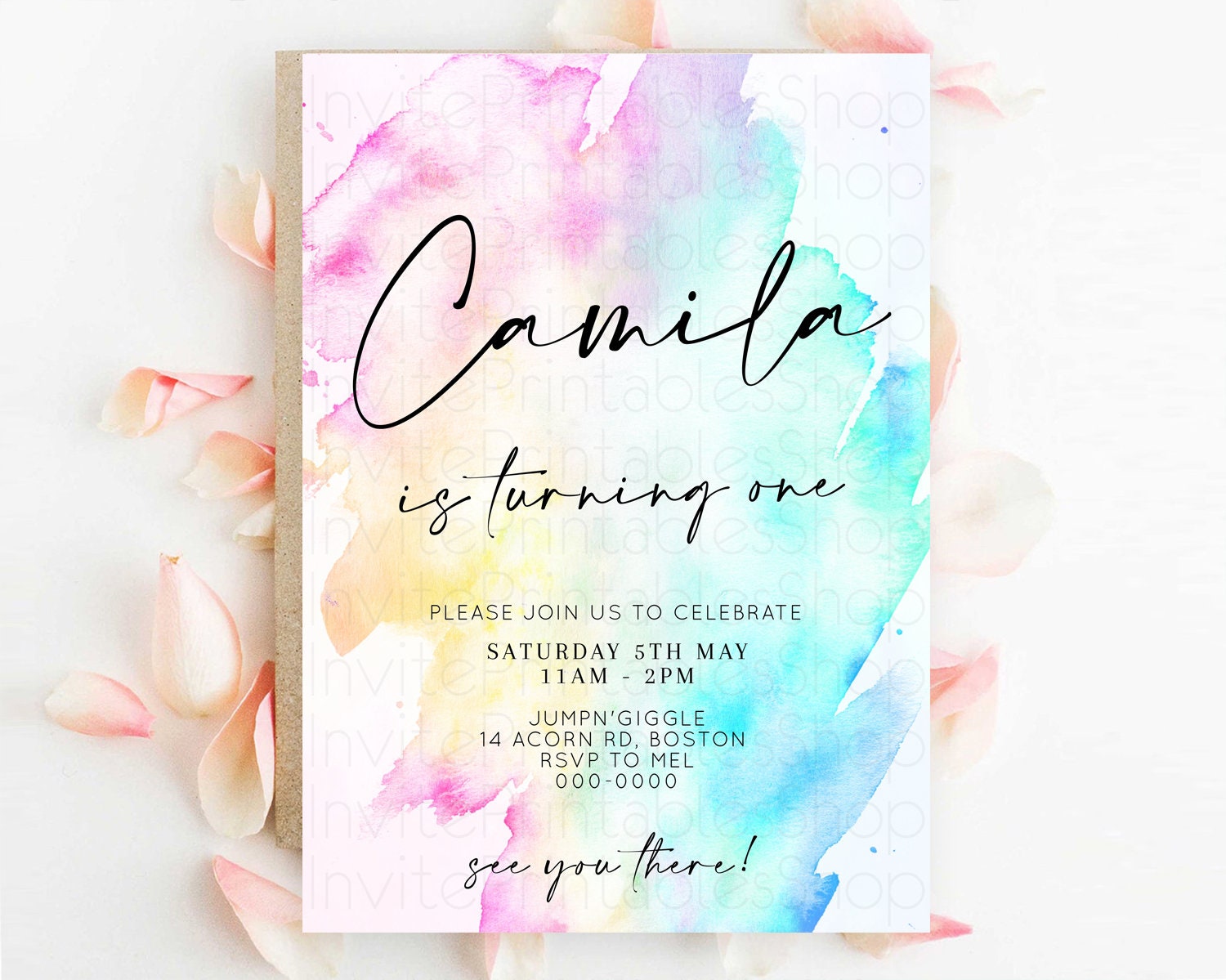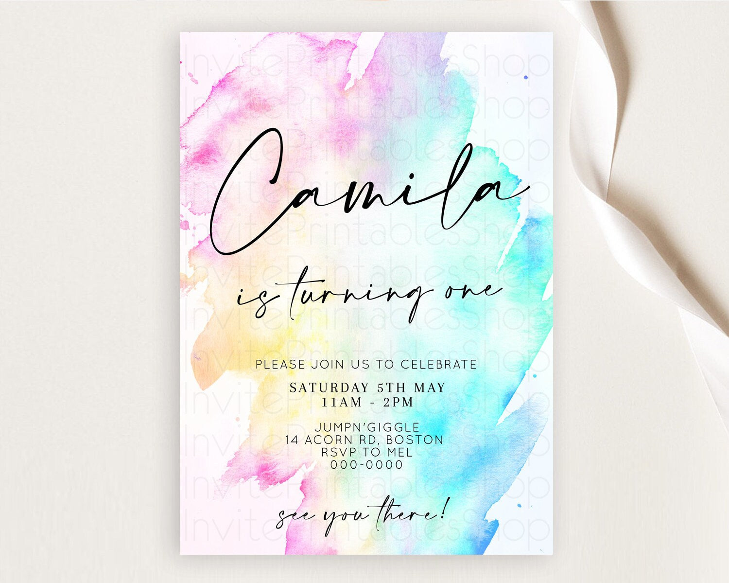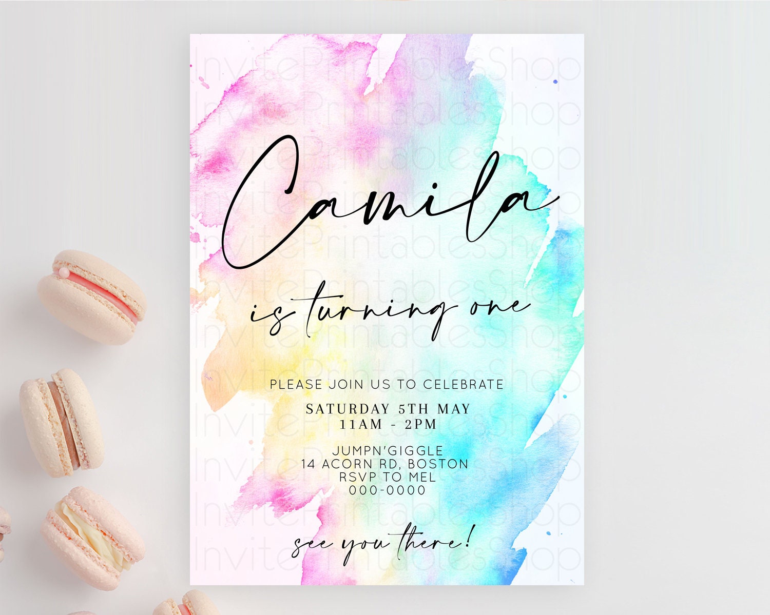 Rainbow Birthday Invitation Colorful Pastel Watercolor Invitation Gold Glitter Sprinkles Ombre Pastel 1st 2nd 3rd Birthday D11020