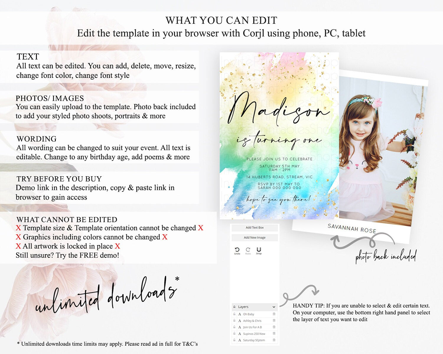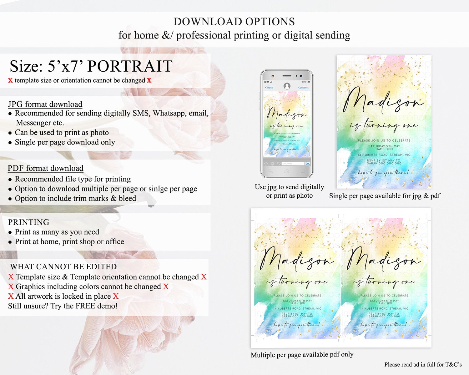 Rainbow Birthday Invitation Colorful Pastel Watercolor Invitation Gold Glitter Sprinkles Ombre Pastel 1st 2nd 3rd Birthday D11028