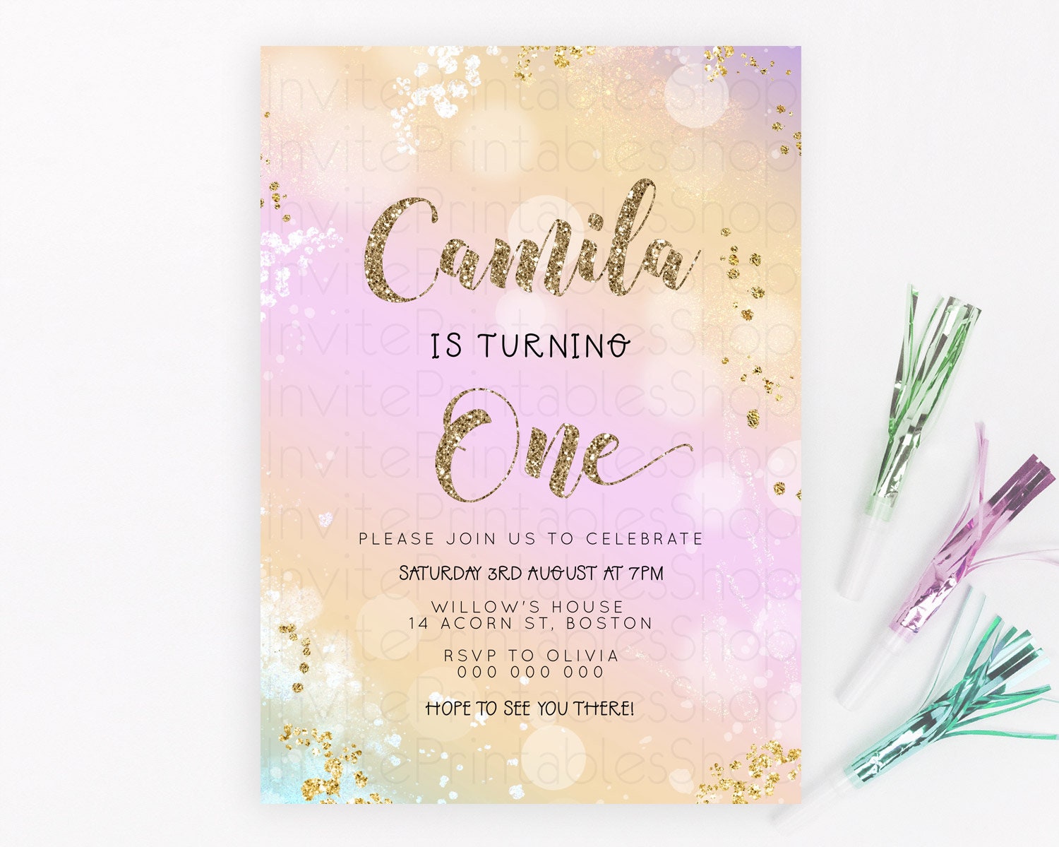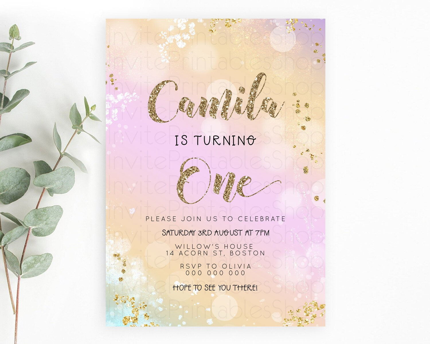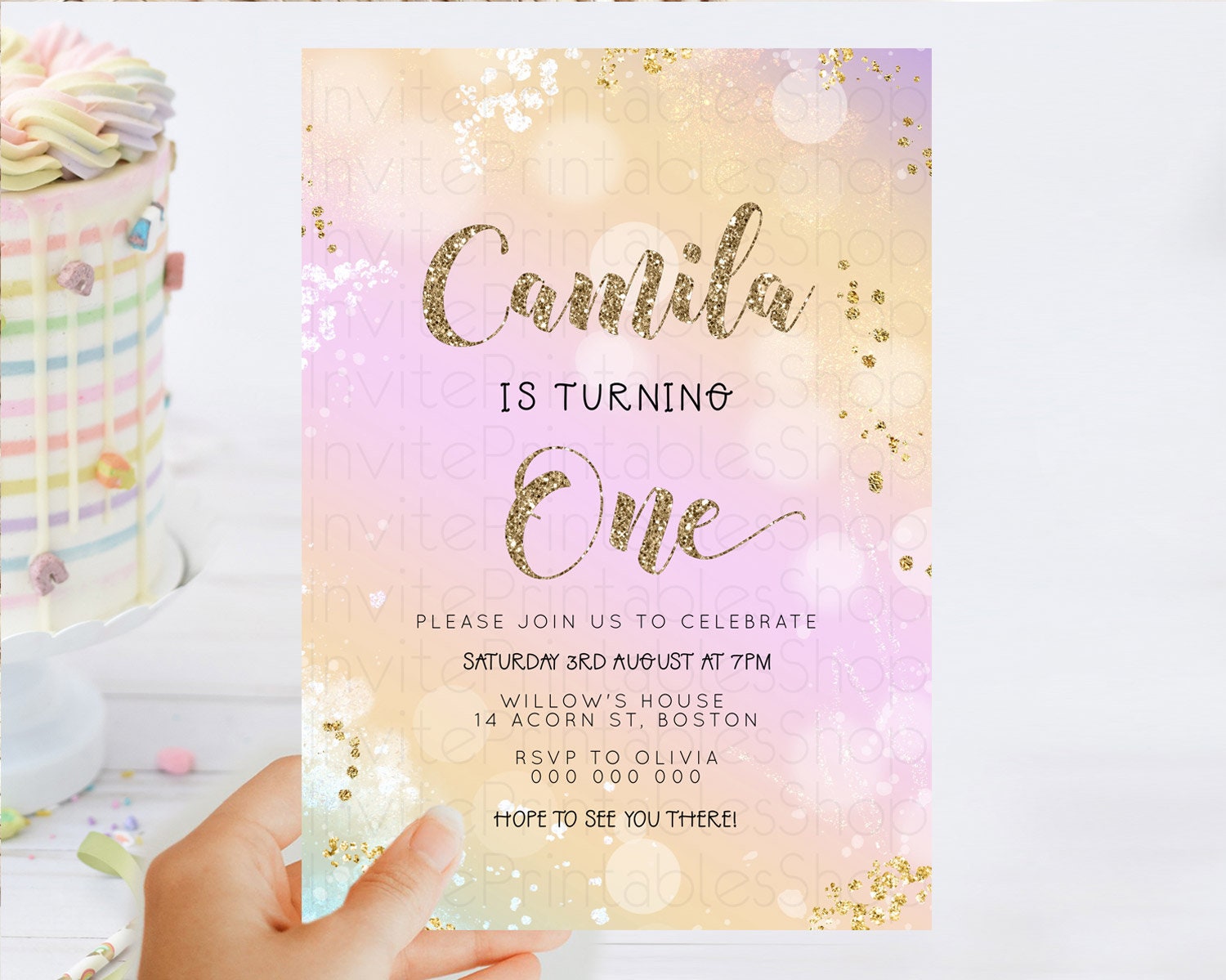 Rainbow Birthday Invitation Colorful Pastel Watercolor Invitation Gold Glitter Sprinkles Ombre Pastel 1st 2nd 3rd Birthday D23122