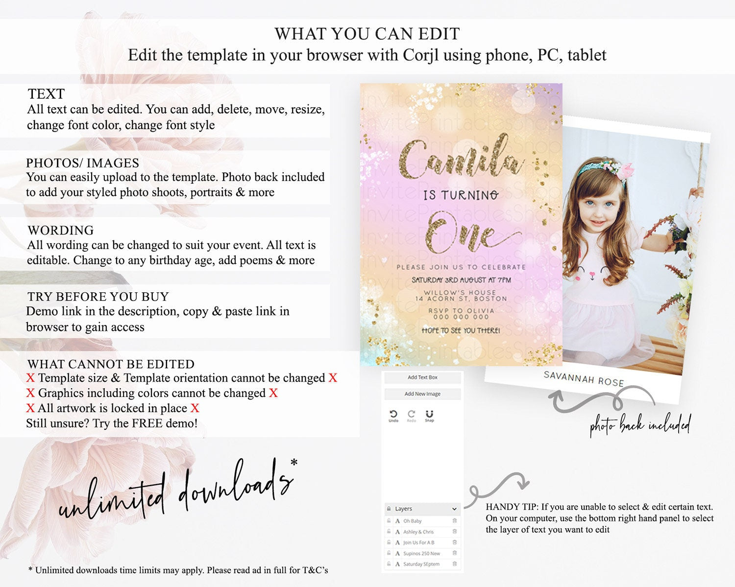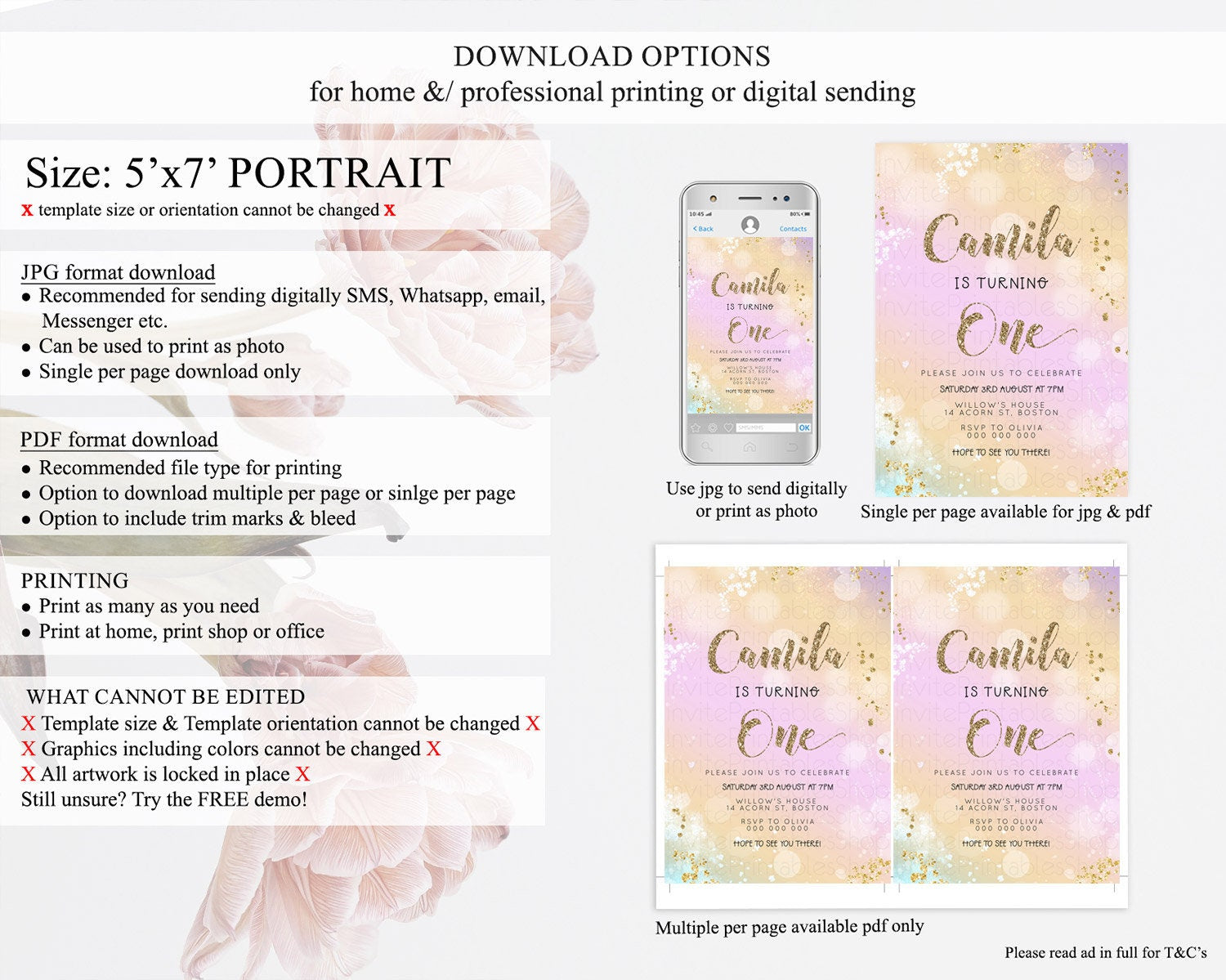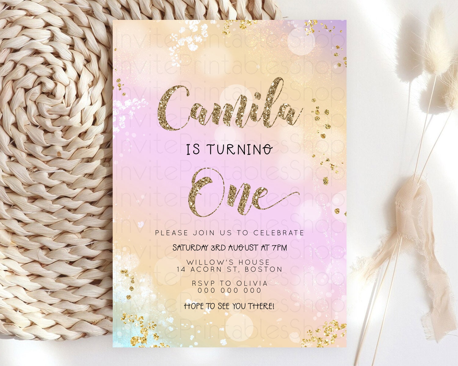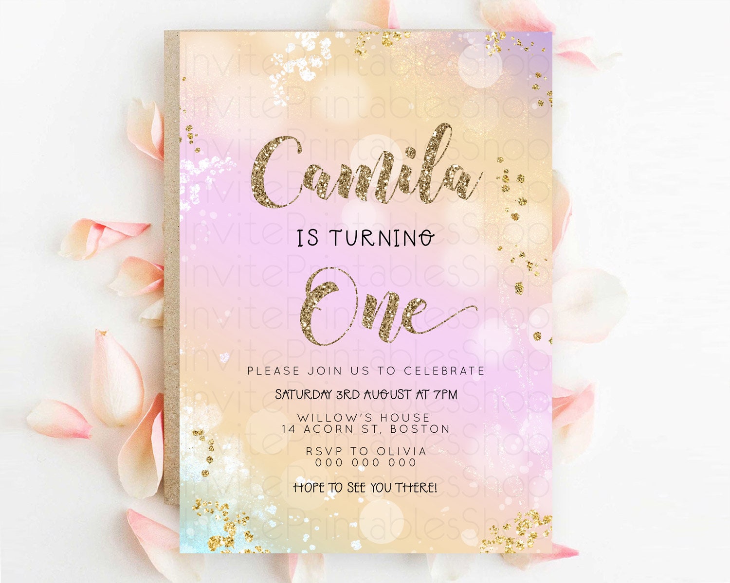 Rainbow Birthday Invitation Colorful Pastel Watercolor Invitation Gold Glitter Sprinkles Ombre Pastel 1st 2nd 3rd Birthday D23122