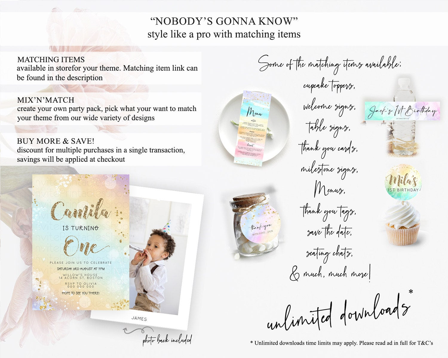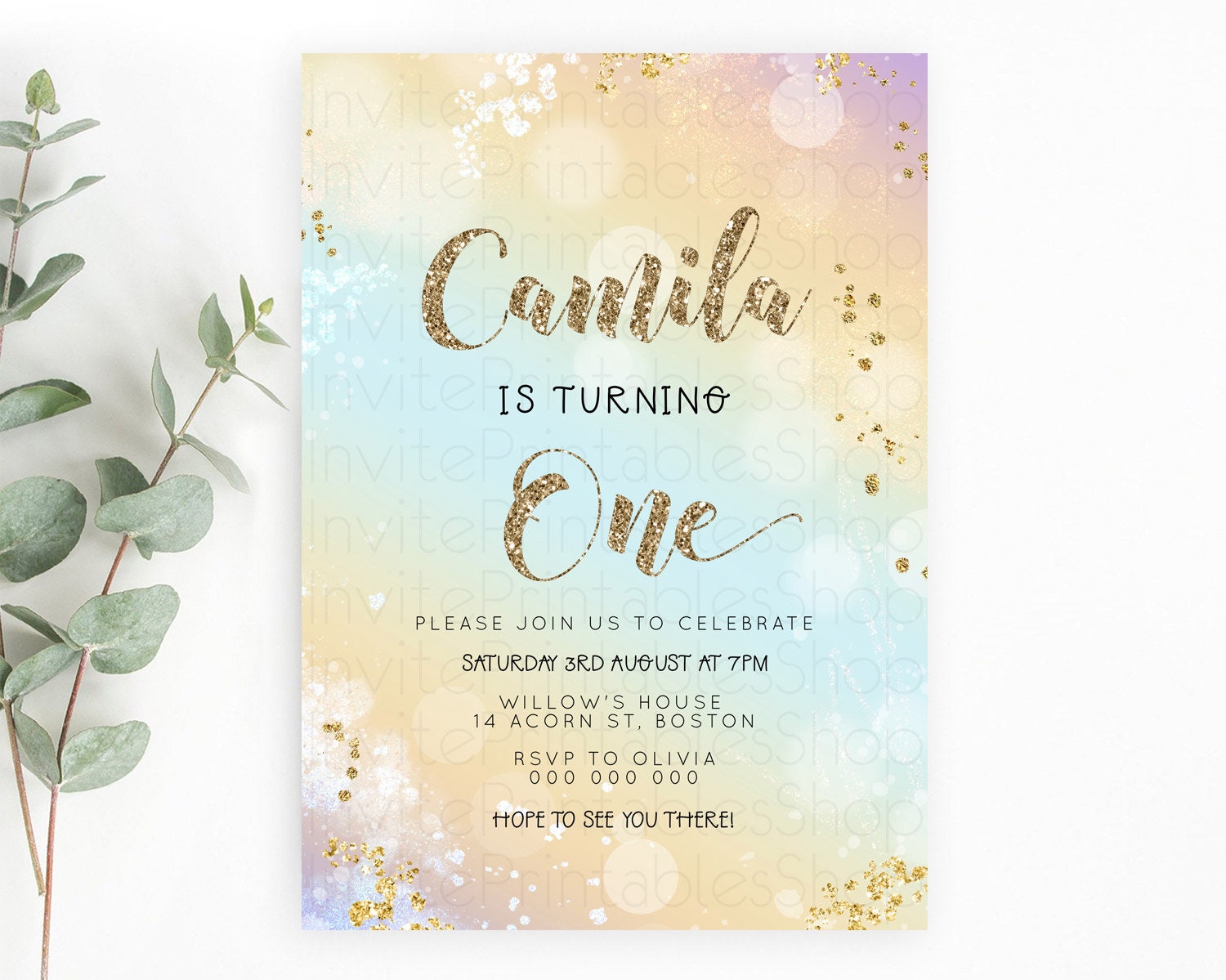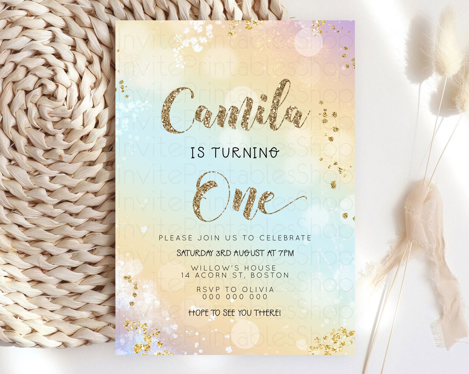 Rainbow Birthday Invitation Colorful Pastel Watercolor Invitation Gold Glitter Sprinkles Ombre Pastel 1st 2nd 3rd Birthday D23123
