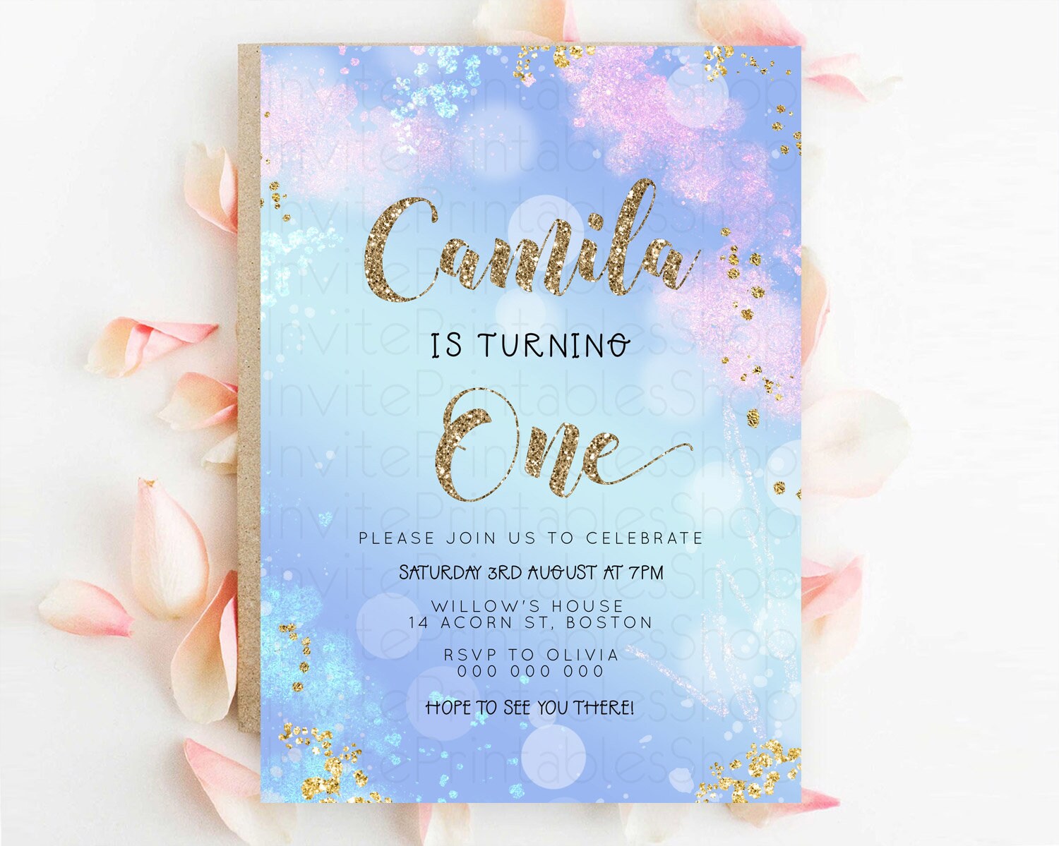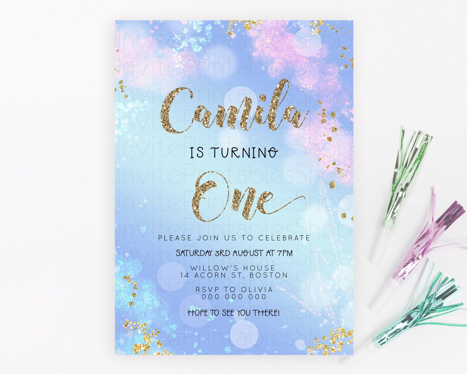Rainbow Birthday Invitation Colorful Pastel Watercolor Invitation Gold Glitter Sprinkles Ombre Pastel 1st 2nd 3rd Birthday D23124