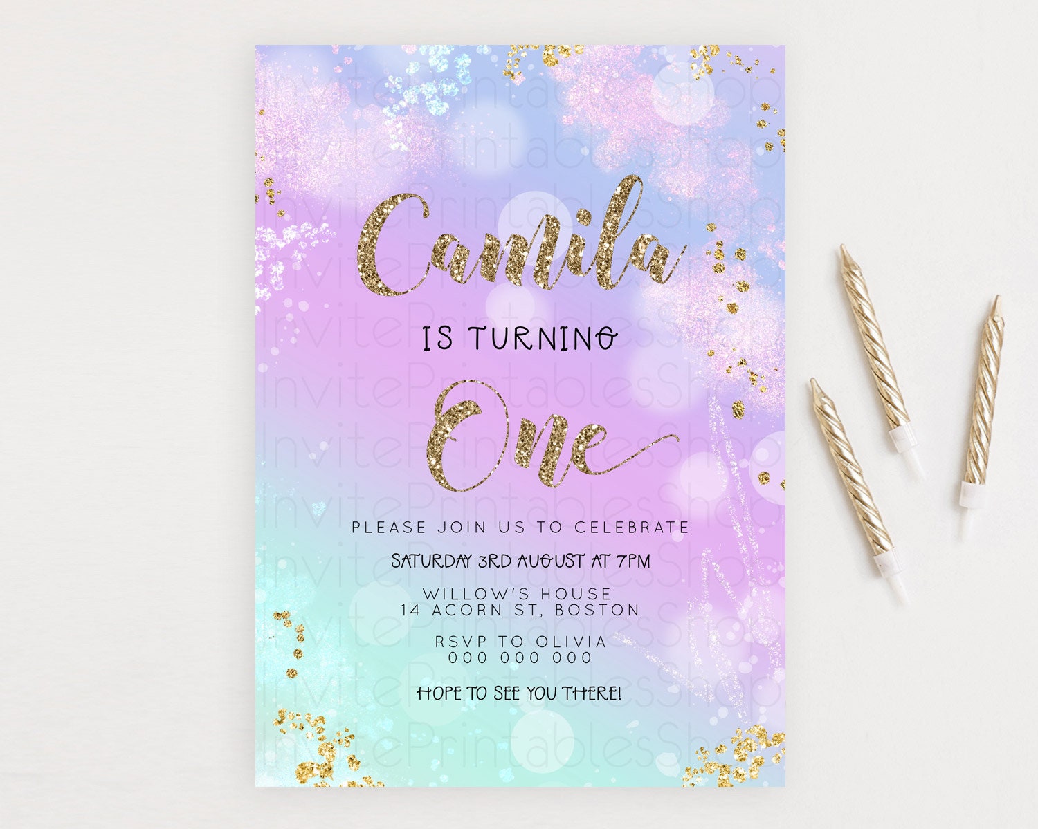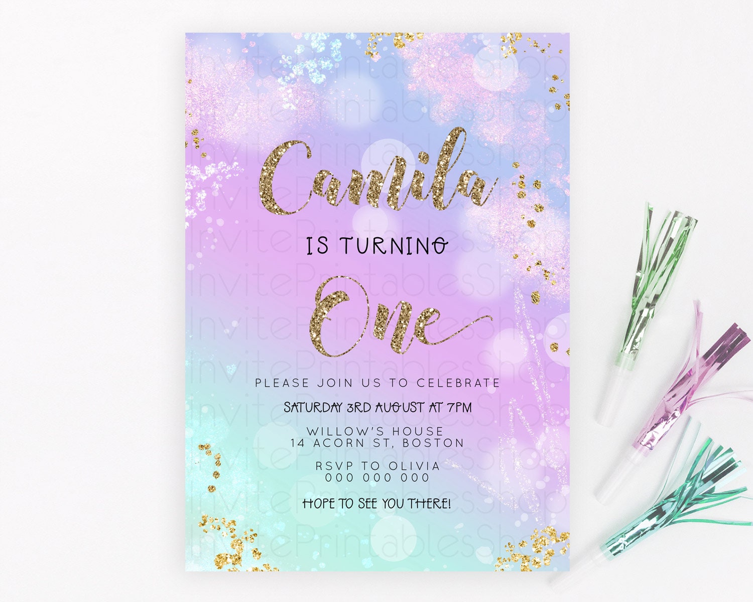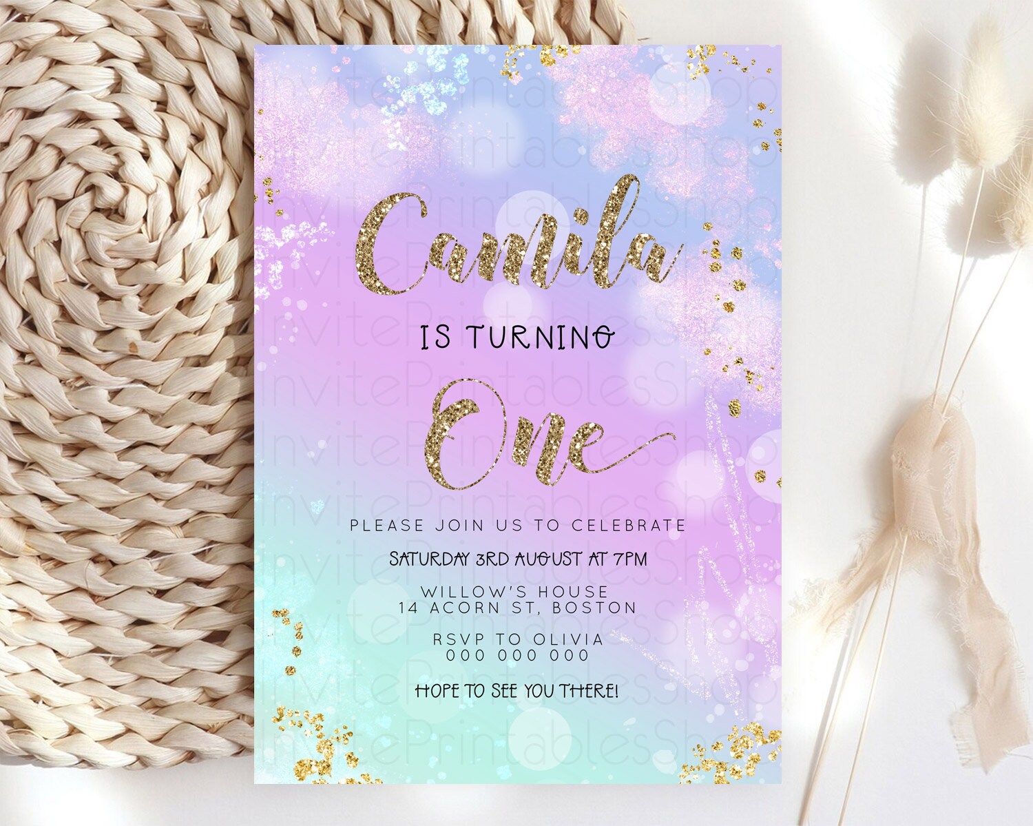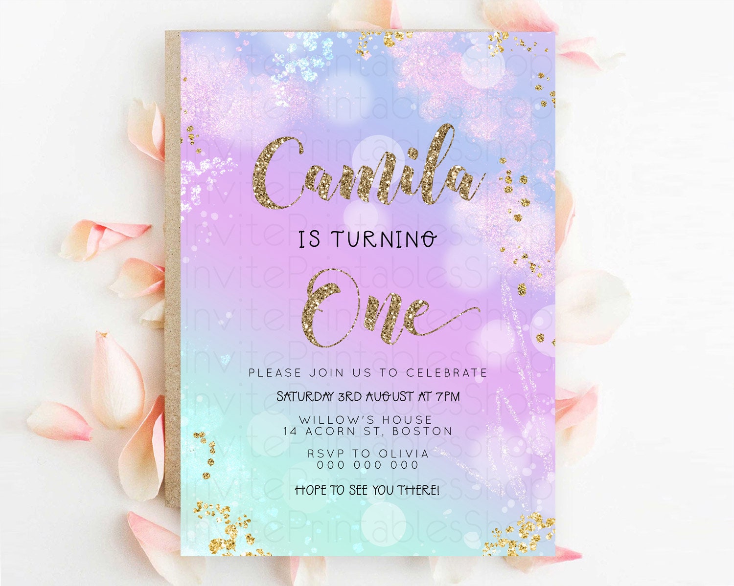 Rainbow Birthday Invitation Colorful Pastel Watercolor Invitation Gold Glitter Sprinkles Ombre Pastel 1st 2nd 3rd Birthday D23127