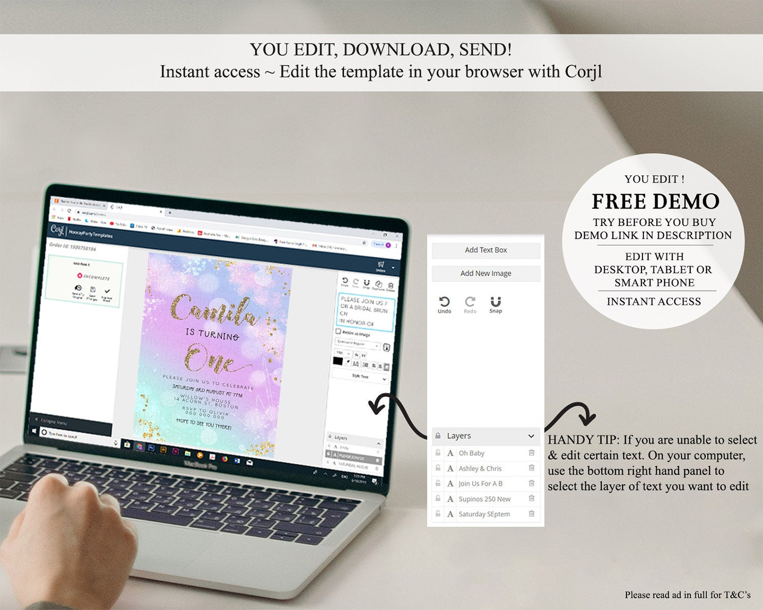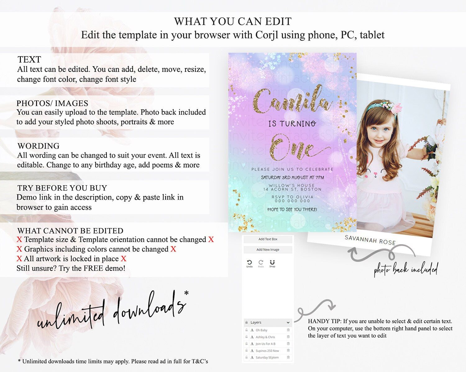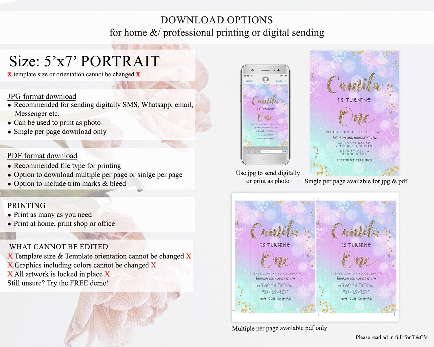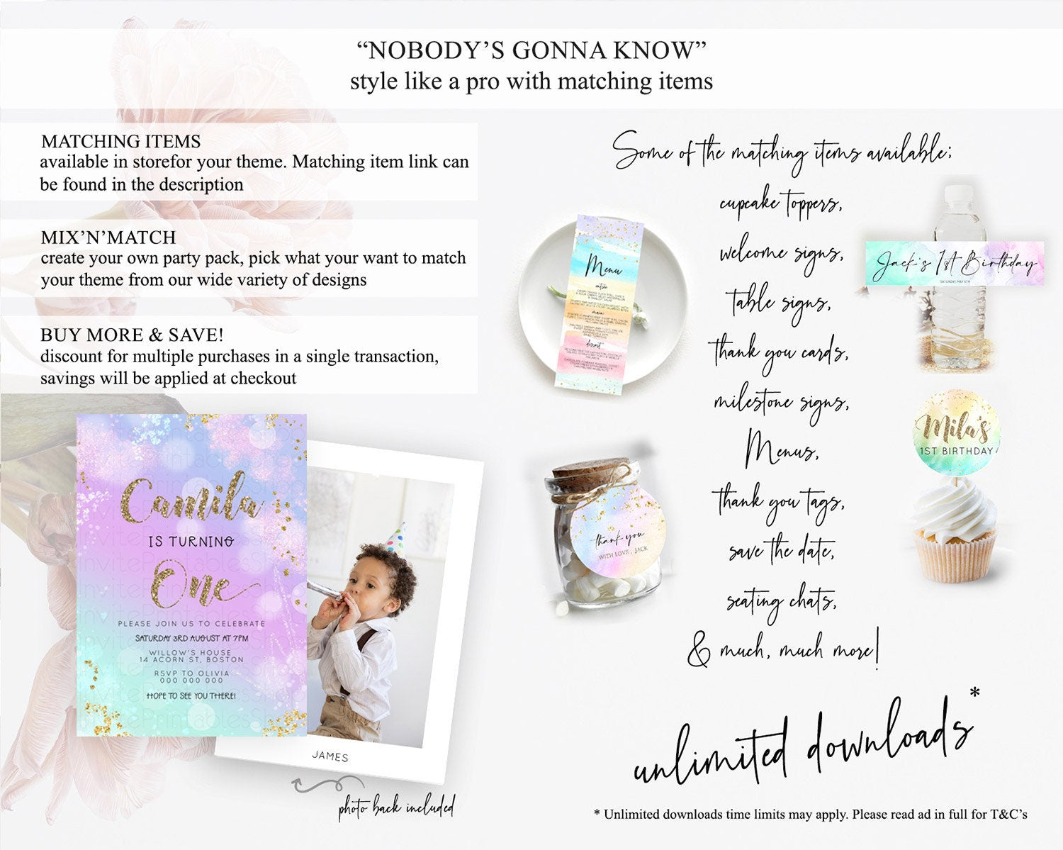 Rainbow Birthday Invitation Colorful Pastel Watercolor Invitation Gold Glitter Sprinkles Ombre Pastel 1st 2nd 3rd Birthday D23127