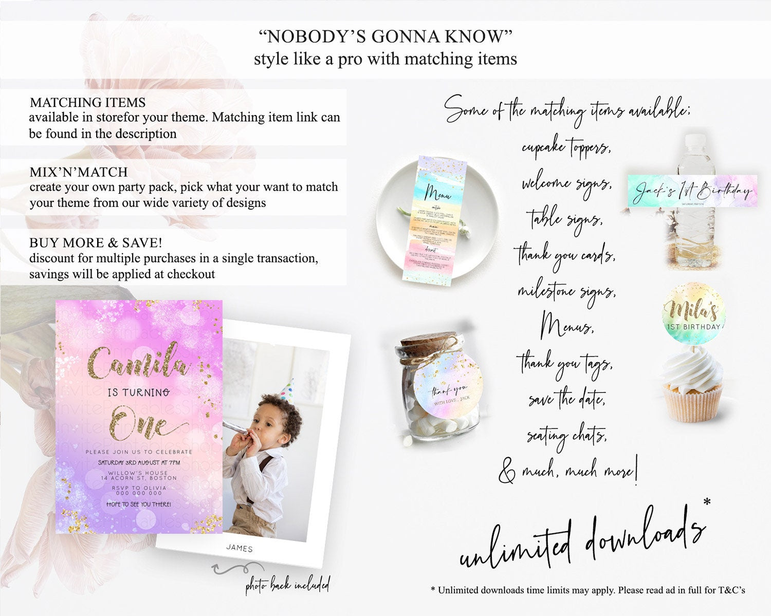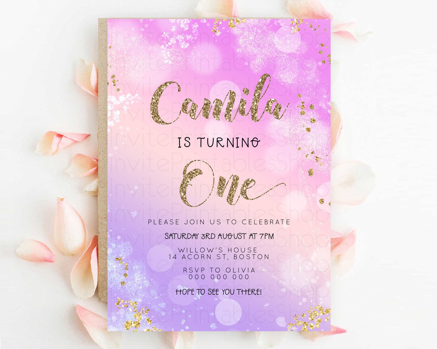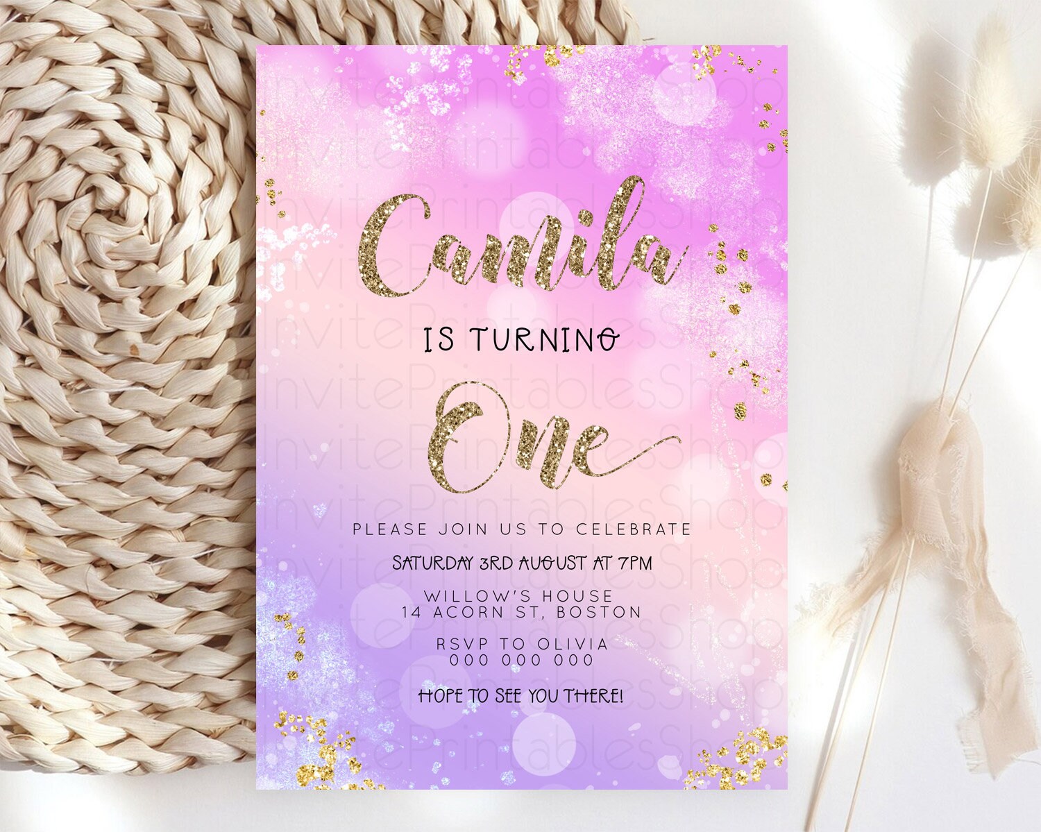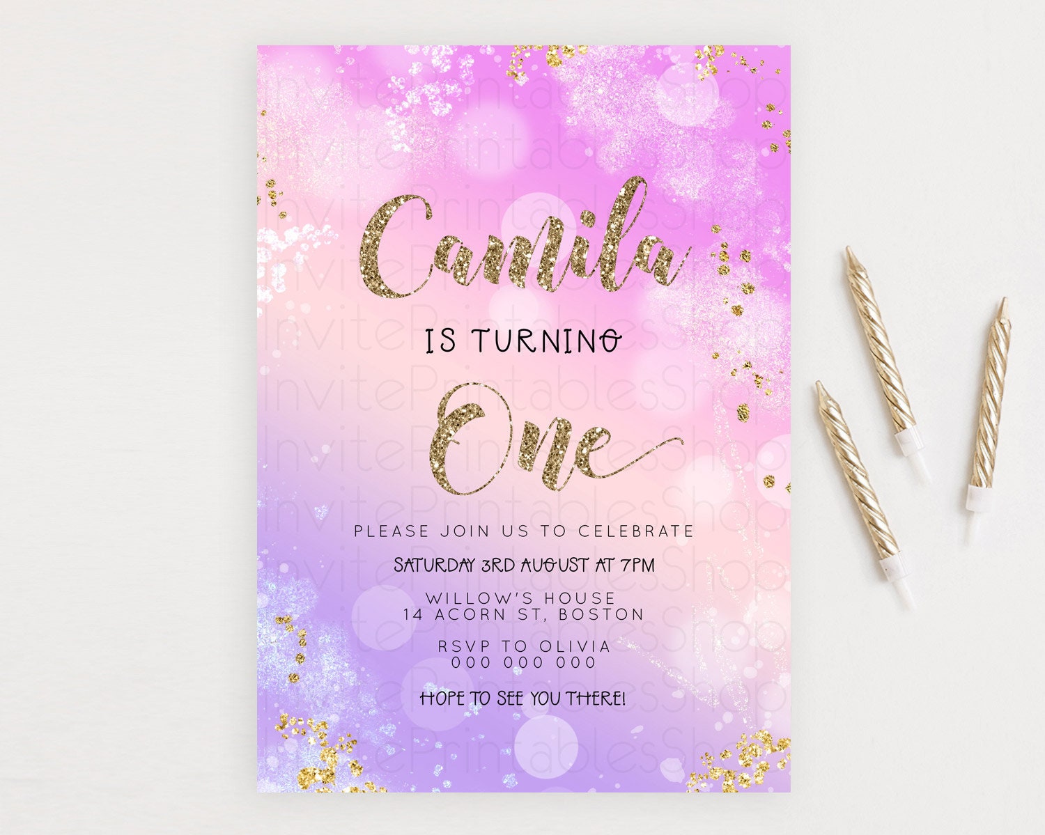 Rainbow Birthday Invitation Colorful Pastel Watercolor Invitation Gold Glitter Sprinkles Ombre Pastel 1st 2nd 3rd Birthday D23128