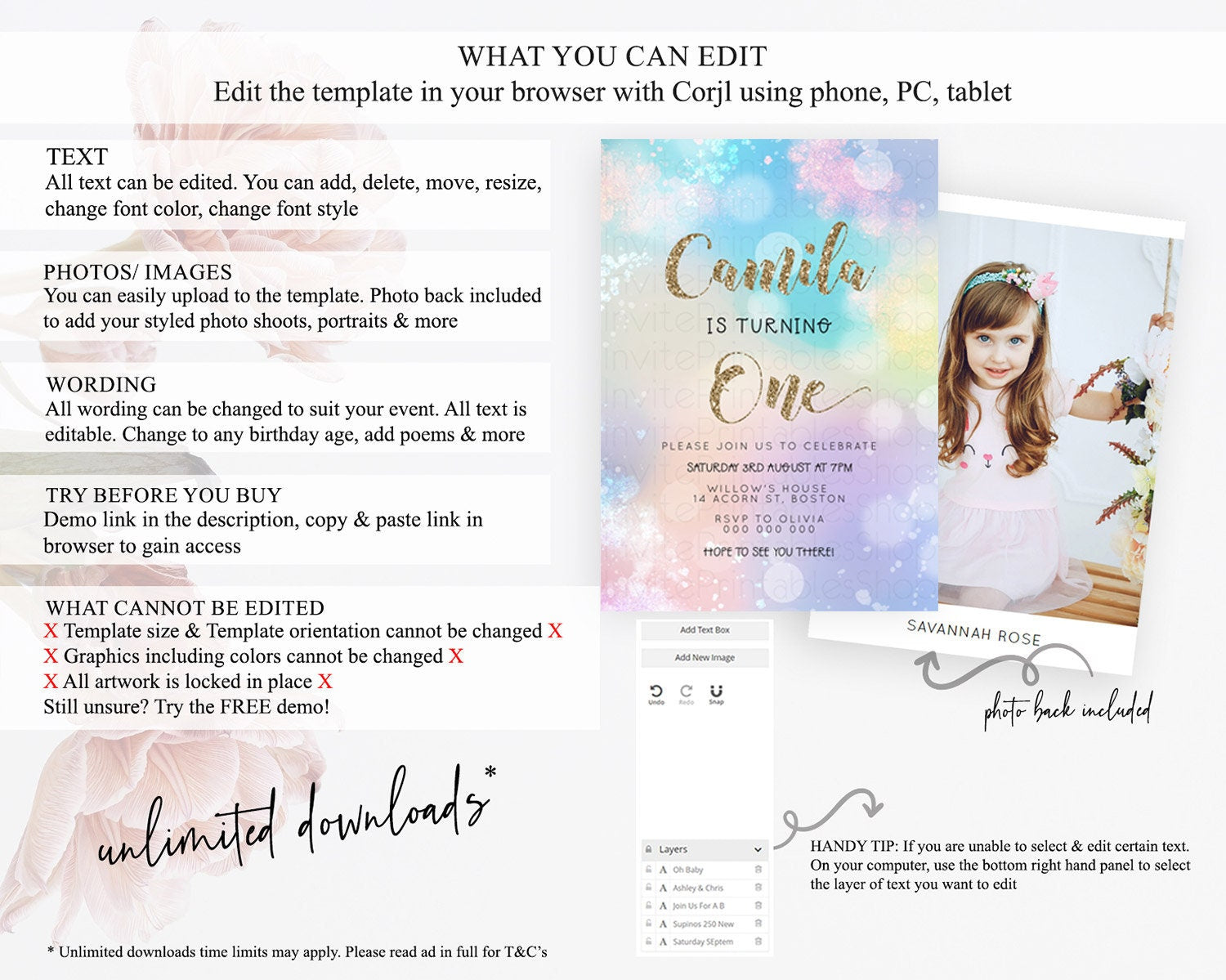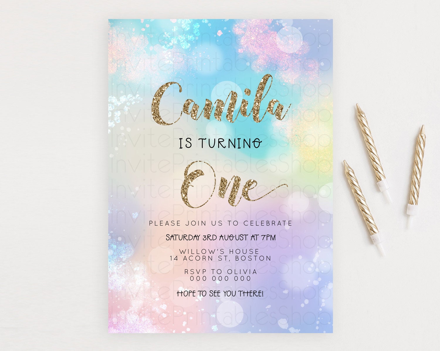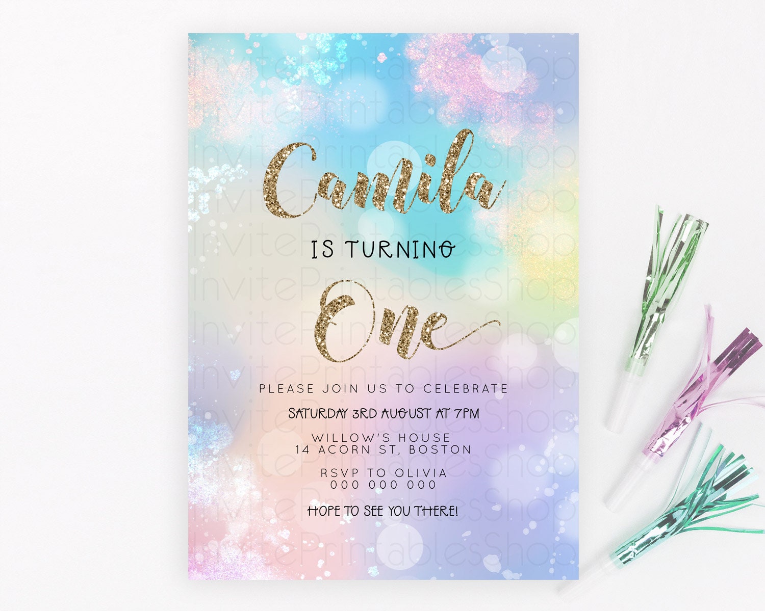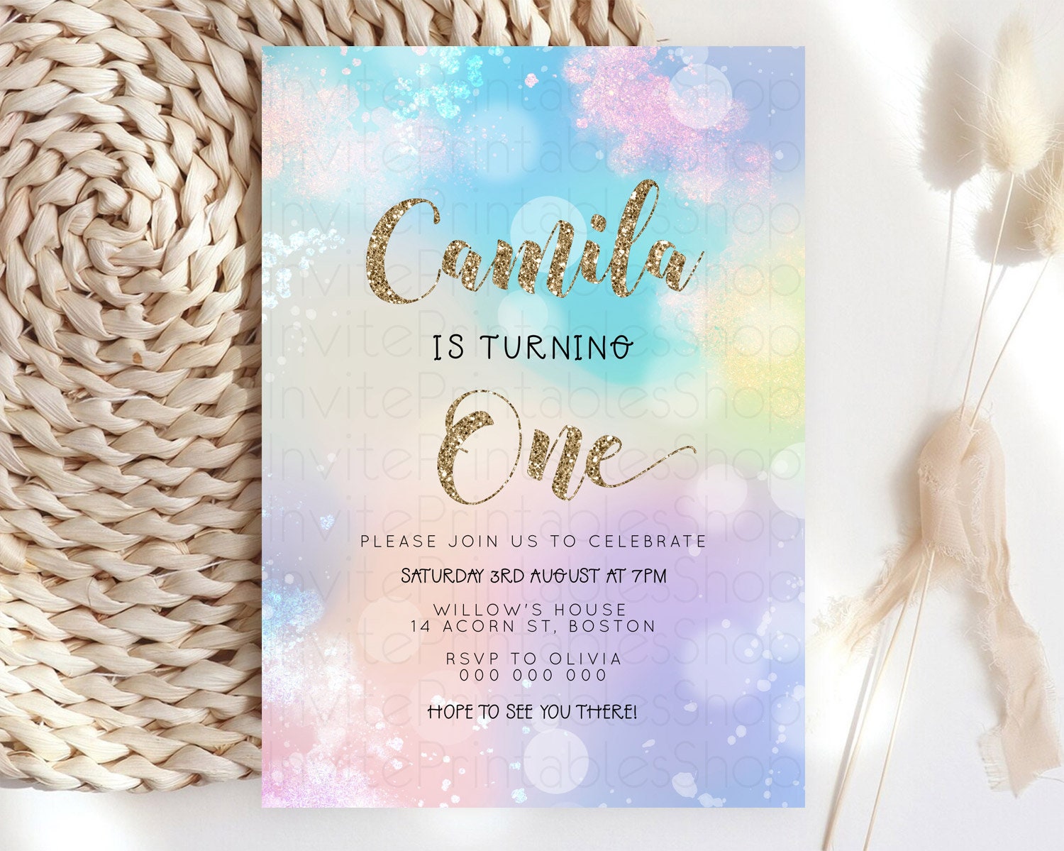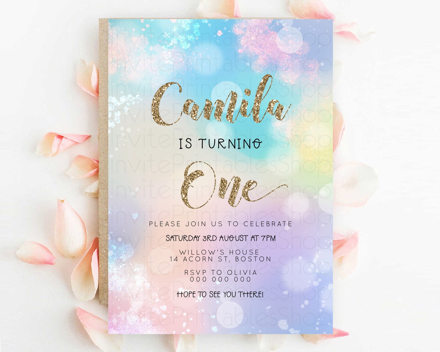 Rainbow Birthday Invitation Colorful Pastel Watercolor Invitation Gold Glitter Sprinkles Ombre Pastel 1st 2nd 3rd Birthday D23129