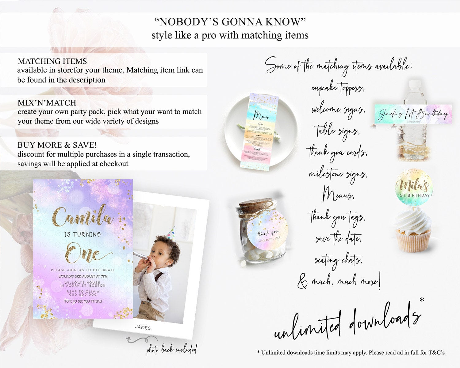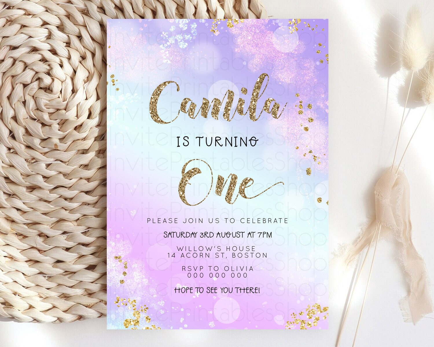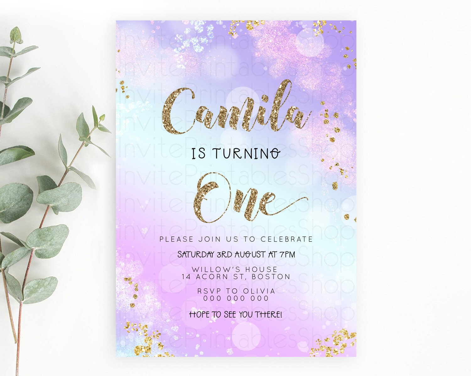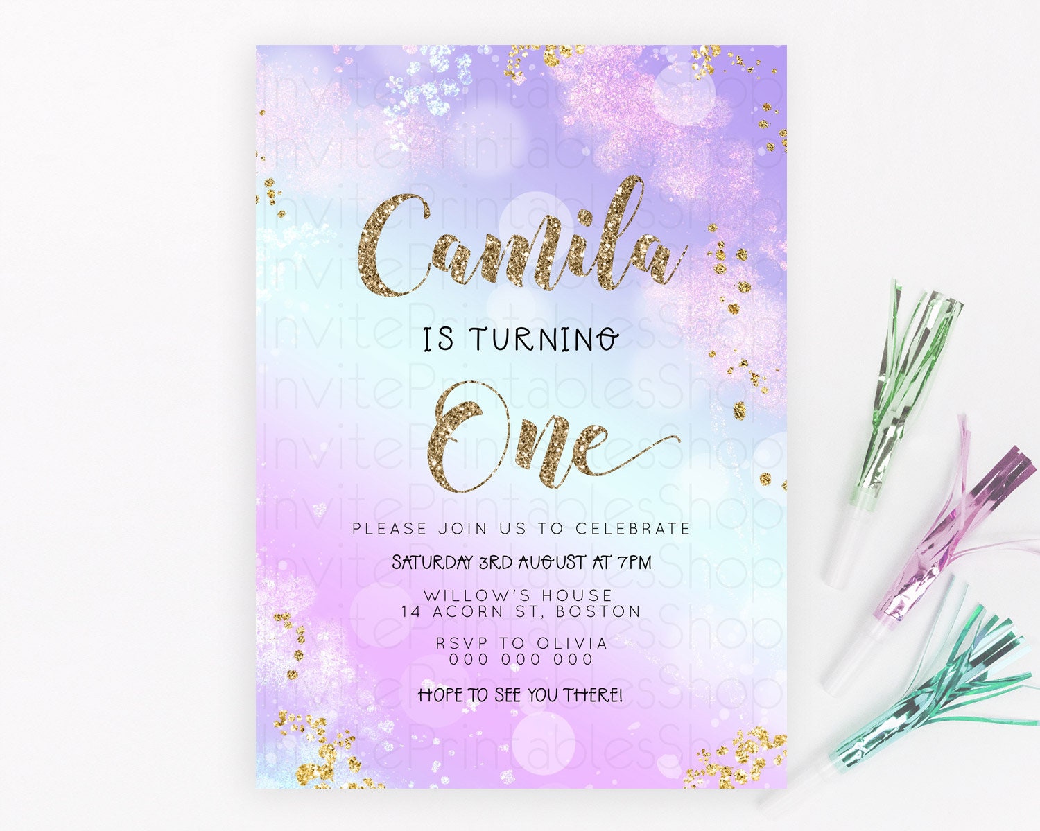 Rainbow Birthday Invitation Colorful Pastel Watercolor Invitation Gold Glitter Sprinkles Ombre Pastel 1st 2nd 3rd Birthday D23130