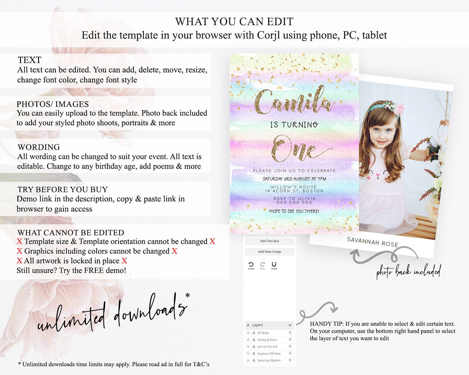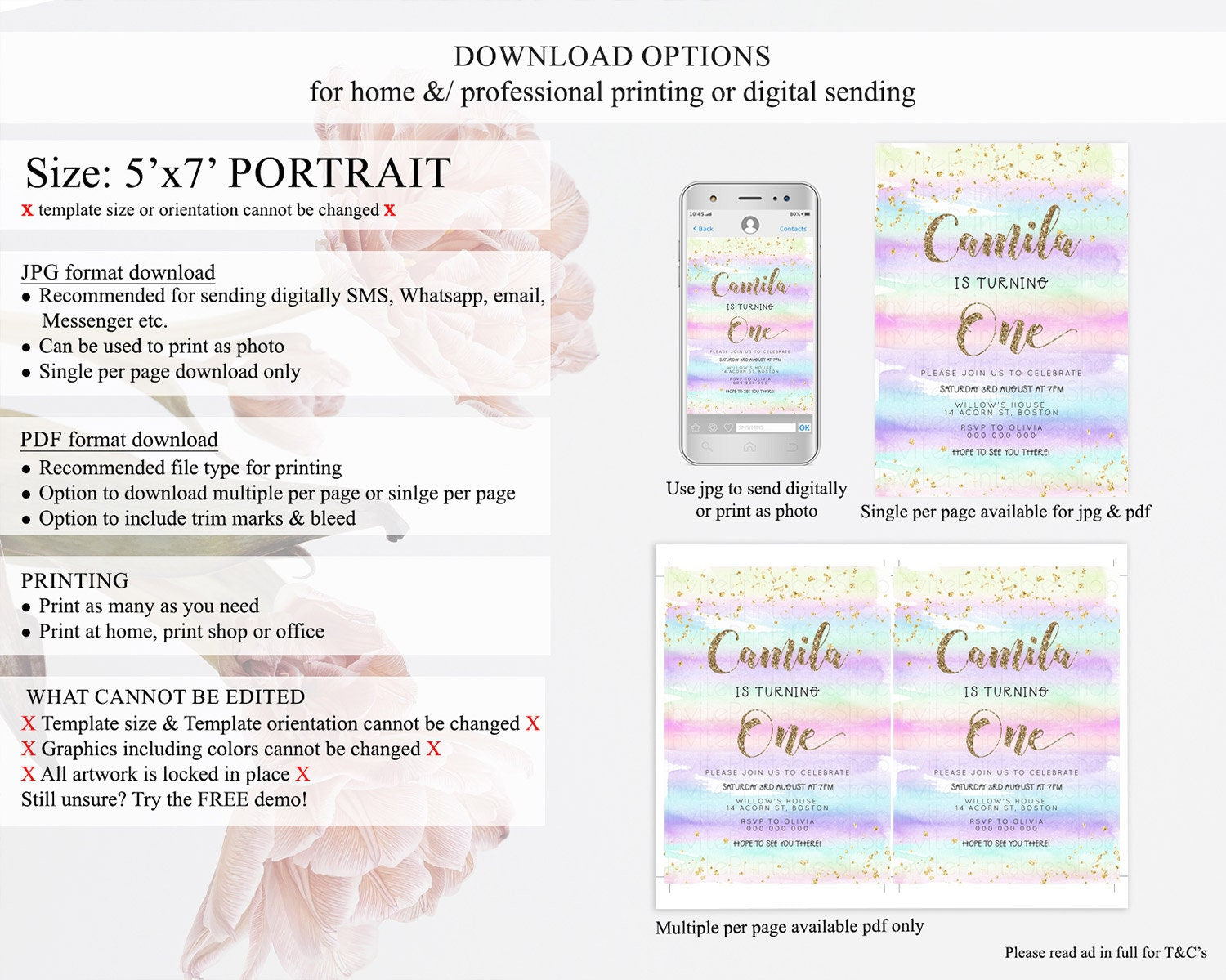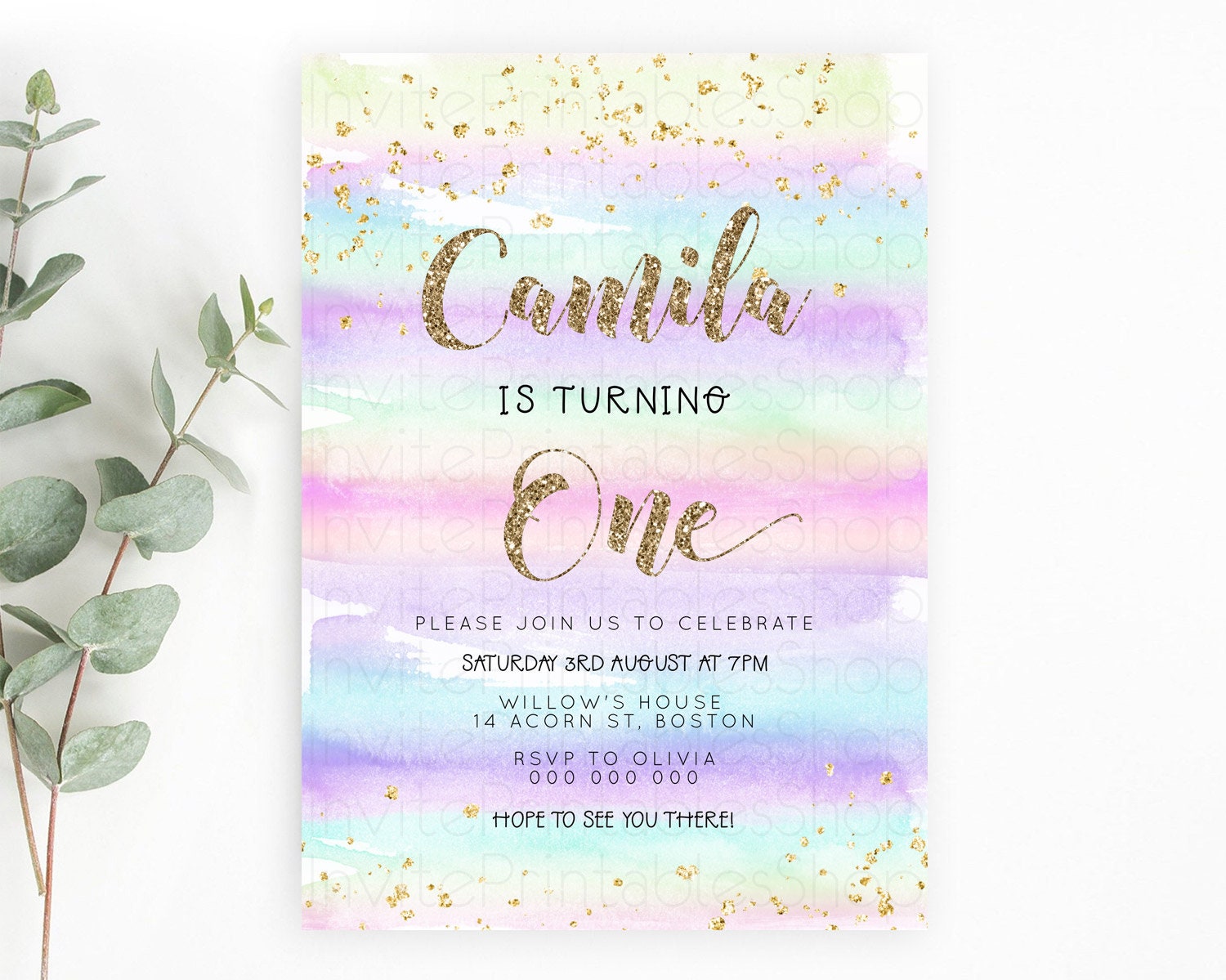 Rainbow Birthday Invitation Colorful Pastel Watercolor Invitation Gold Glitter Sprinkles Ombre Pastel 1st 2nd 3rd Birthday D23263