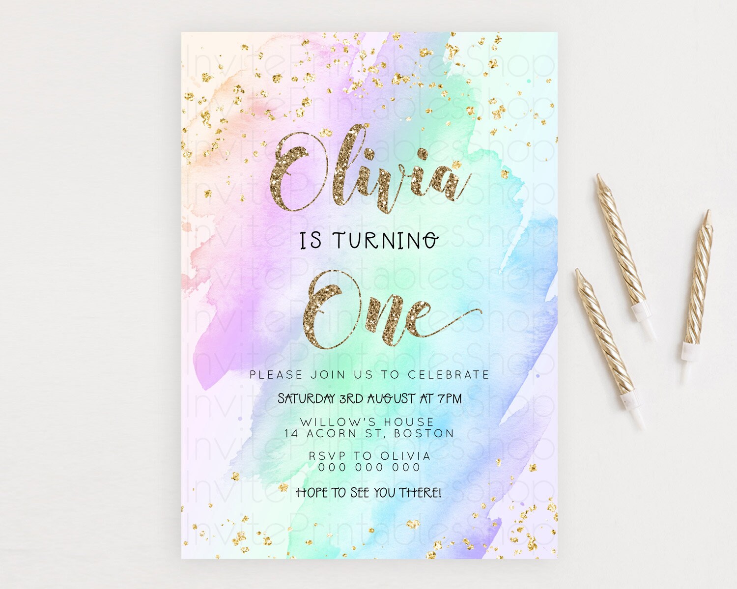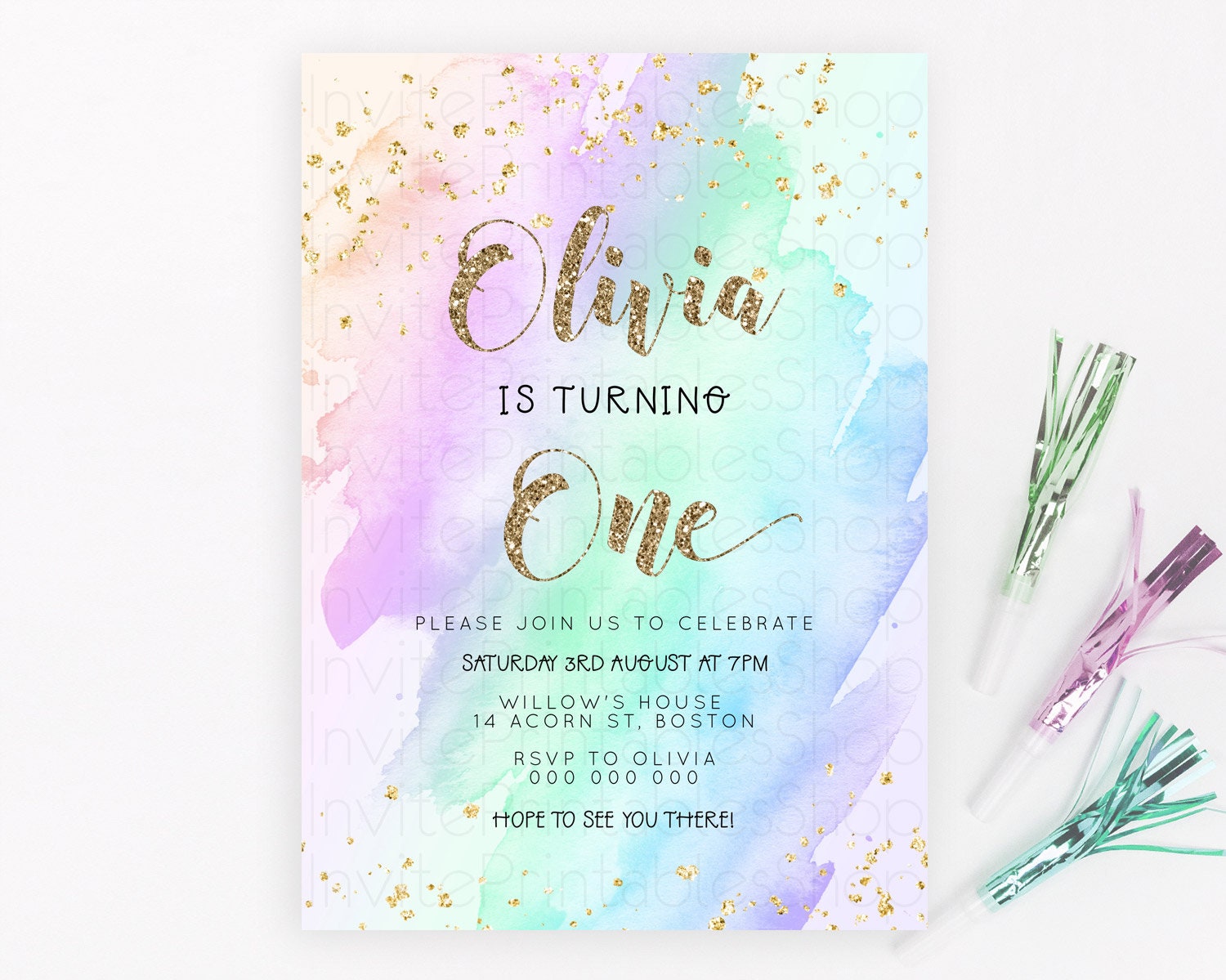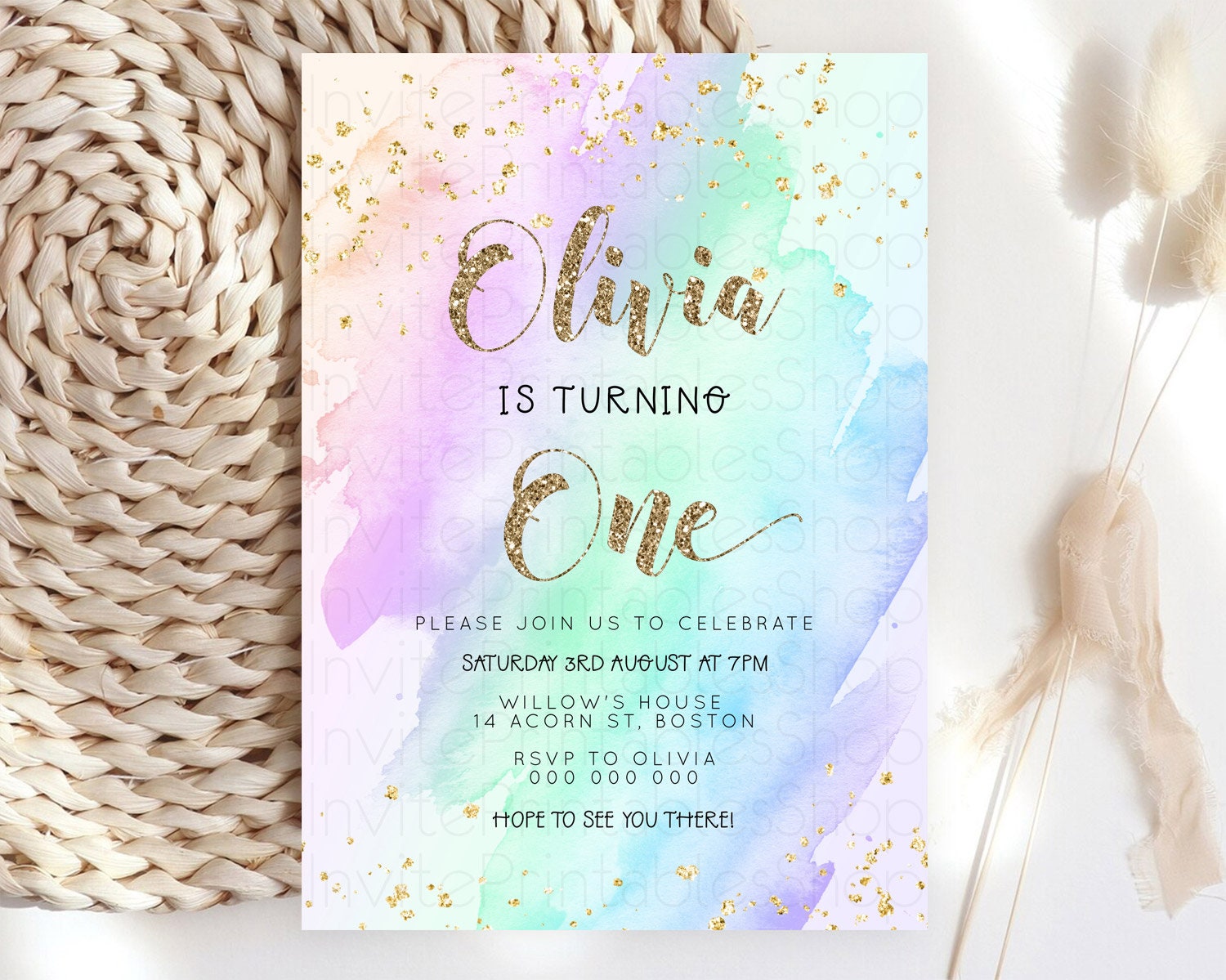 Rainbow Birthday Invitation Colorful Pastel Watercolor Invitation Gold Glitter Sprinkles Ombre Pastel 1st 2nd 3rd Birthday D23284
