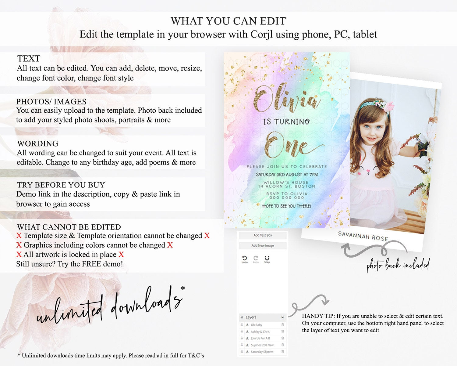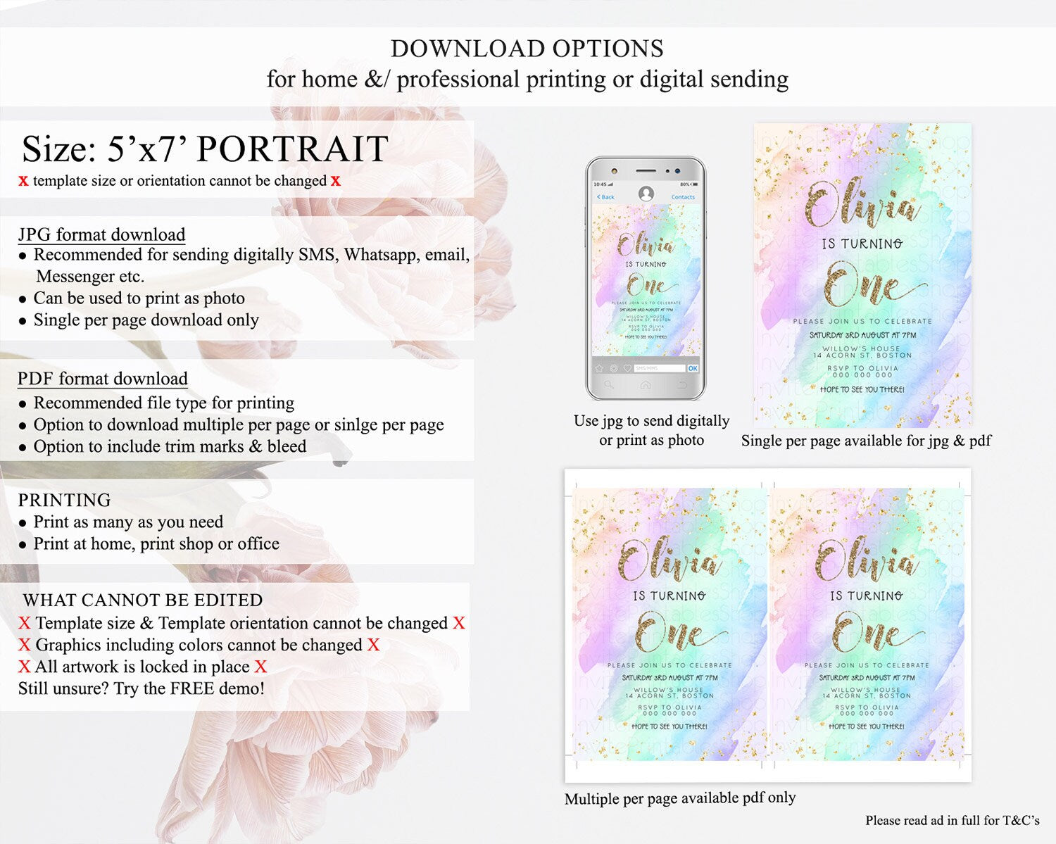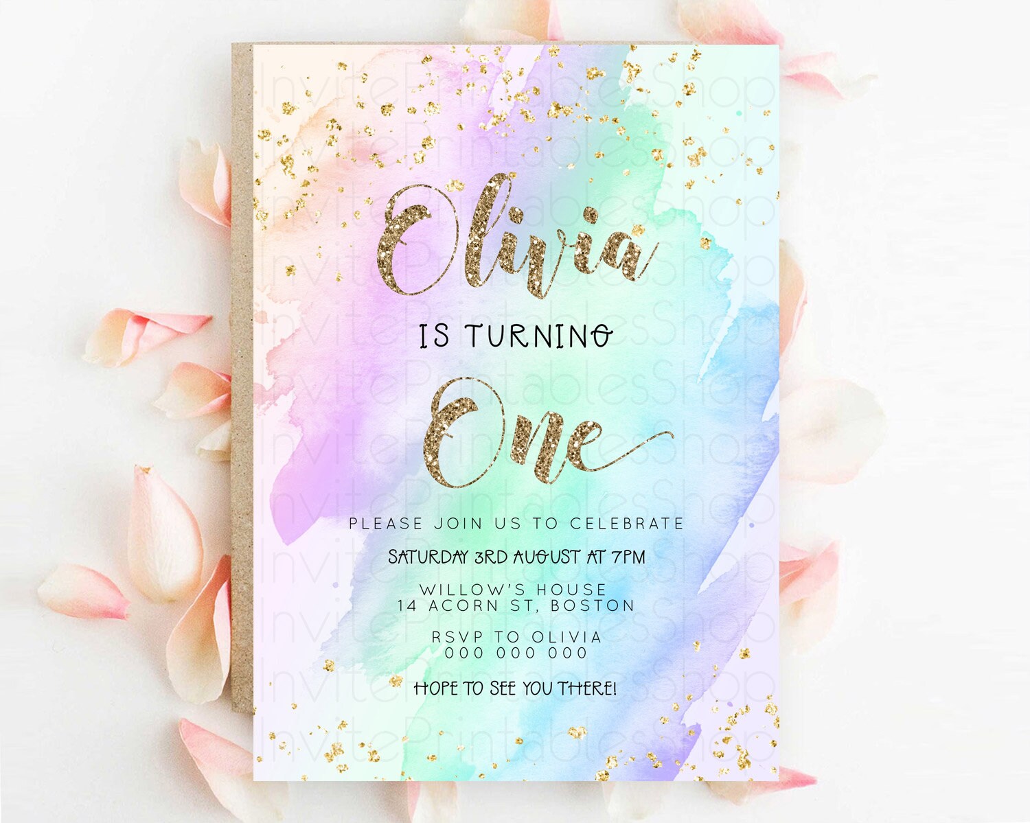 Rainbow Birthday Invitation Colorful Pastel Watercolor Invitation Gold Glitter Sprinkles Ombre Pastel 1st 2nd 3rd Birthday D23284