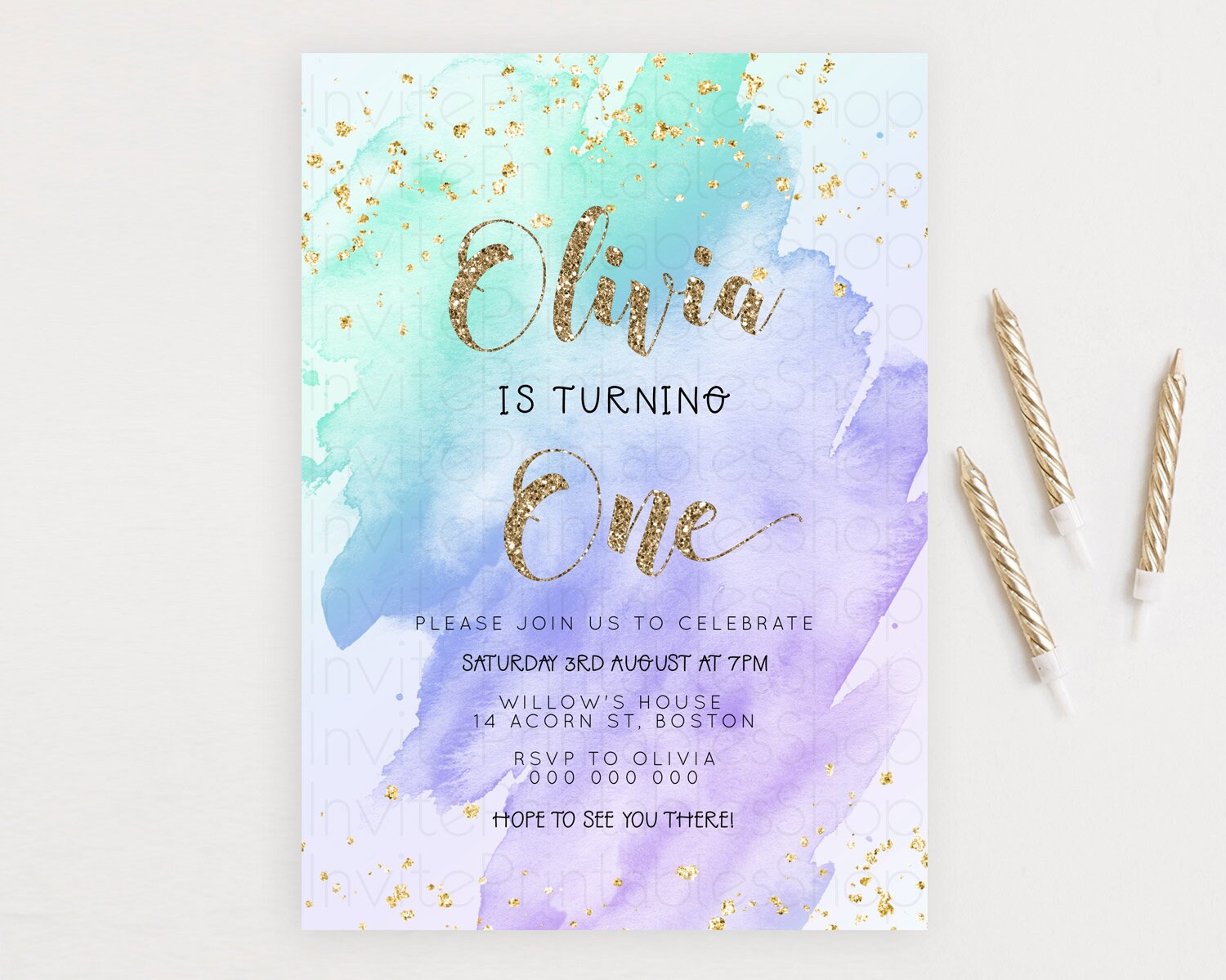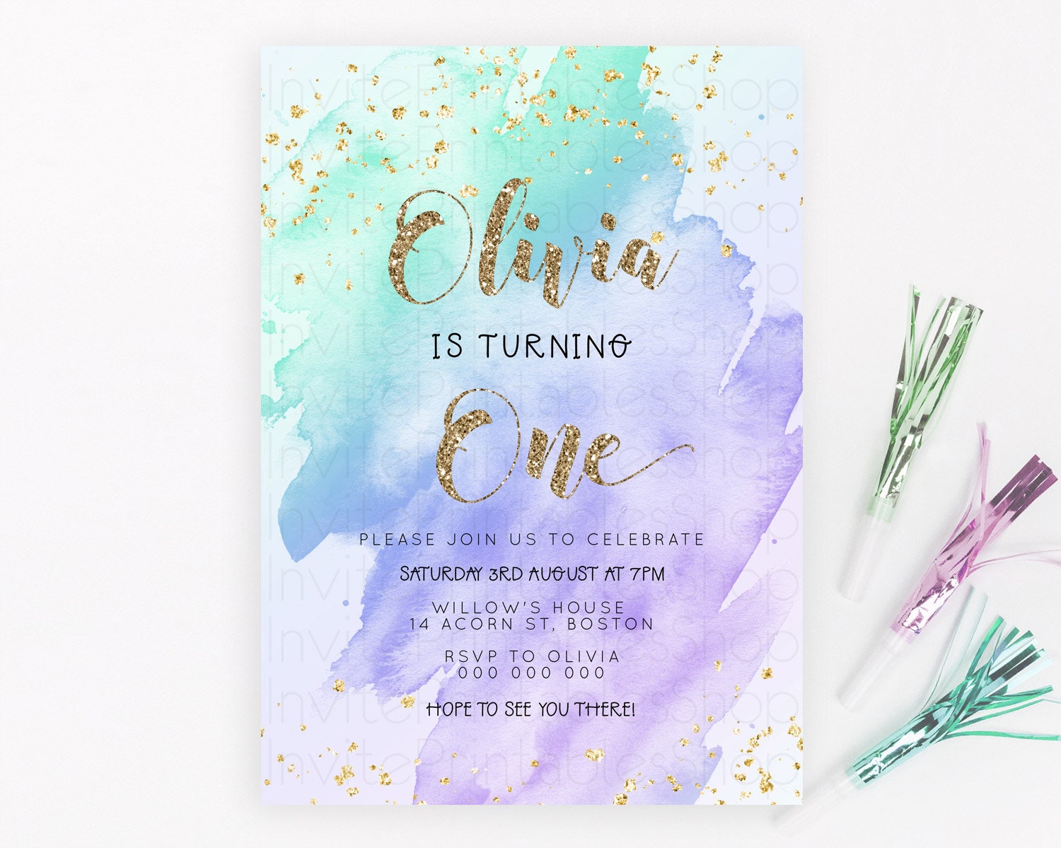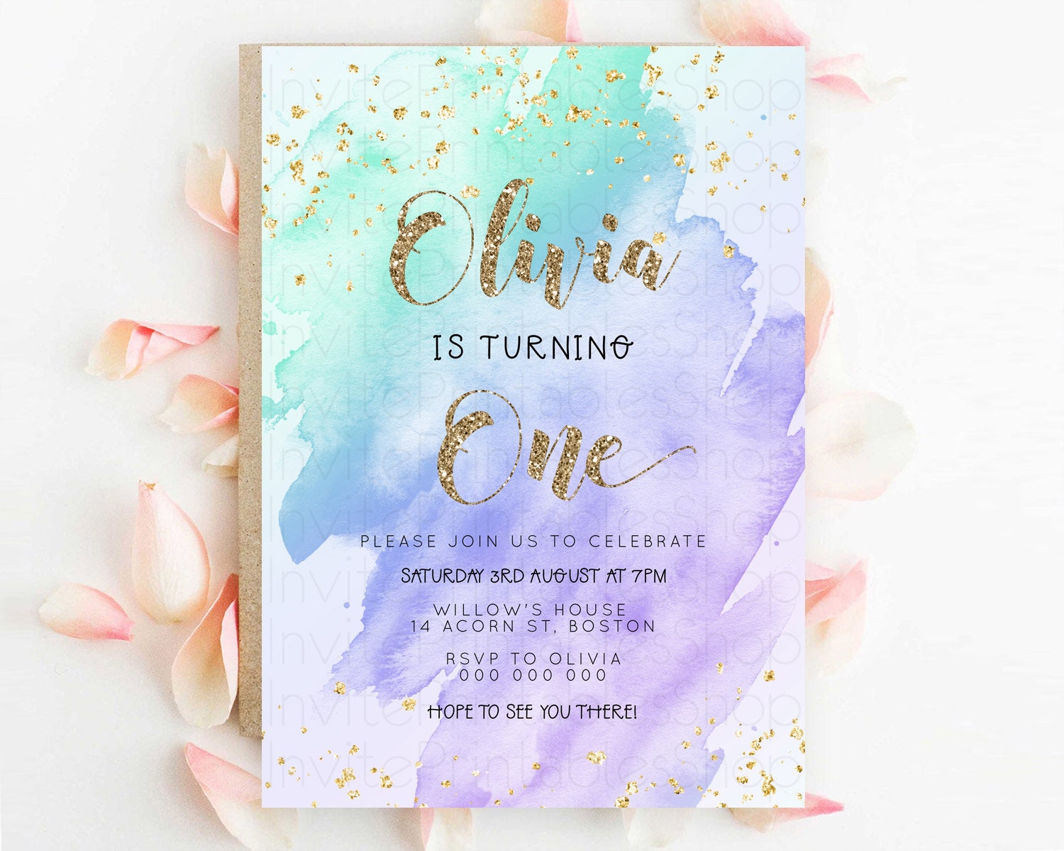Rainbow Birthday Invitation Colorful Pastel Watercolor Invitation Gold Glitter Sprinkles Ombre Pastel 1st 2nd 3rd Birthday D23288