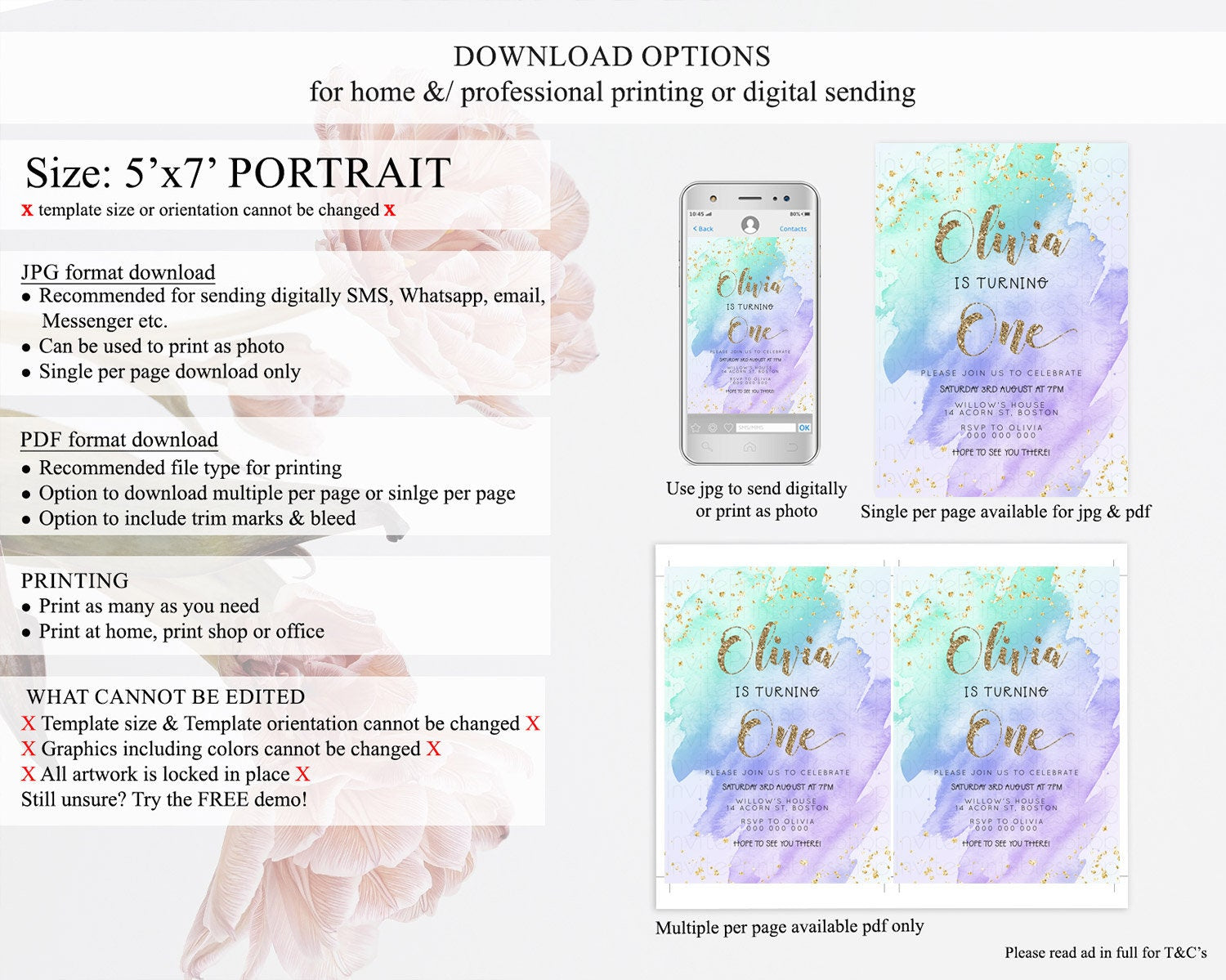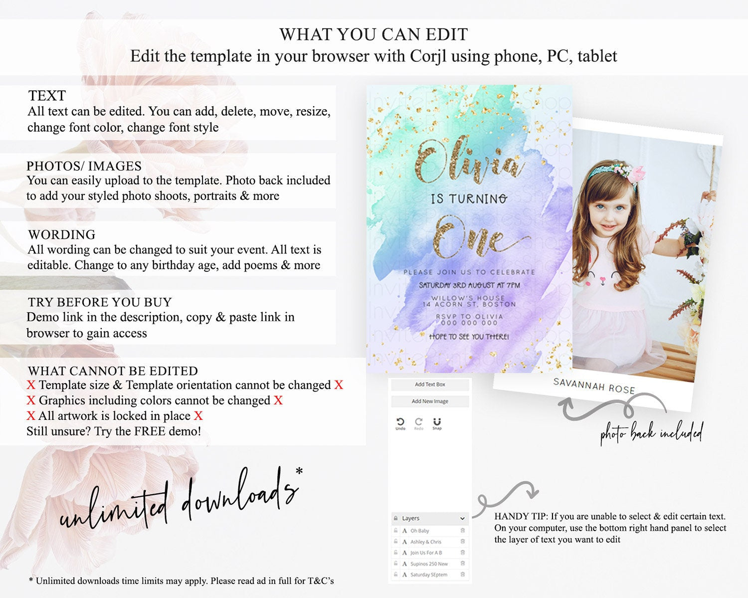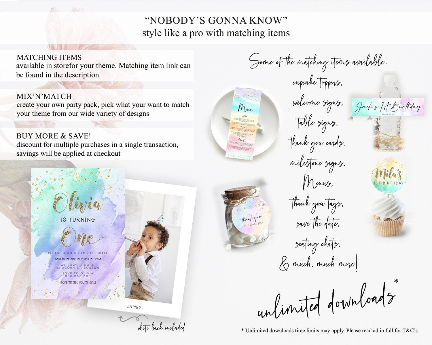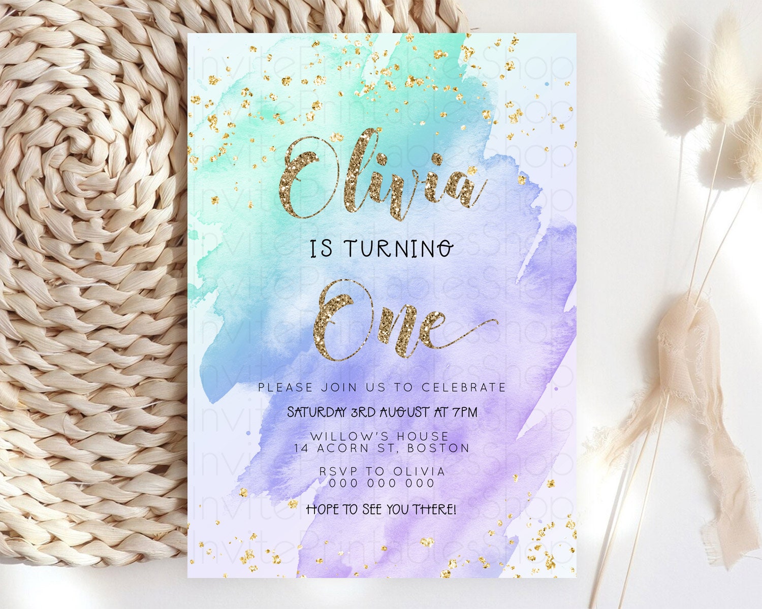 Rainbow Birthday Invitation Colorful Pastel Watercolor Invitation Gold Glitter Sprinkles Ombre Pastel 1st 2nd 3rd Birthday D23288