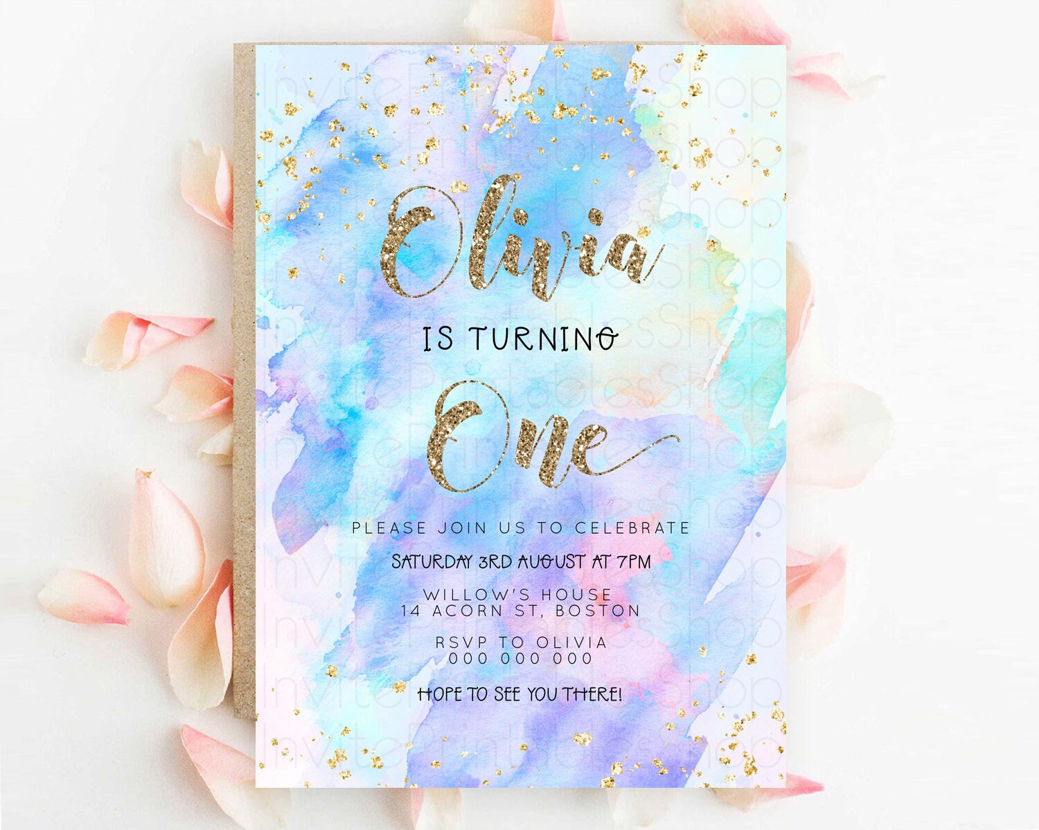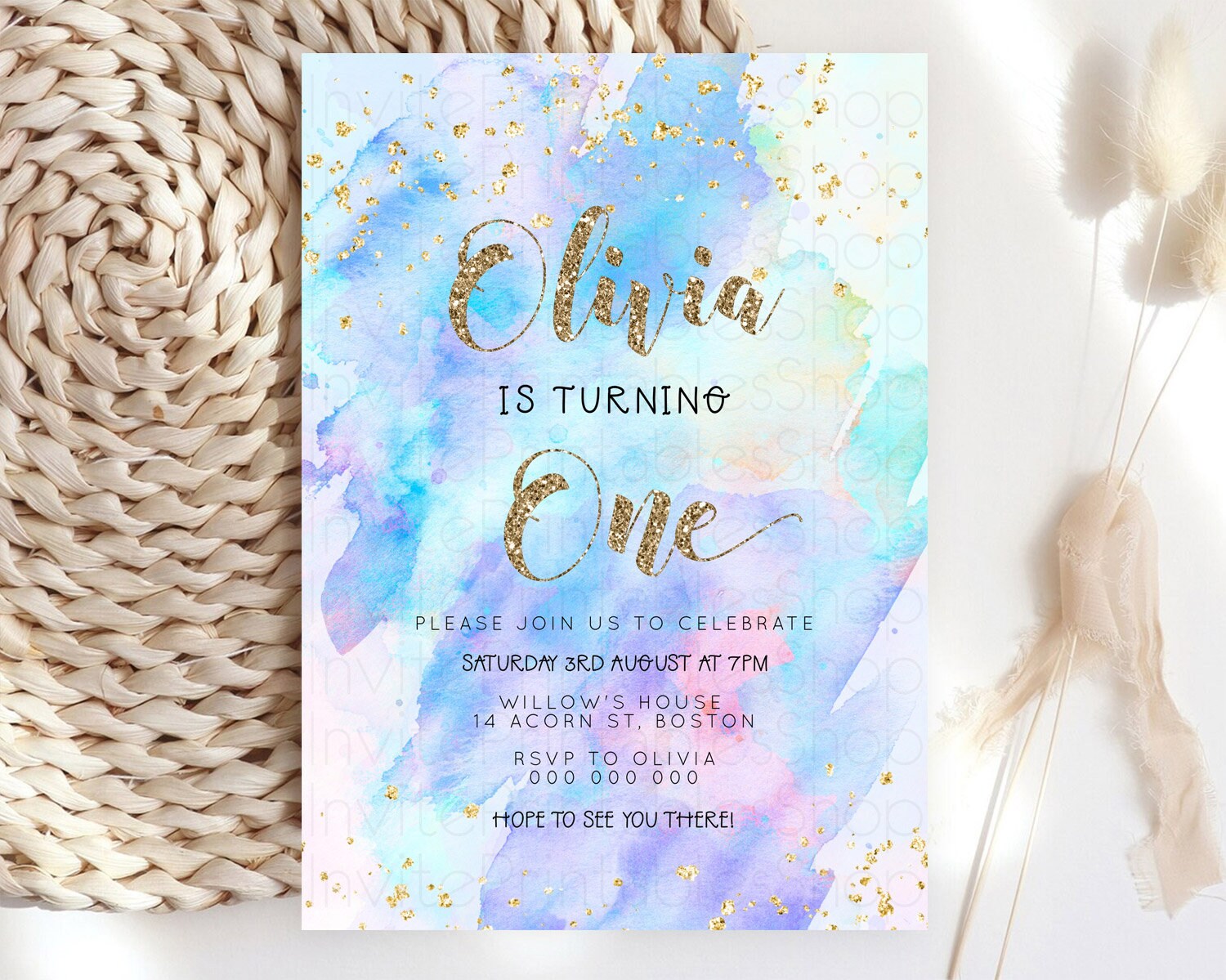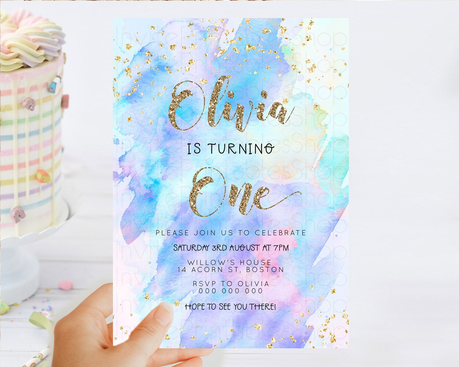Rainbow Birthday Invitation Colorful Pastel Watercolor Invitation Gold Glitter Sprinkles Ombre Pastel 1st 2nd 3rd Birthday D23292