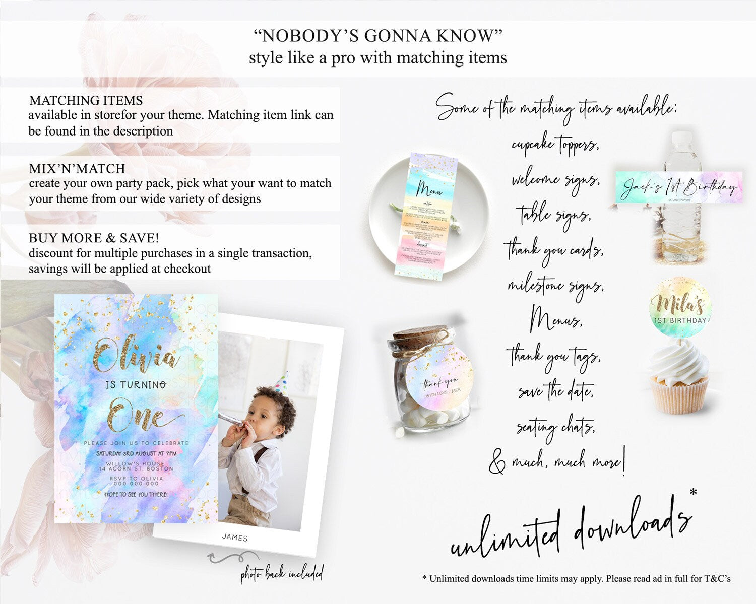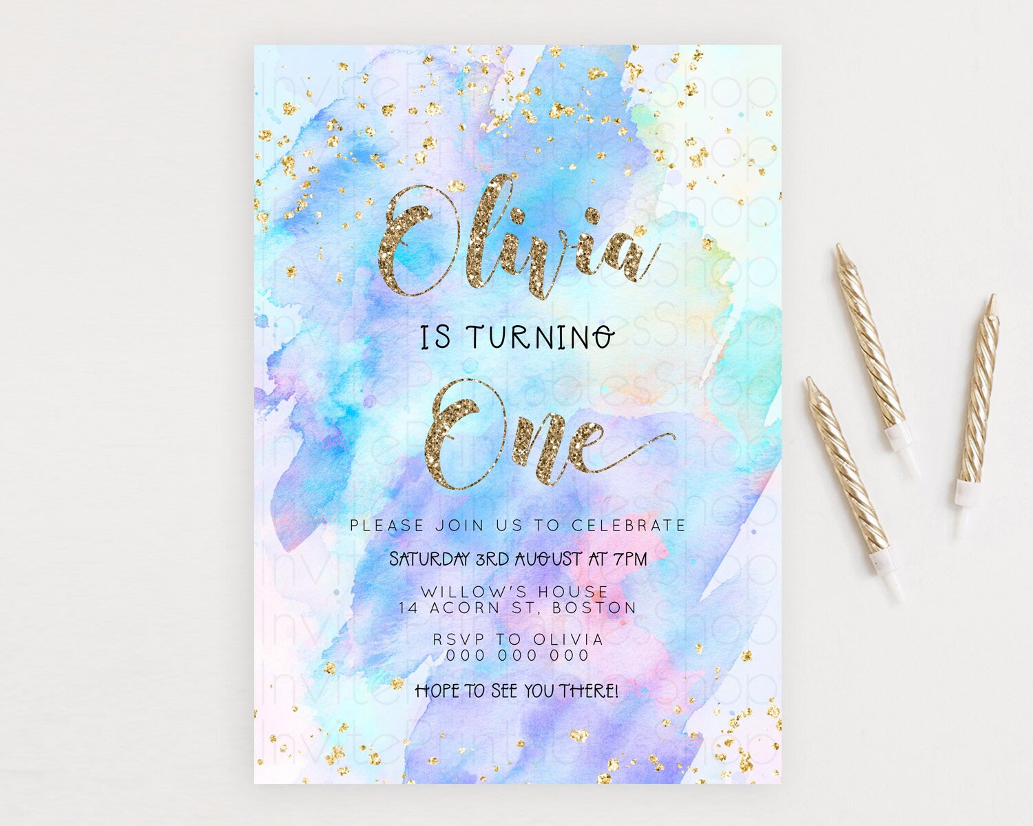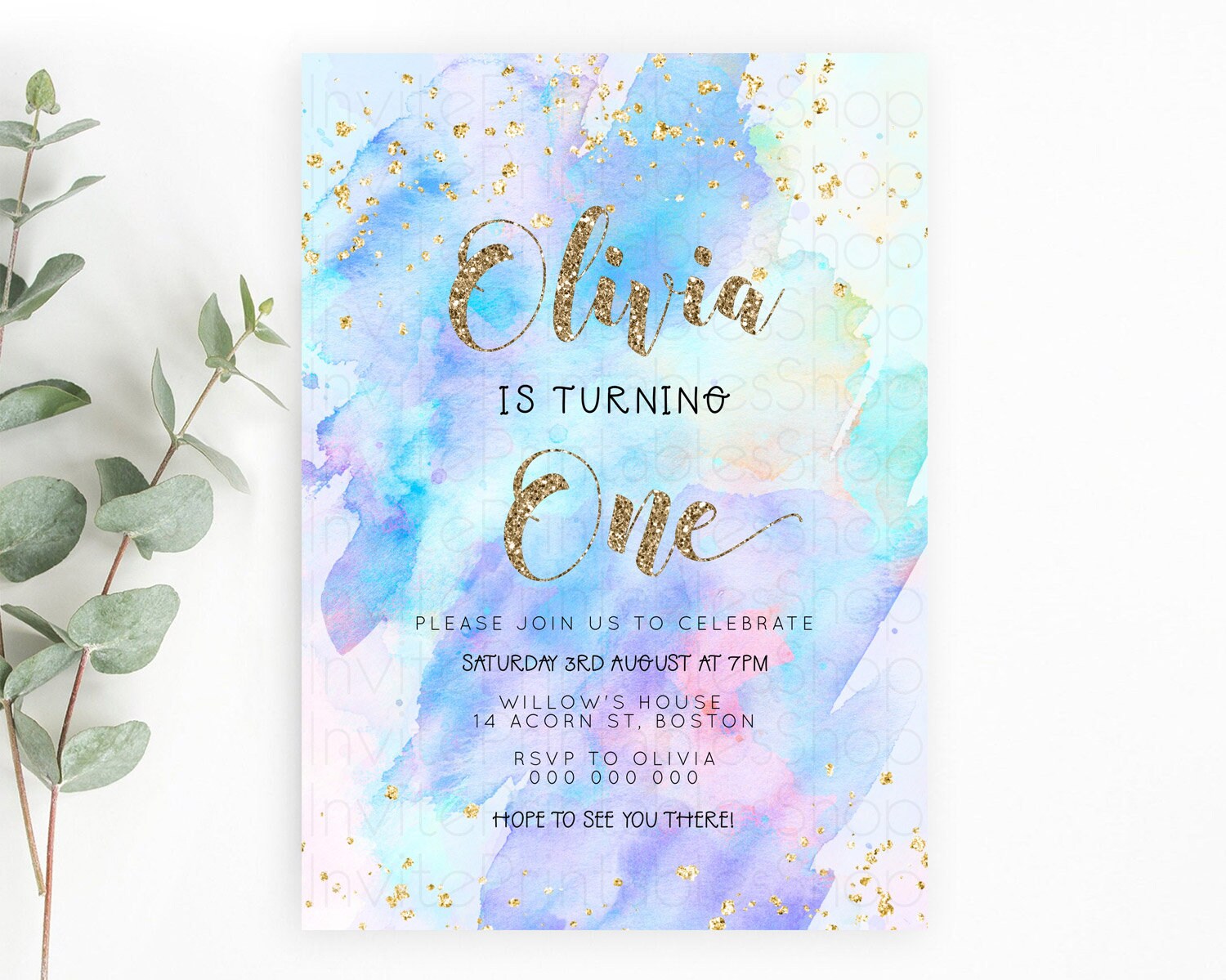 Rainbow Birthday Invitation Colorful Pastel Watercolor Invitation Gold Glitter Sprinkles Ombre Pastel 1st 2nd 3rd Birthday D23292