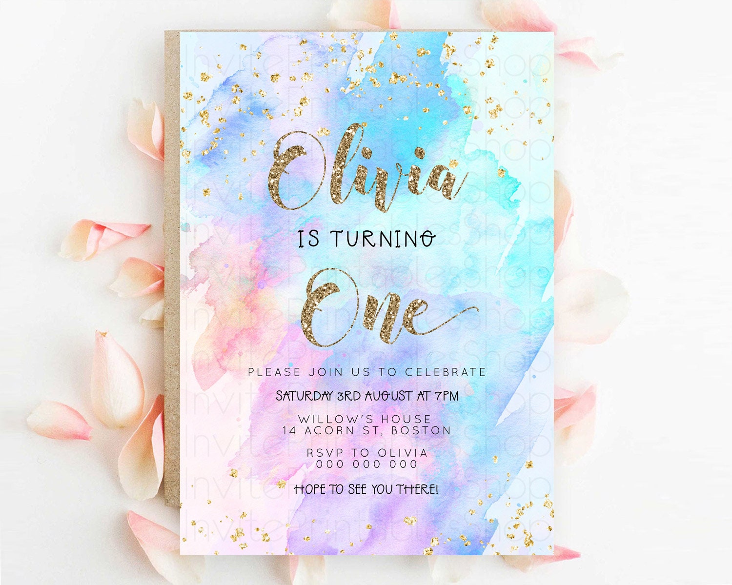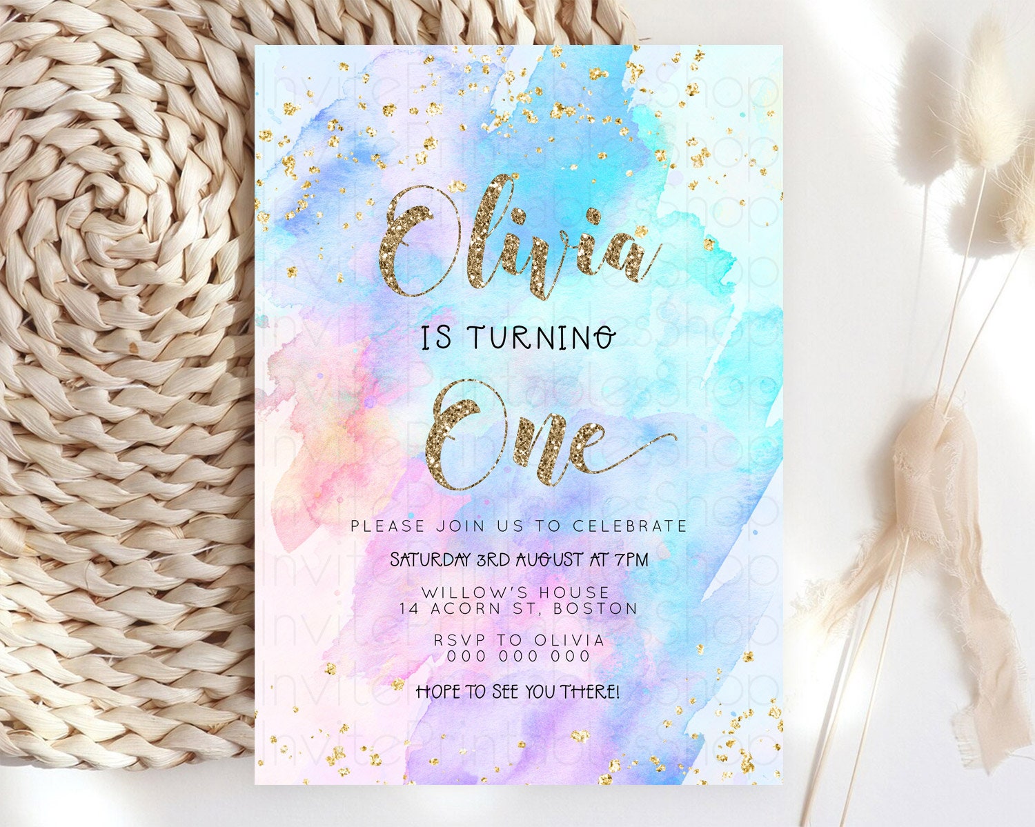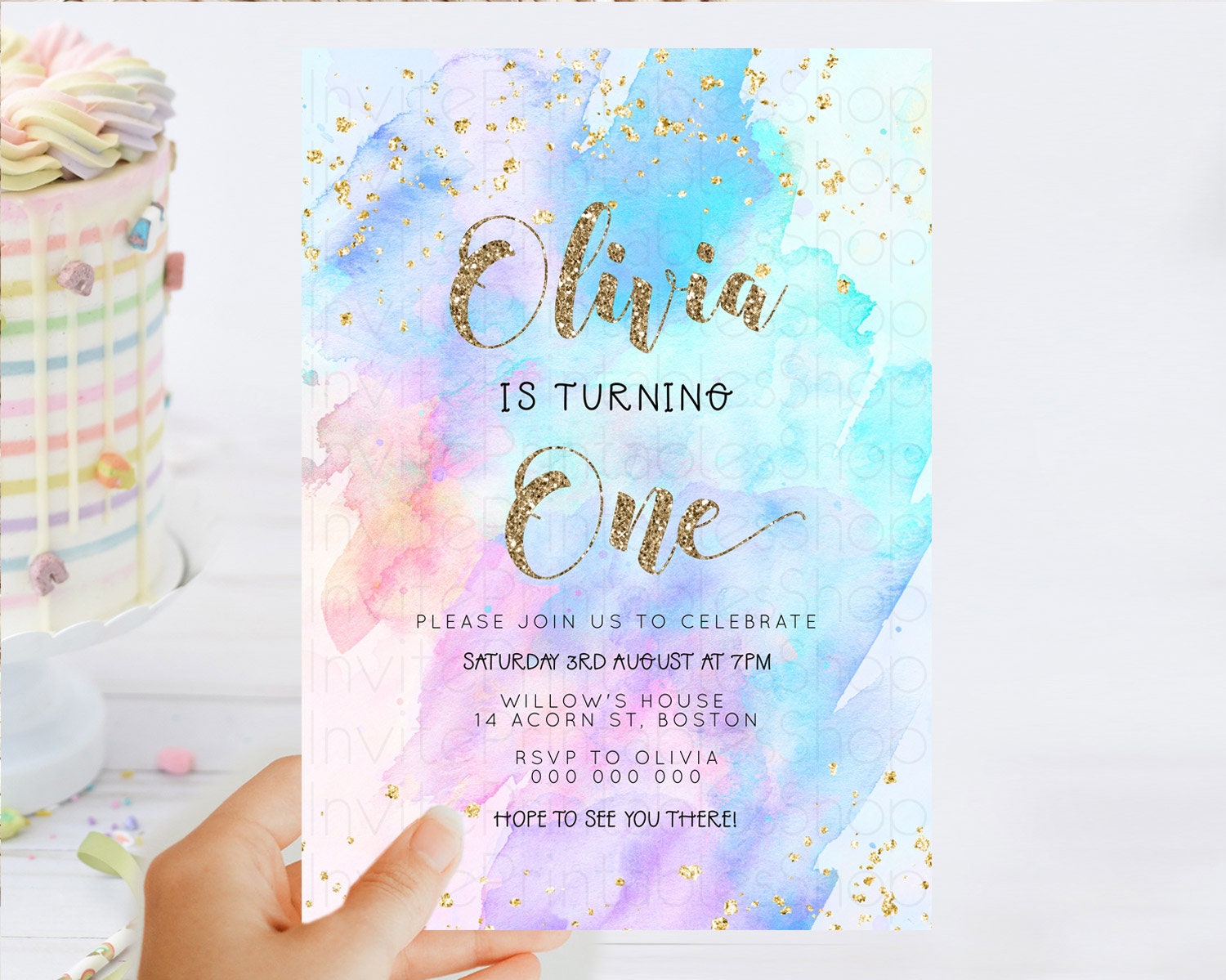 Rainbow Birthday Invitation Colorful Pastel Watercolor Invitation Gold Glitter Sprinkles Ombre Pastel 1st 2nd 3rd Birthday D23293