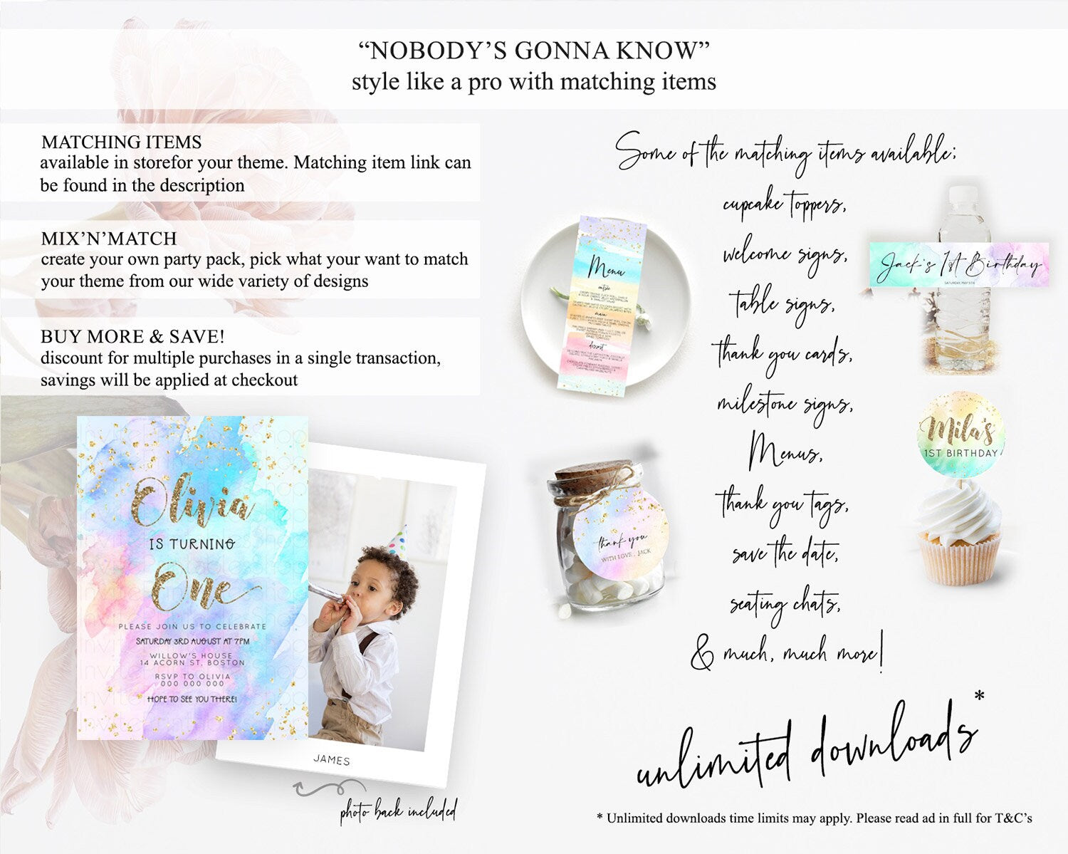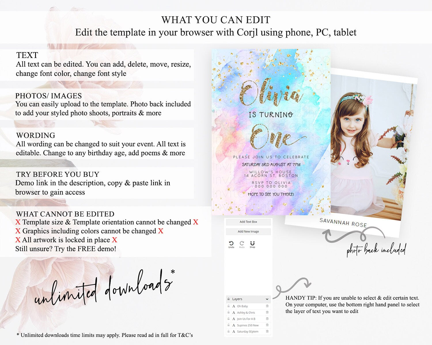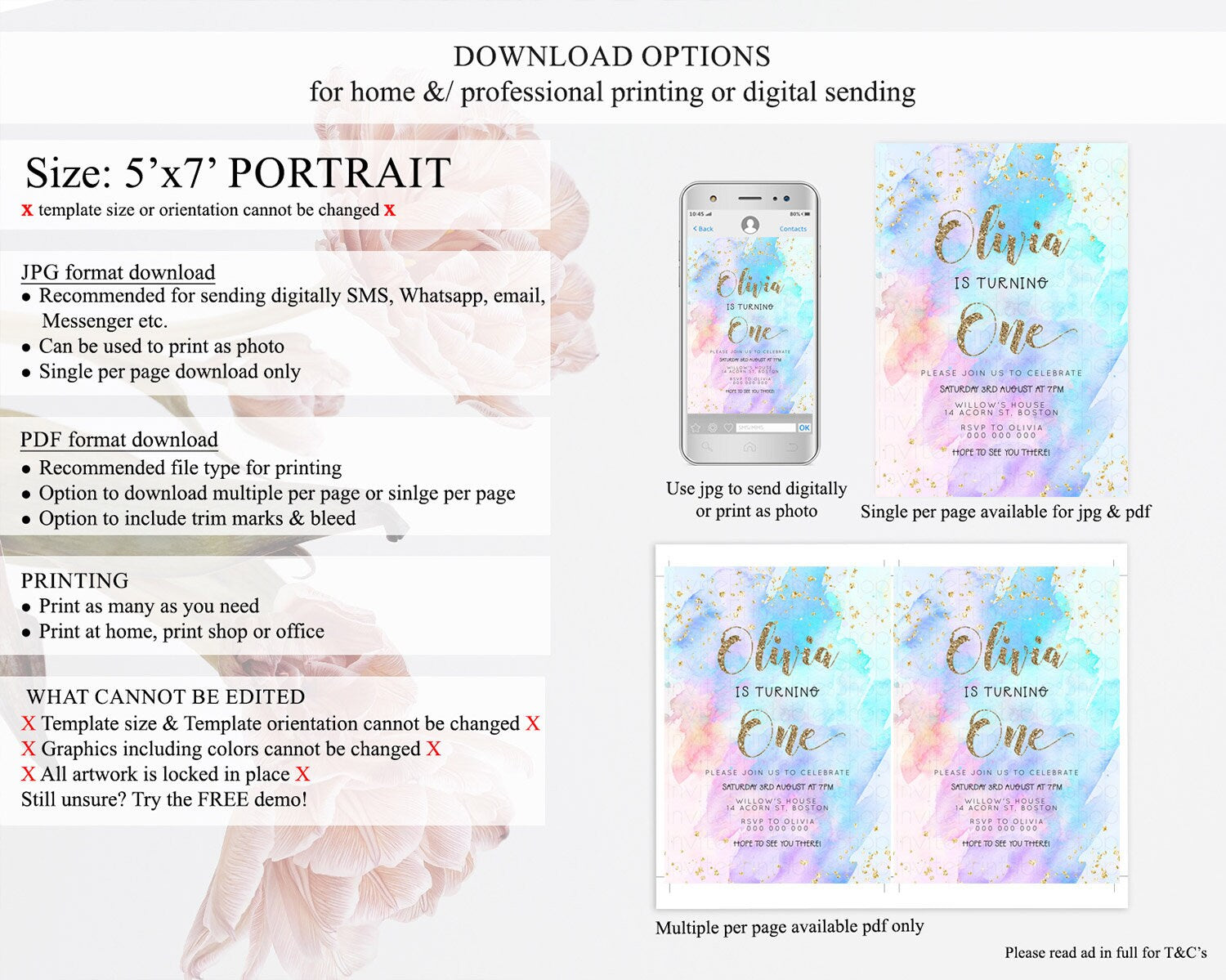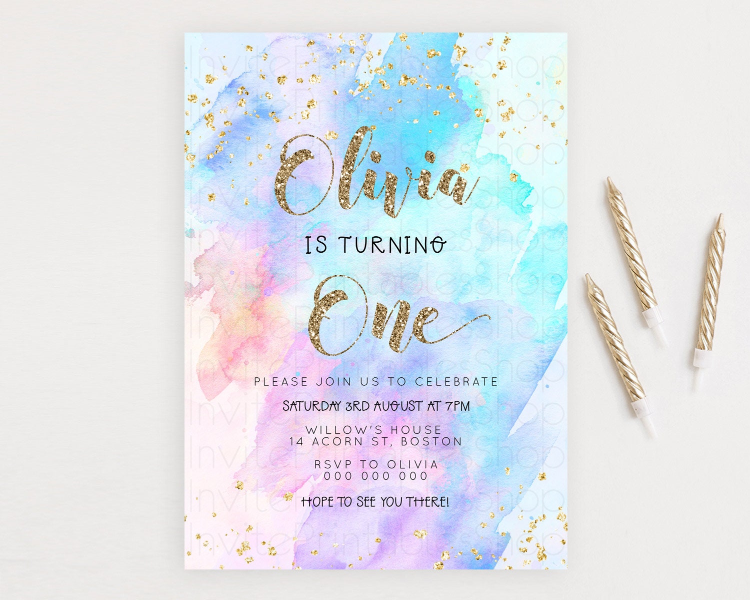 Rainbow Birthday Invitation Colorful Pastel Watercolor Invitation Gold Glitter Sprinkles Ombre Pastel 1st 2nd 3rd Birthday D23293