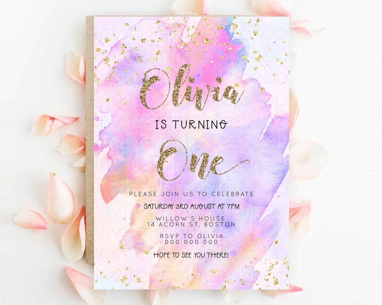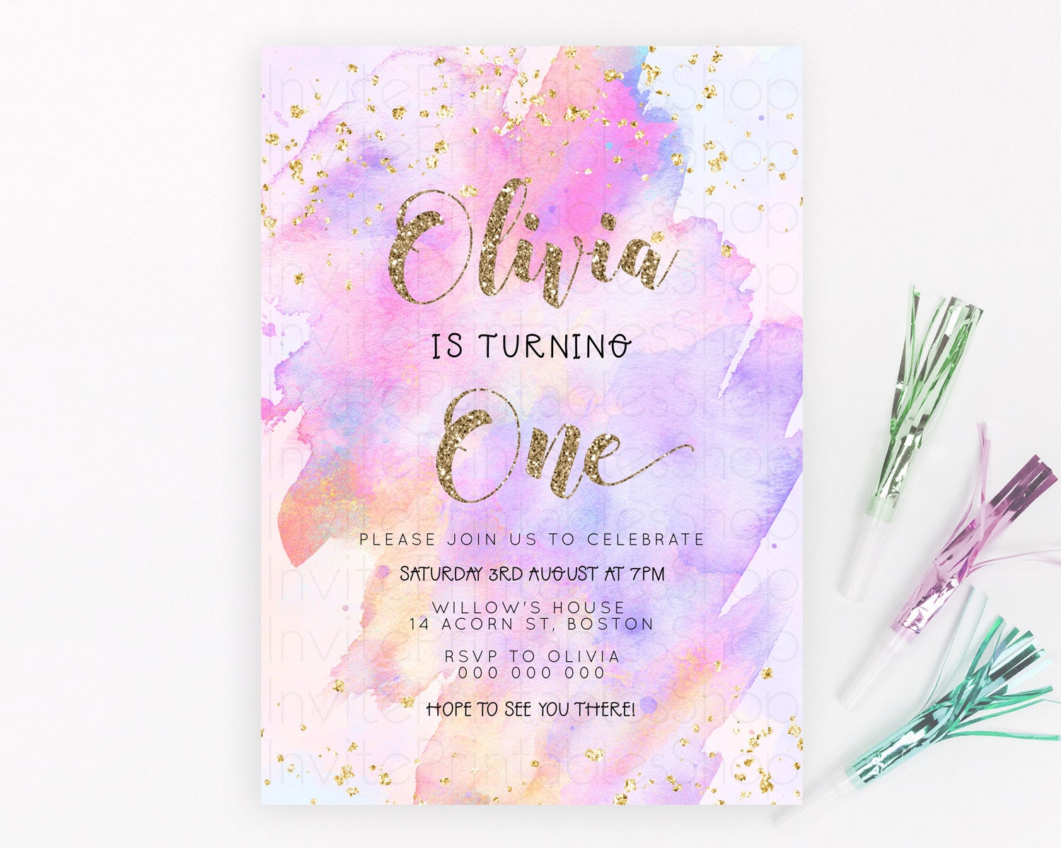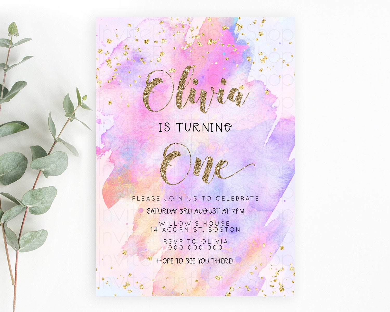 Rainbow Birthday Invitation Colorful Pastel Watercolor Invitation Gold Glitter Sprinkles Ombre Pastel 1st 2nd 3rd Birthday D23298